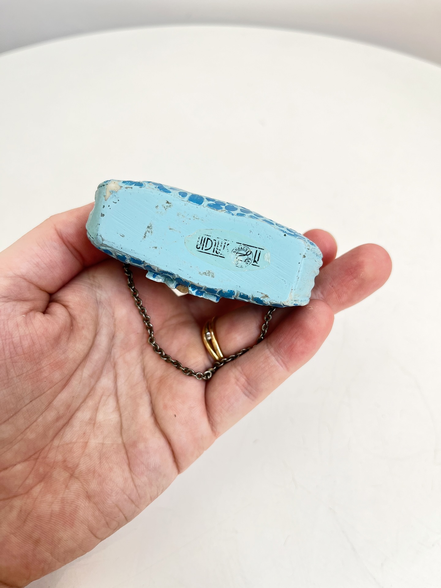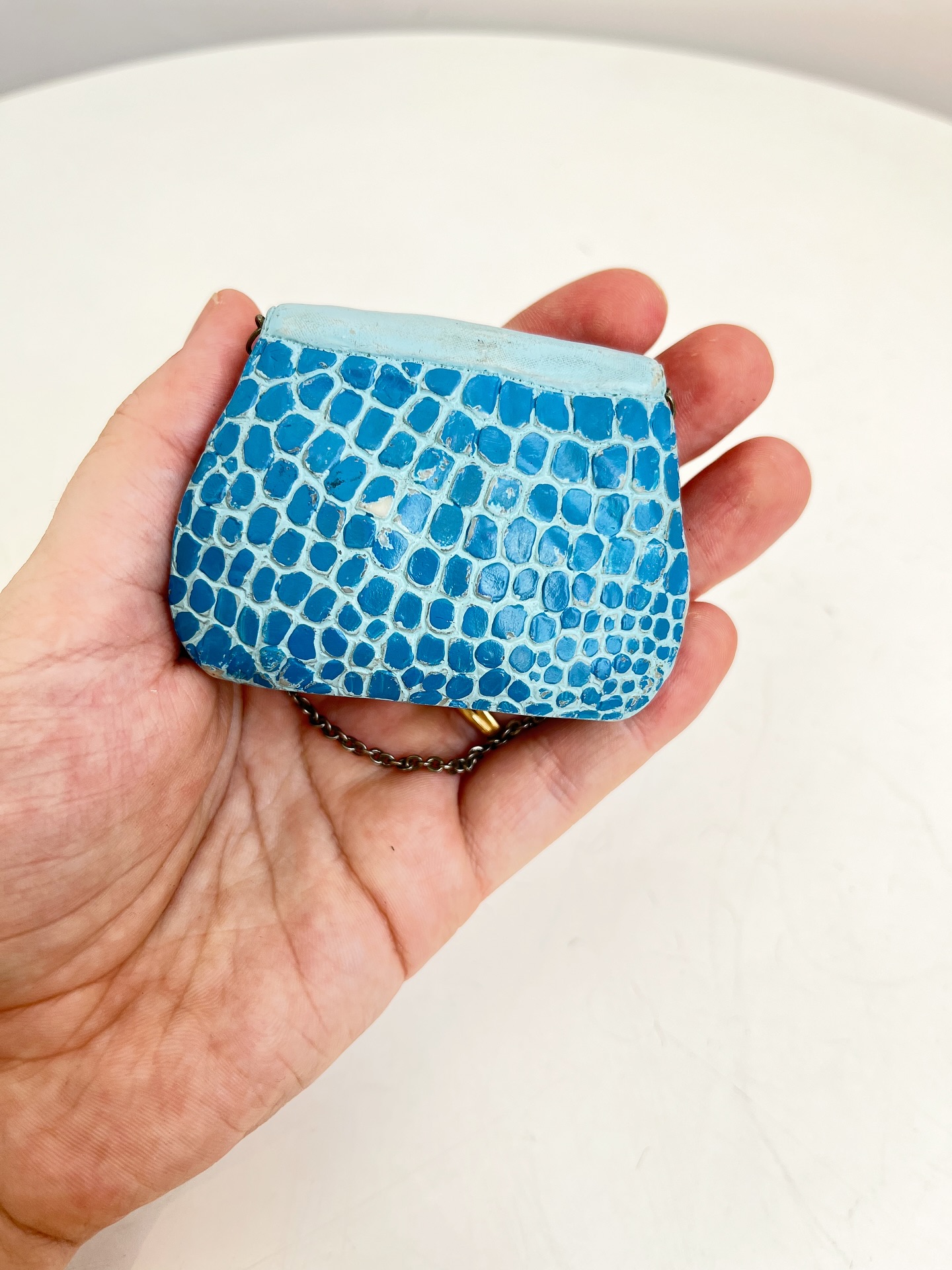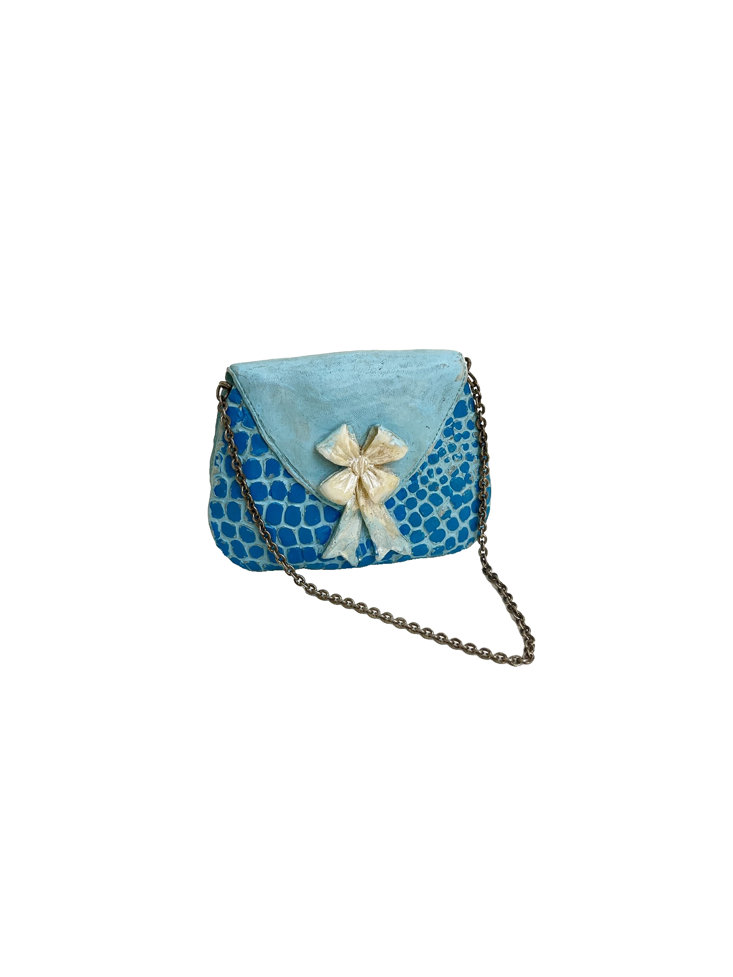Bolsinha colecionável em resina com alça em corrente metálica. Apresenta desgastes na pintura como nas fotos.