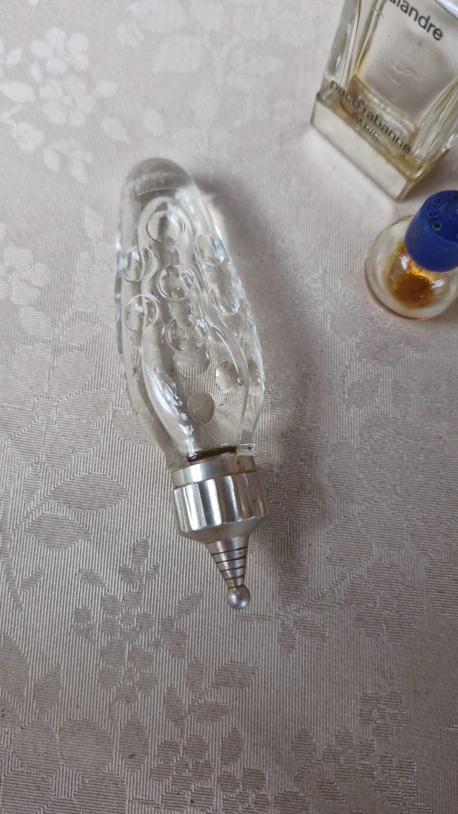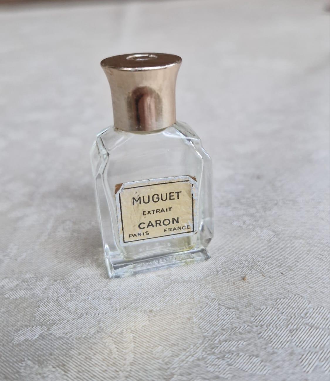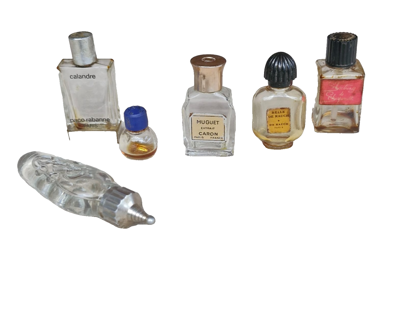 Rara coleção com seis belos mini frascos antigos de perfumes franceses, sendo: Muguet Caron, Shocking Schiaparelli, Caron Poivre, Belle De Rauch, Lanvin, Calandre Paco Rabanne. Com aproximadamente 5cm.