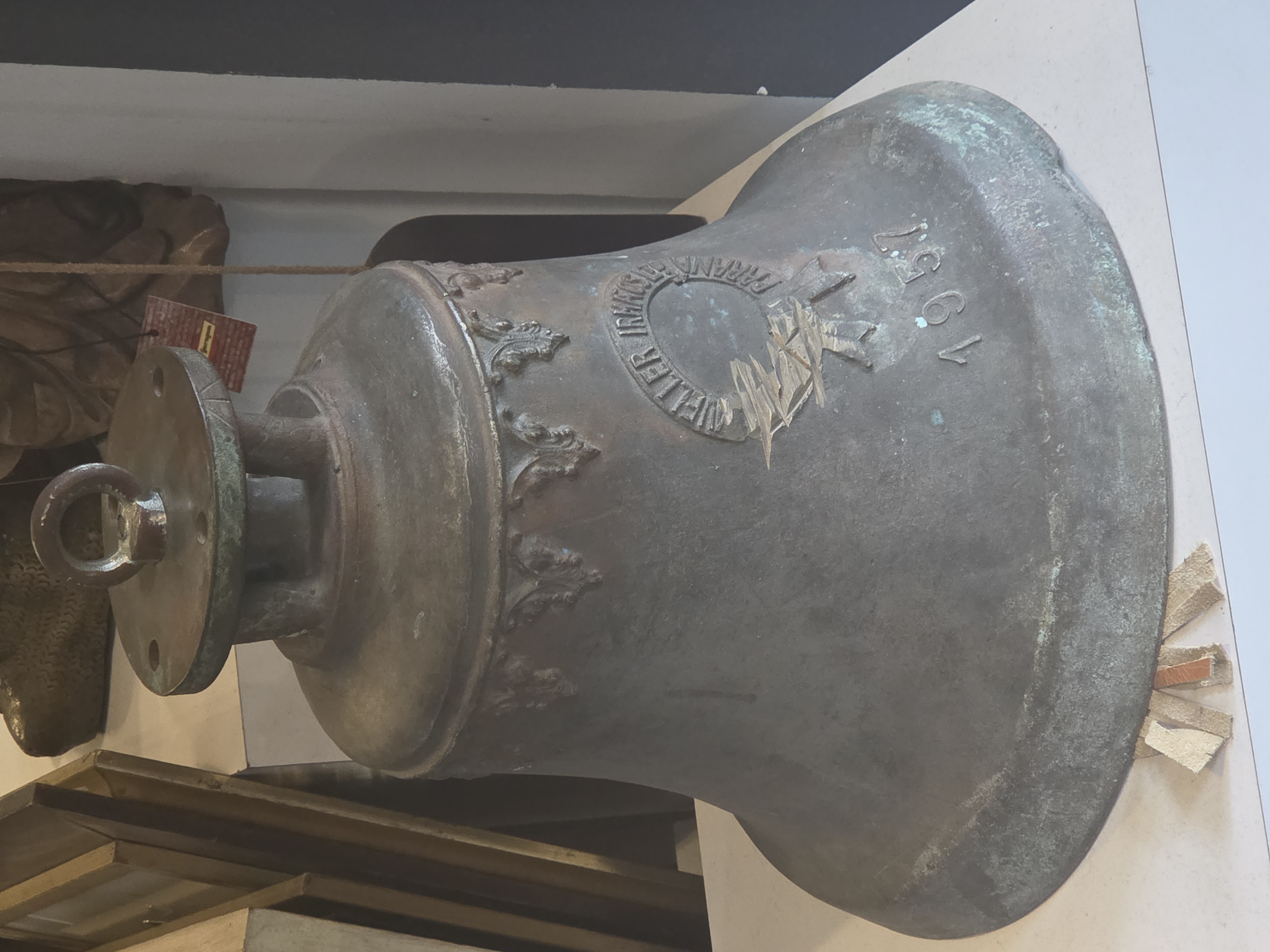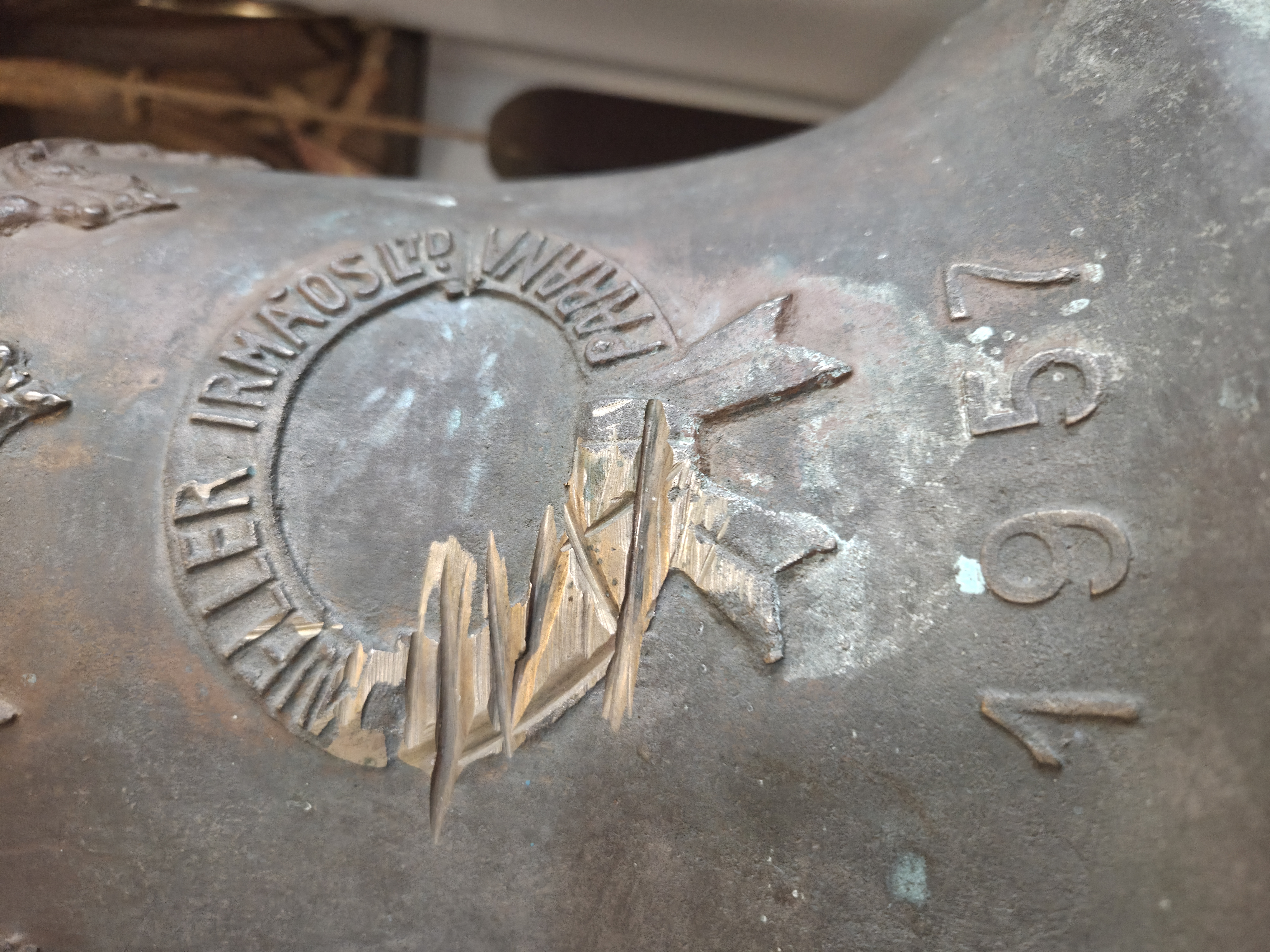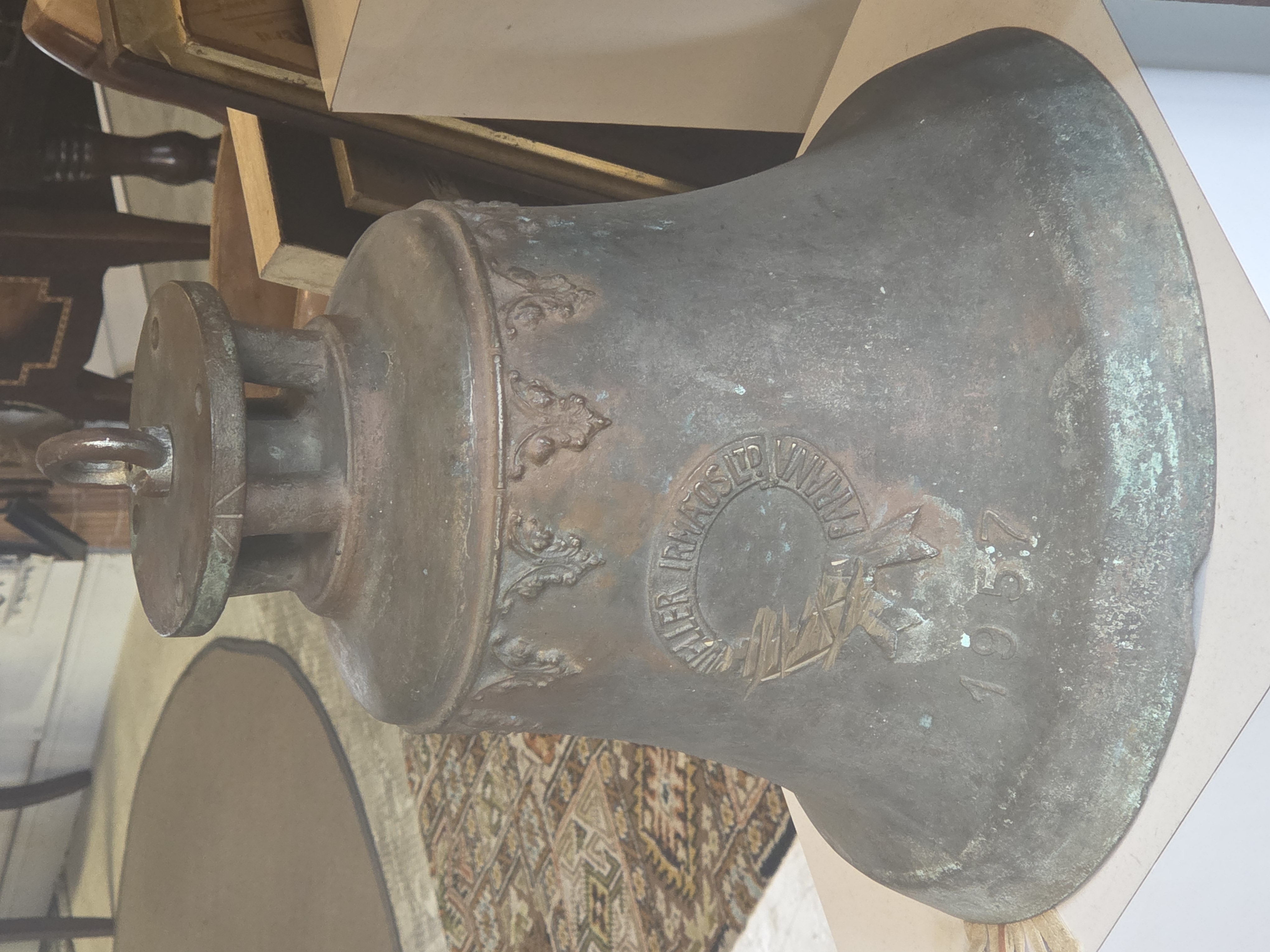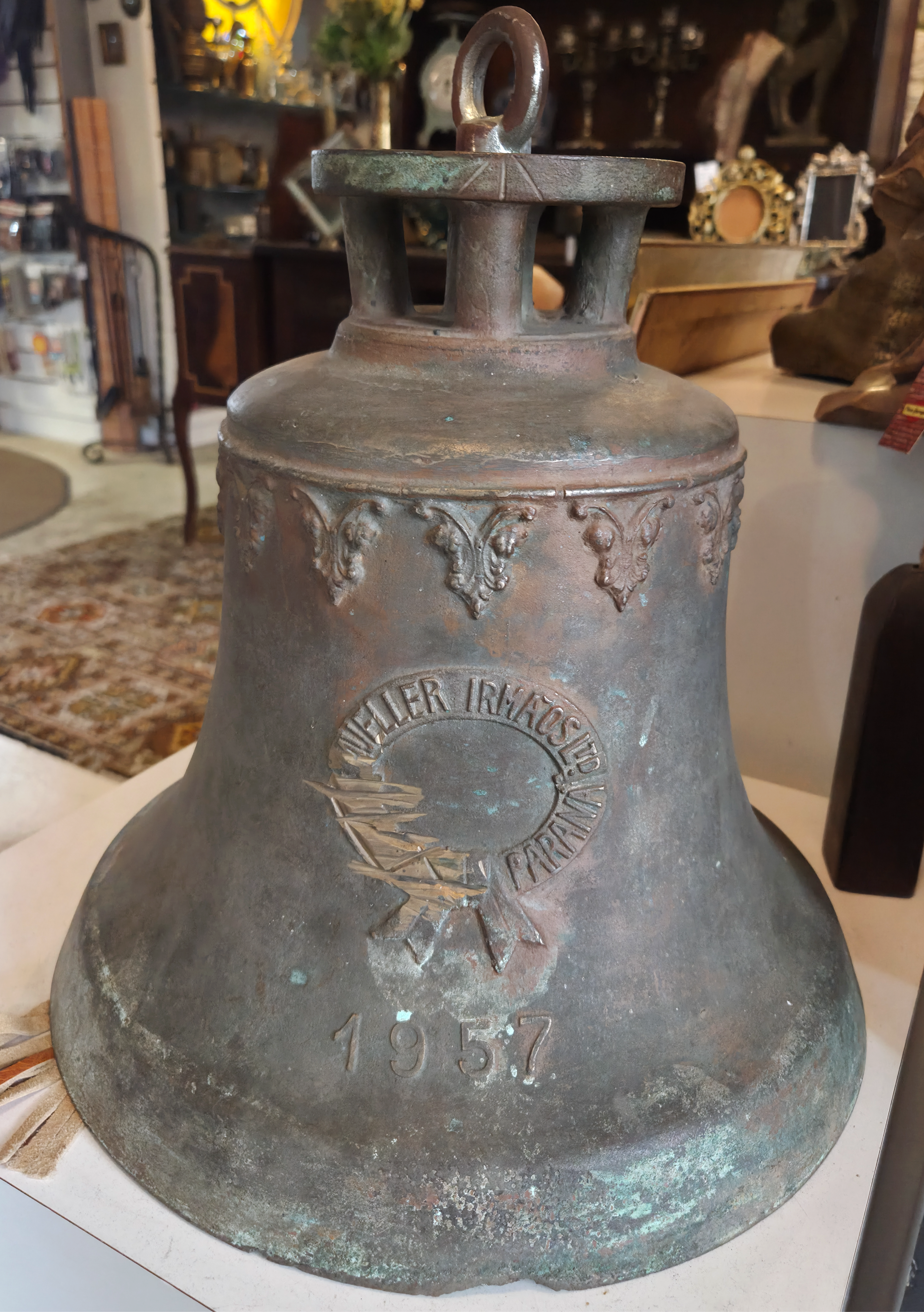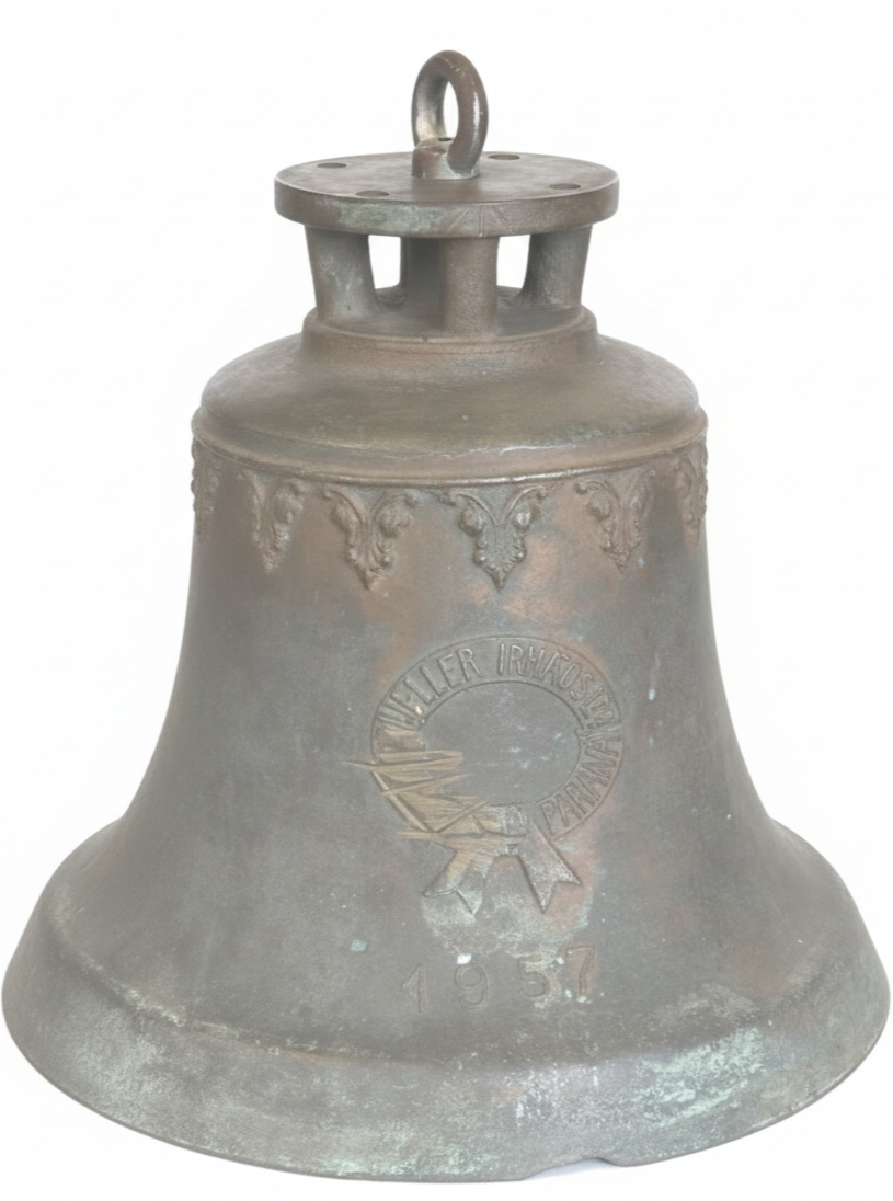 Uma peça autêntica e carregada de história, fabricada pela renomada Mueller Irmãos Ltda, fundição tradicional que marcou a história industrial do Paraná. Este sino, datado de 1957, é um exemplar raro de fundição de alta qualidade da época.