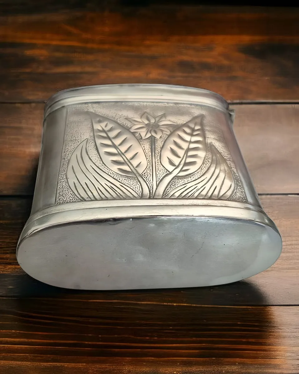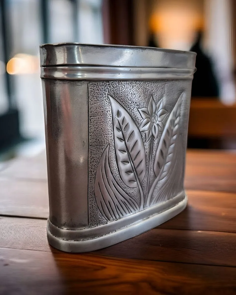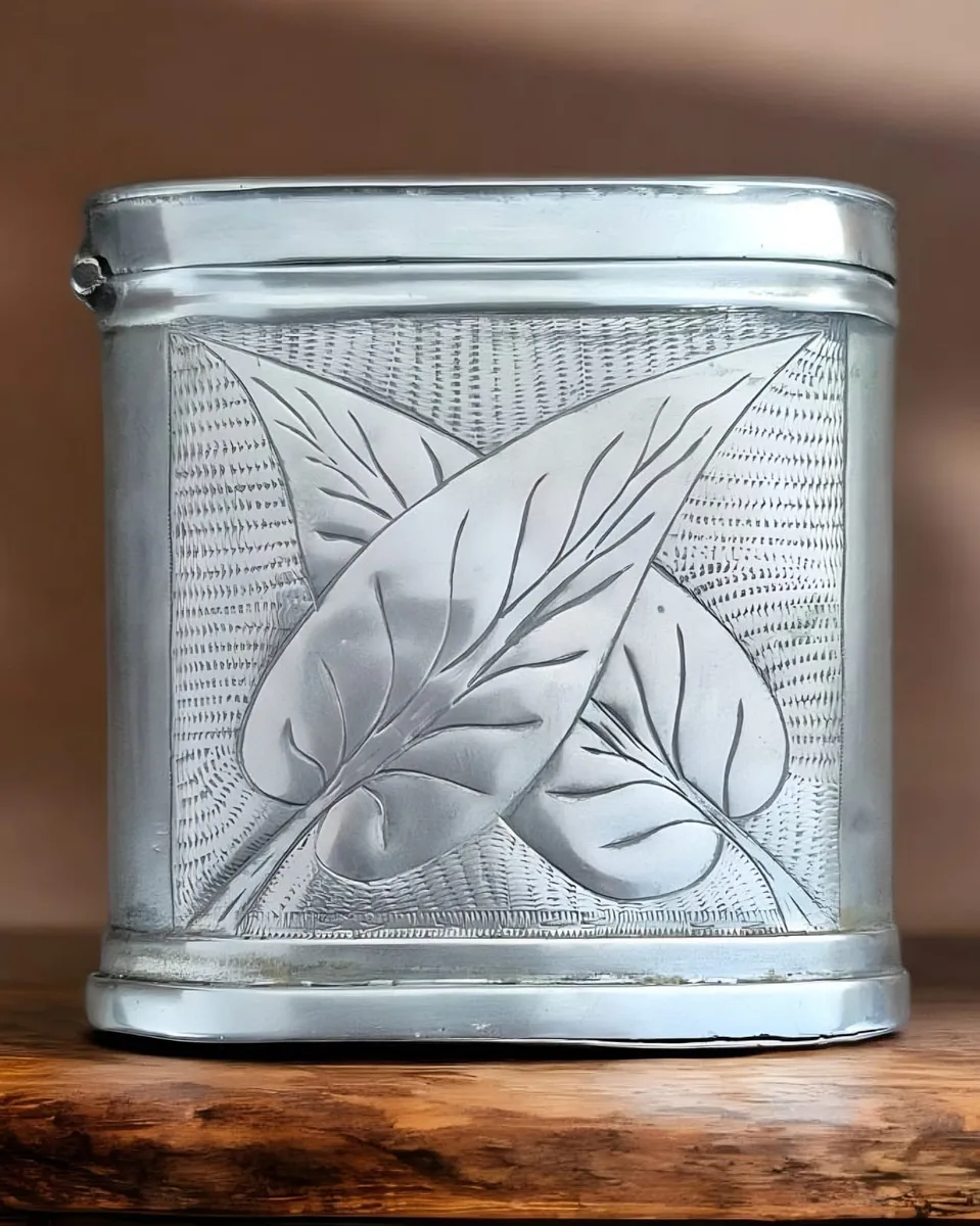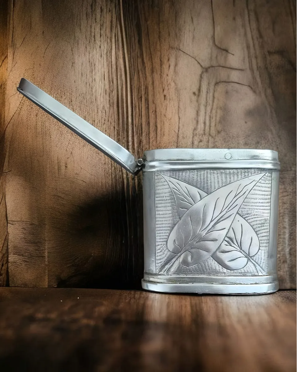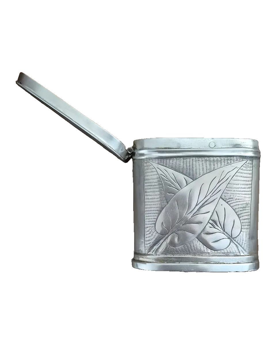 Com ricos detalhes inspirados na folha de tabaco, esta sofisticada caixa de fumo reflete a excelência da ourivesaria colonial brasileira. Influenciada pela opulência do ciclo do ouro e diamantes, a peça alia funcionalidade e ostentação, sendo um símbolo de status entre a elite da época.