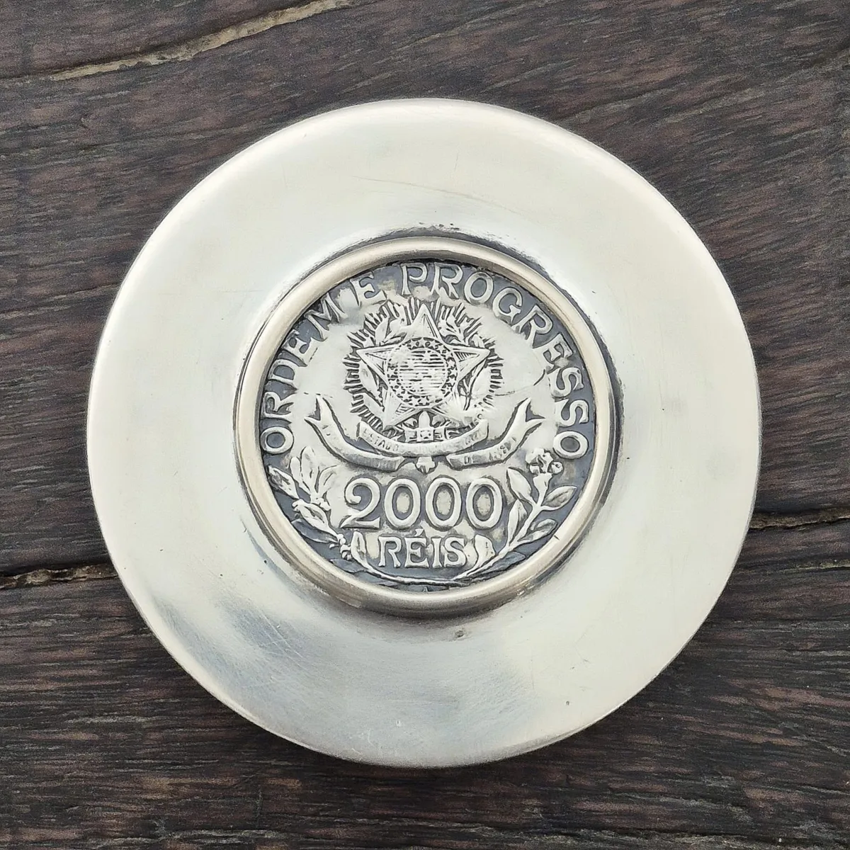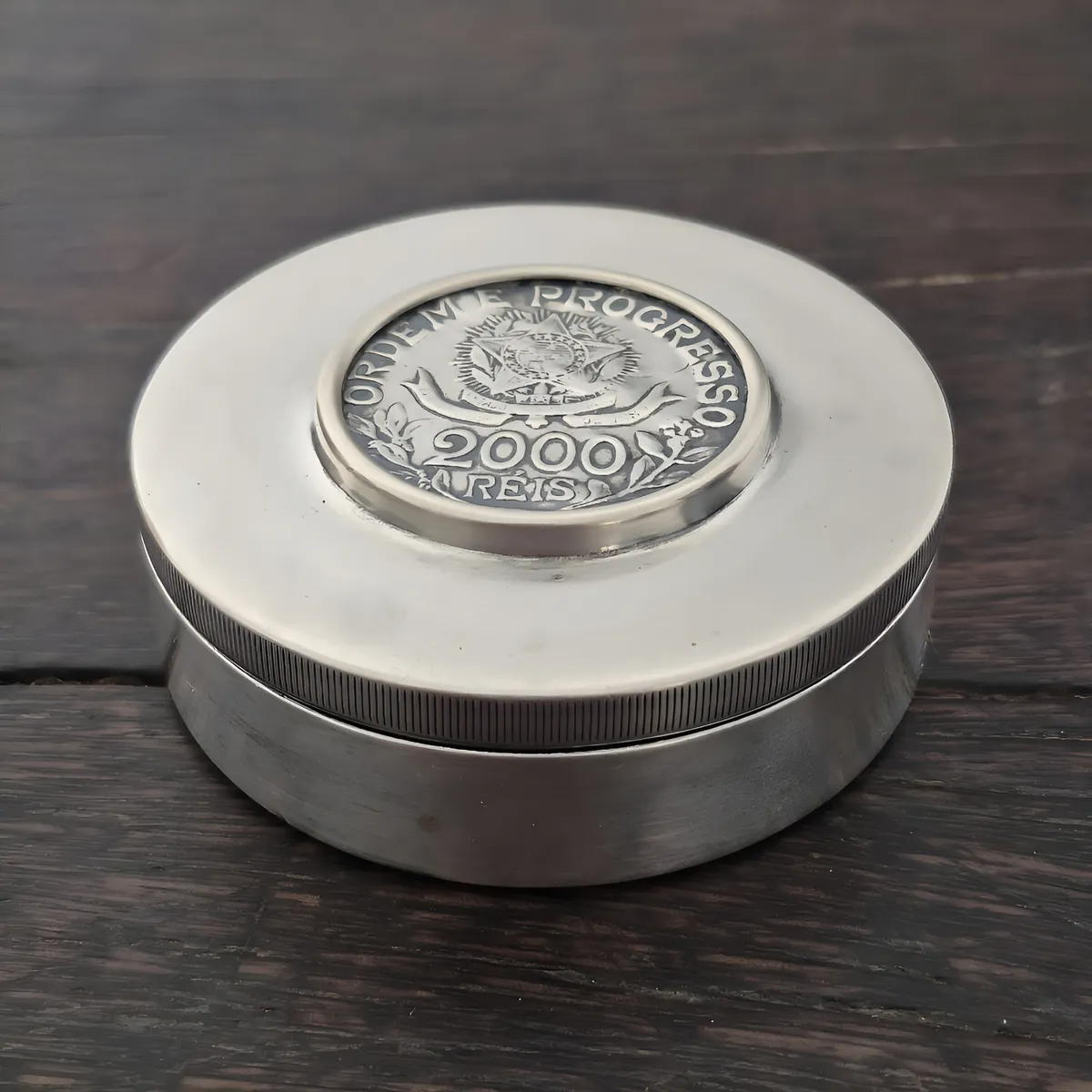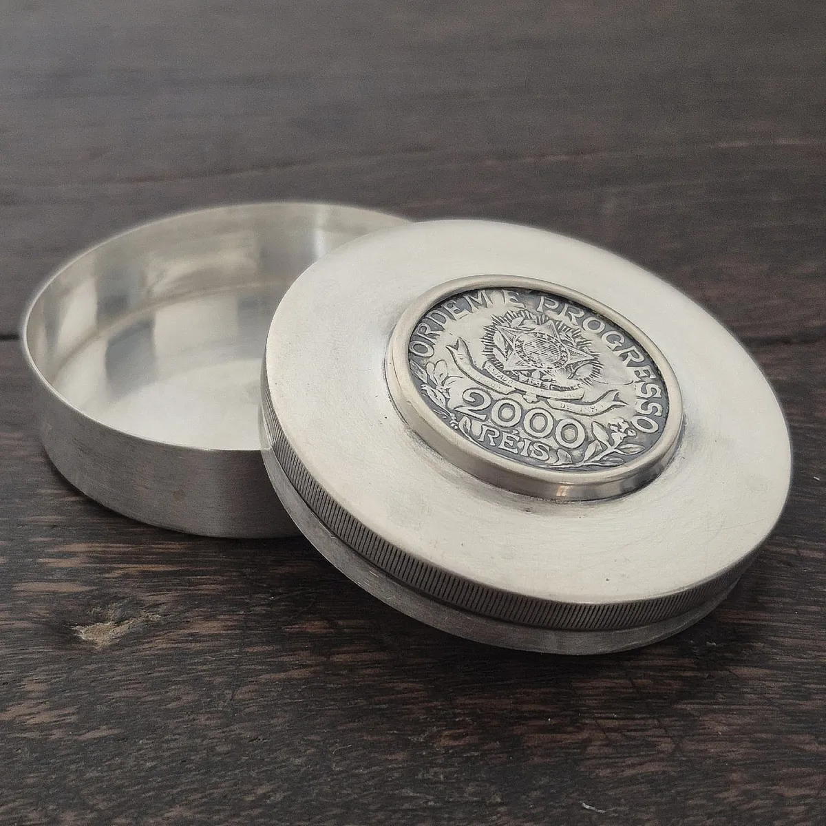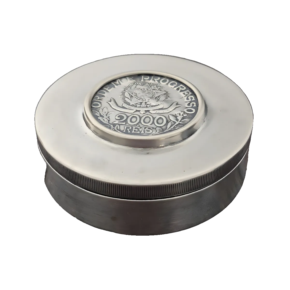 Este porta-rapé, executado em prata teor 800, carrega no centro uma moeda da República Brasileira de 2.000 Réis, cunhada em 1913, momento de um Brasil que se reinventava.