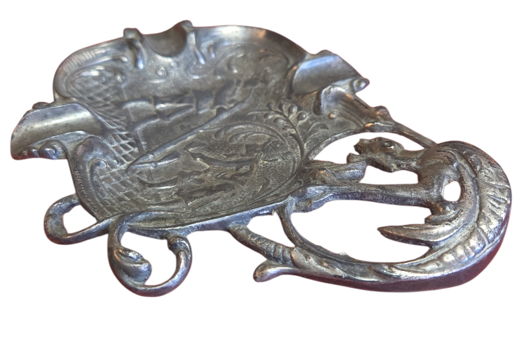 Apresentamos um refinado cinzeiro de coleção, produzido em metal com acabamento oxidado. A peça destaca-se pela sua complexidade artística e formato irregular, fugindo do padrão circular comum.