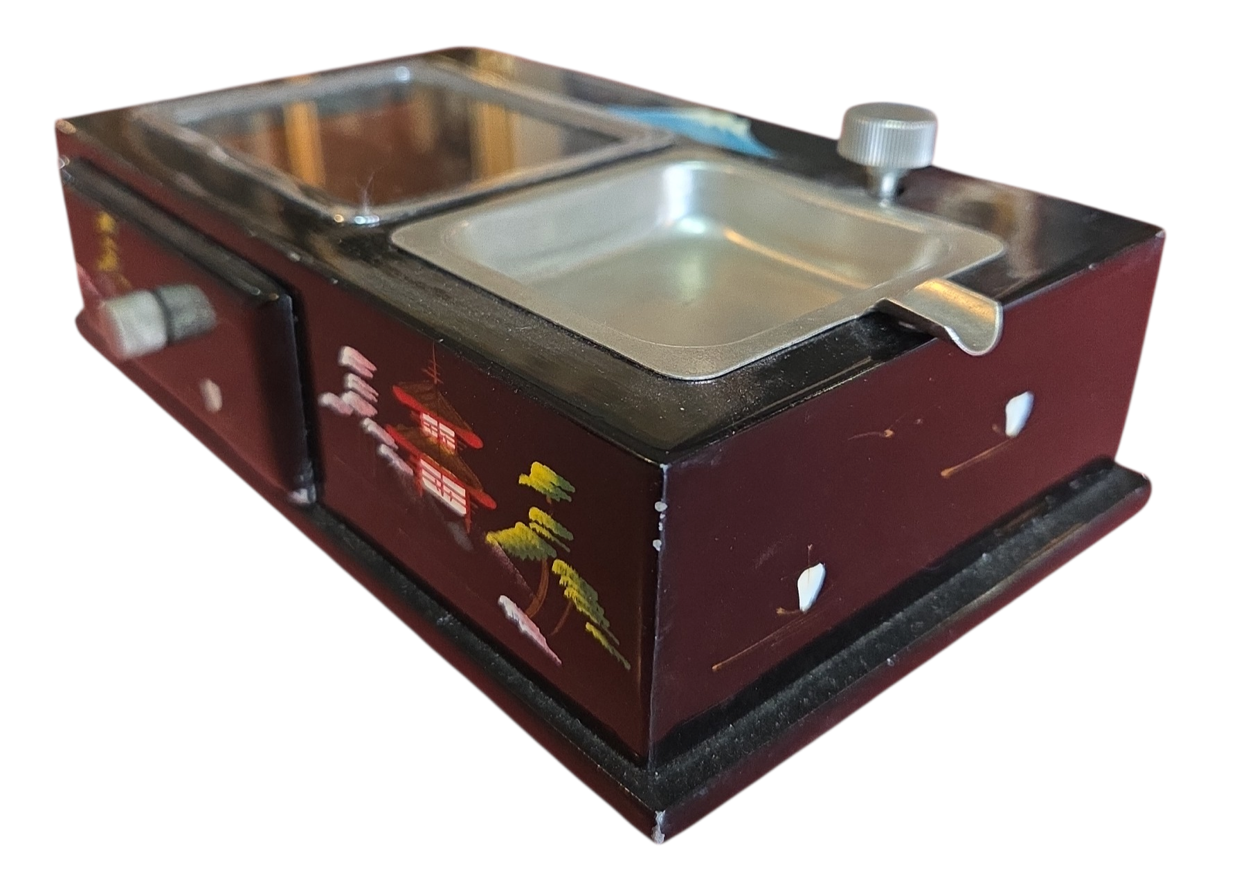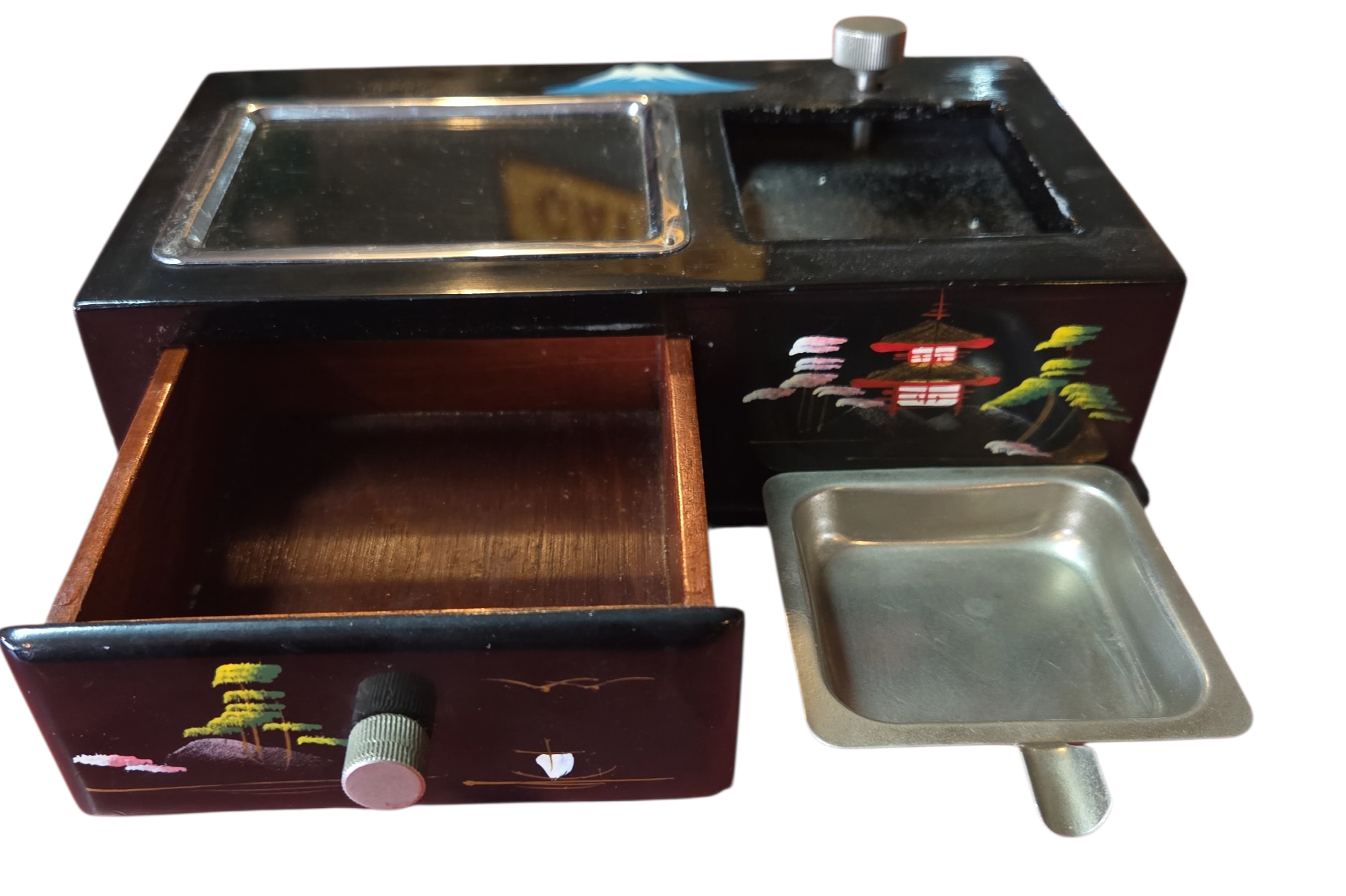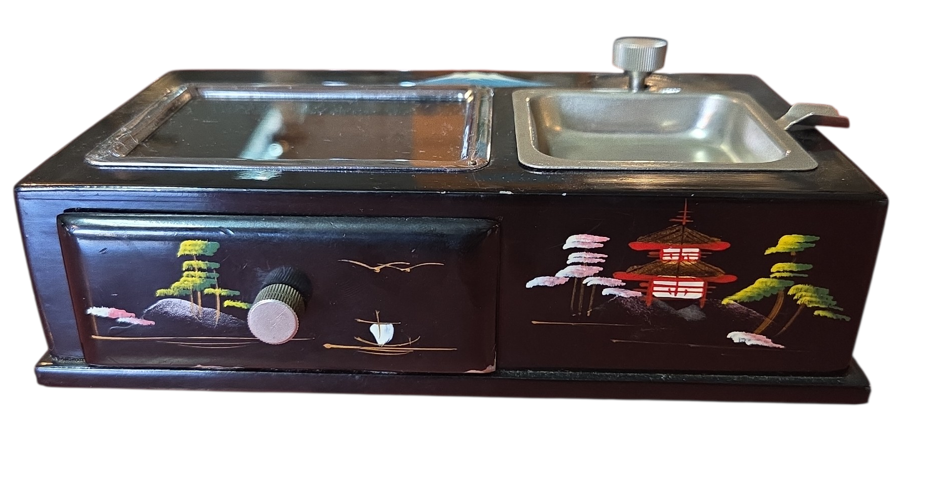 Onde a tradição japonesa encontra a mecânica de precisão. Este conjunto de caixa e cinzeiro não apenas organiza o ambiente, mas o preenche com música e história. Uma peça de conversa indispensável para colecionadores de antiguidades orientais.
