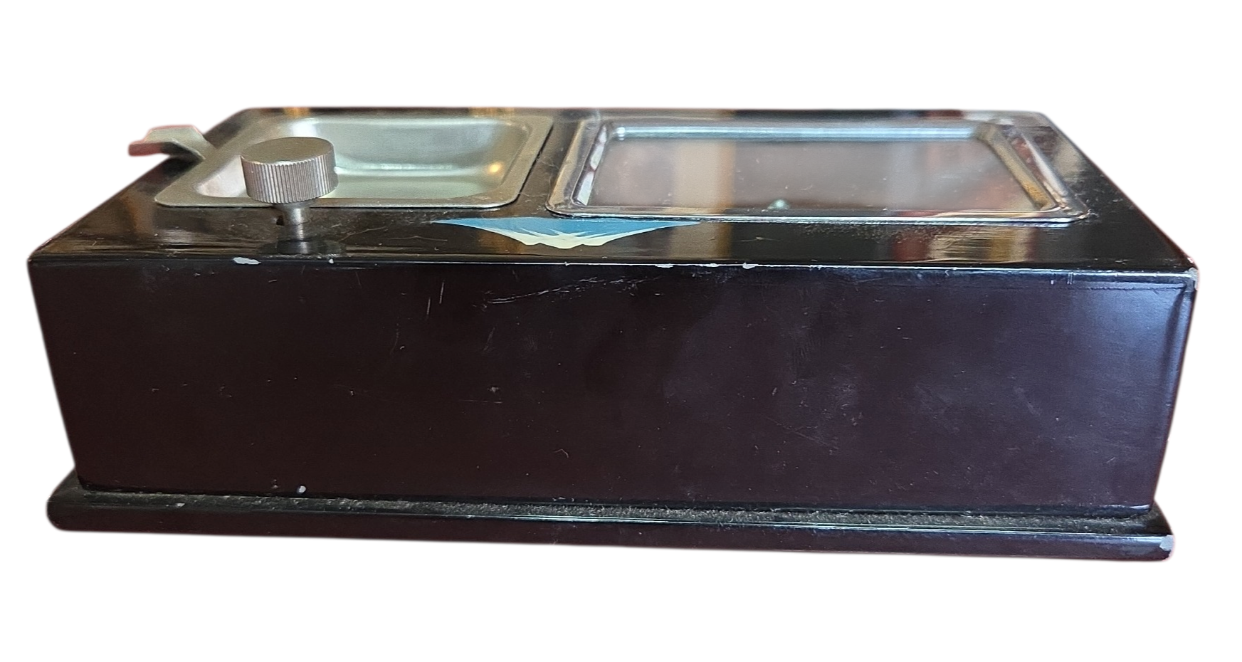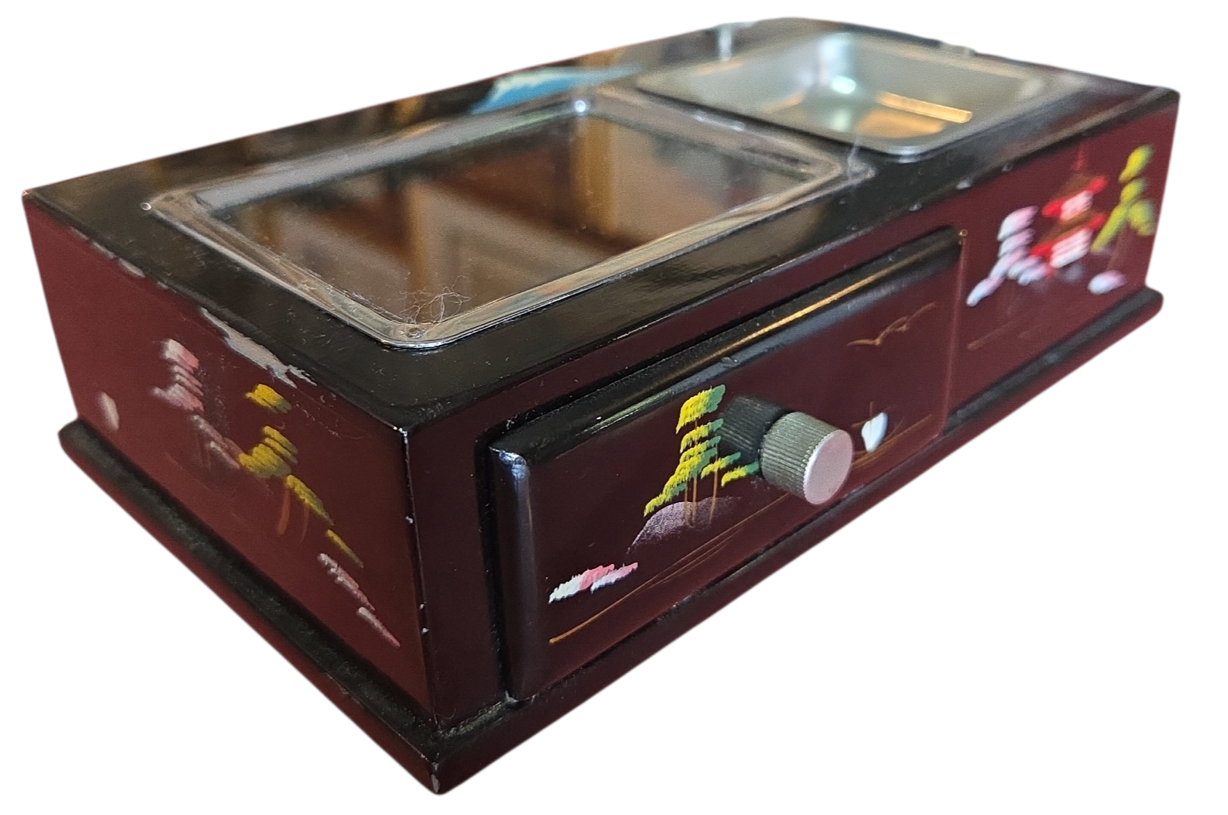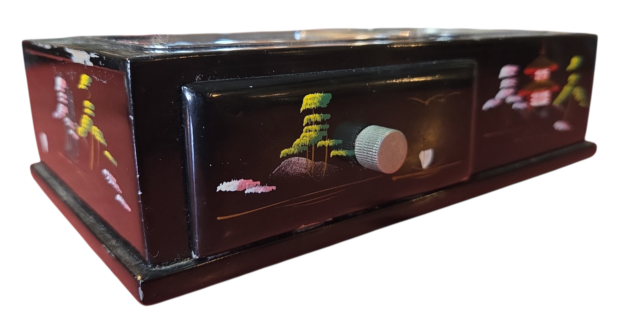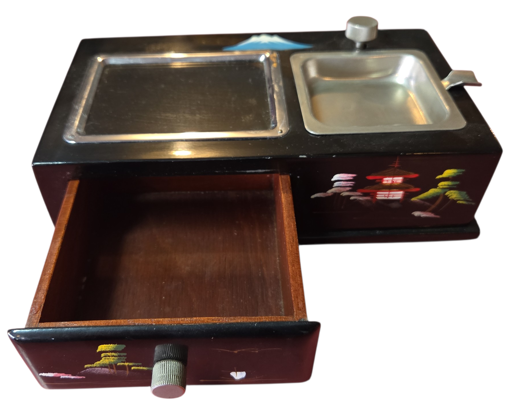 Onde a tradição japonesa encontra a mecânica de precisão. Este conjunto de caixa e cinzeiro não apenas organiza o ambiente, mas o preenche com música e história. Uma peça de conversa indispensável para colecionadores de antiguidades orientais.