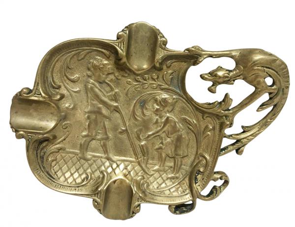 Despojador/cinzeiro em bronze maciço com farta decoração de crianças, pega lateral na figura de leopardo.