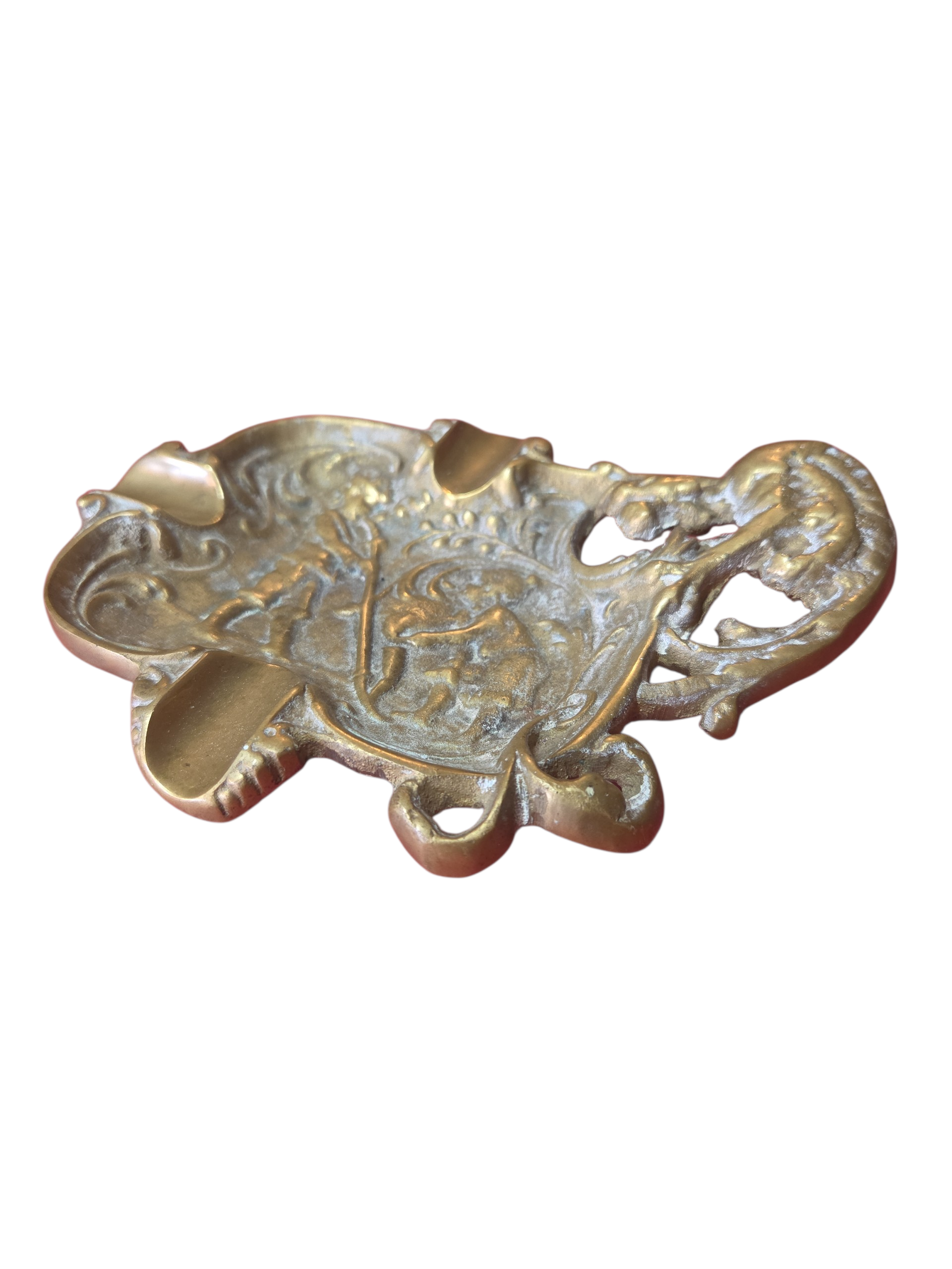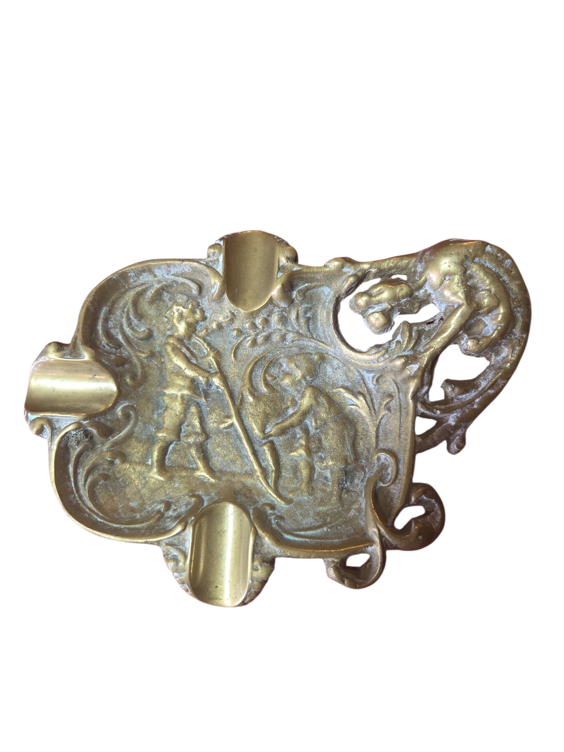 Uma peça de colecionador que transborda história e elegância. Este cinzeiro em bronze maciço apresenta um detalhado trabalho artístico em relevo, retratando figuras clássicas cercadas por ornamentos volutosos. Com uma pátina natural que atesta sua autenticidade, é o item perfeito para decorar escritórios, bibliotecas ou mesas de centro com um toque aristocrático e robusto.