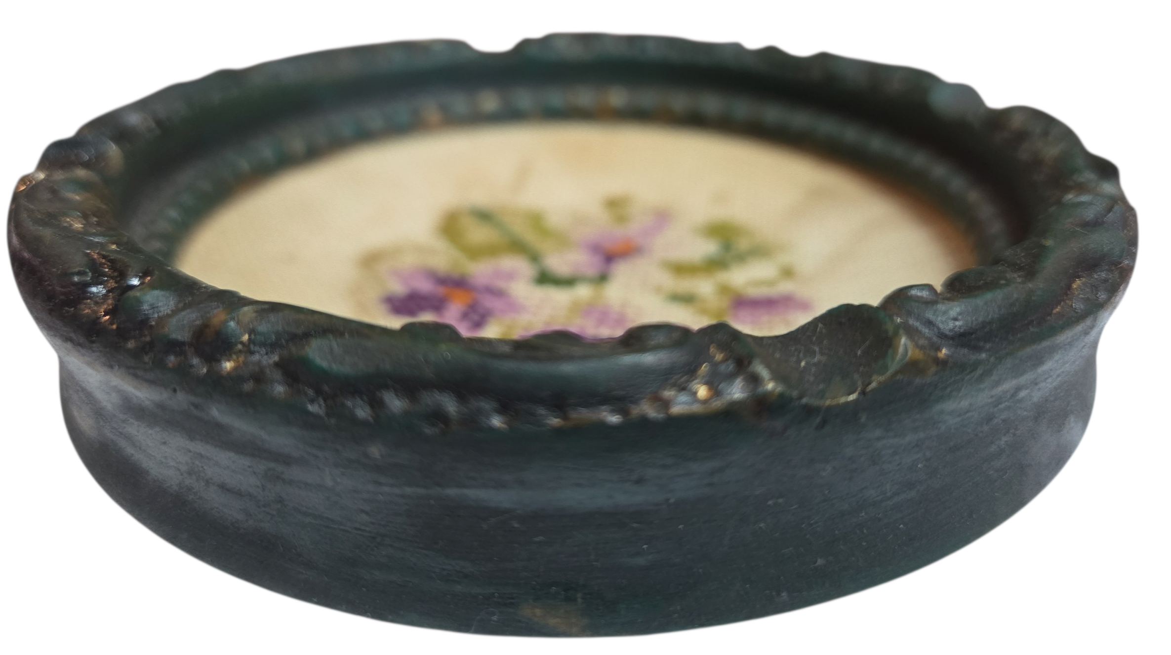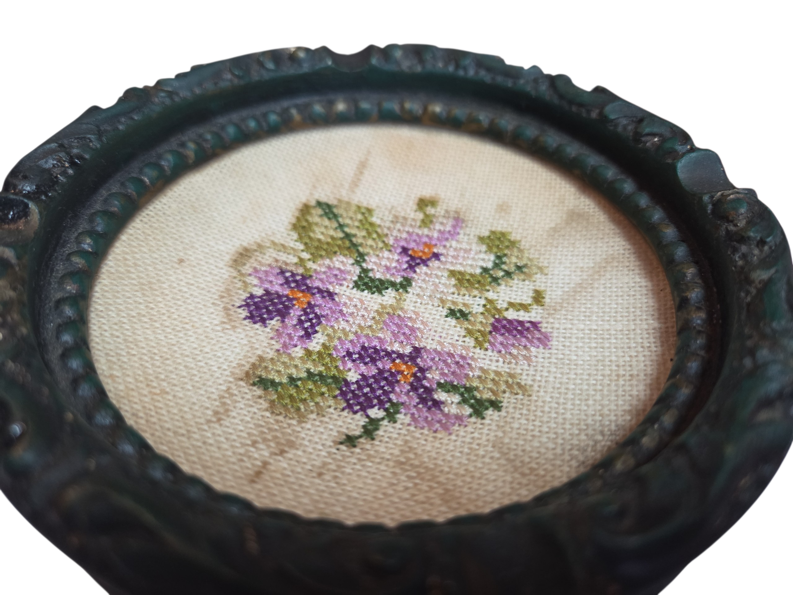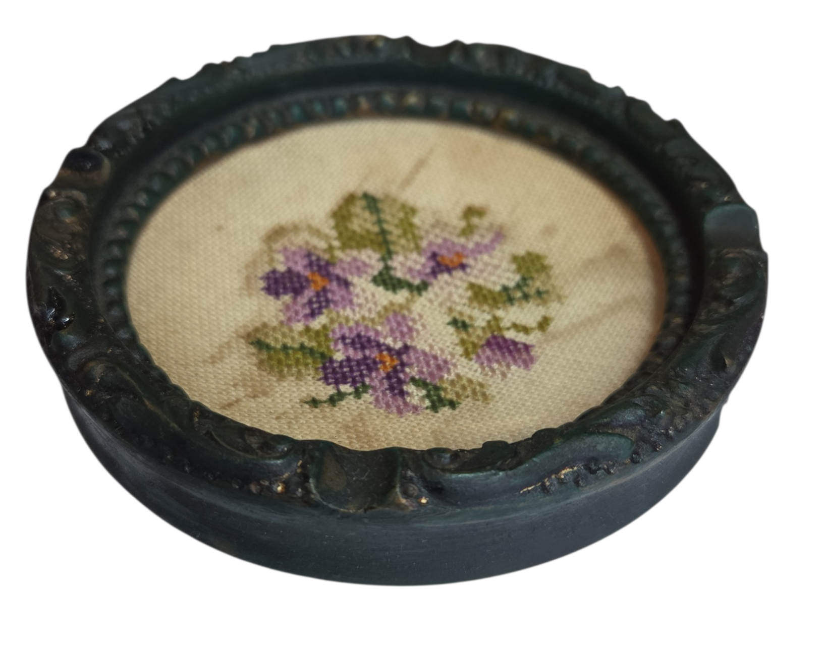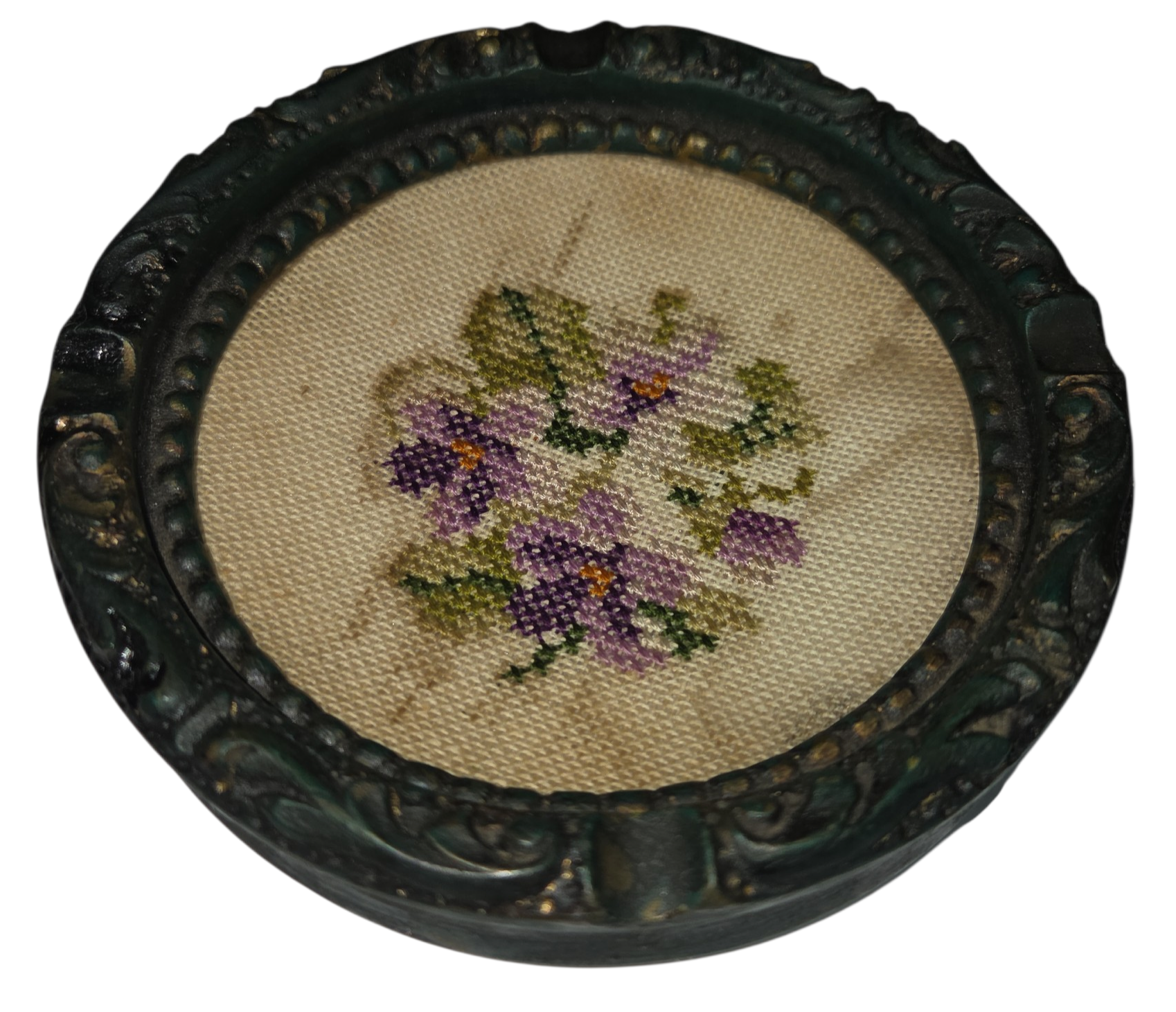 Um tesouro do artesanato clássico. Este cinzeiro único combina a robustez da madeira esculpida com a delicadeza de um medalhão central em ponto cruz (estilo gobelin). A moldura circular apresenta um trabalho de entalhe detalhado com acabamento em pátina escura, emoldurando um bordado floral manual em tons de lavanda e verde. Protegido originalmente por um vidro (ou resina), o fundo bordado transforma uma peça utilitária em uma pequena tela de arte decorativa.