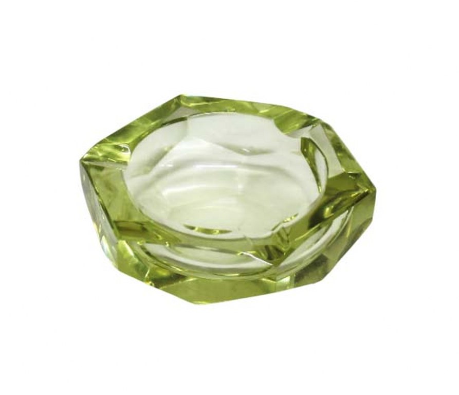 Belo cinzeiro sextavado em cristal facetado na tonalidade amarelo, ao gosto Moser. Apresenta imperceptível bicado.