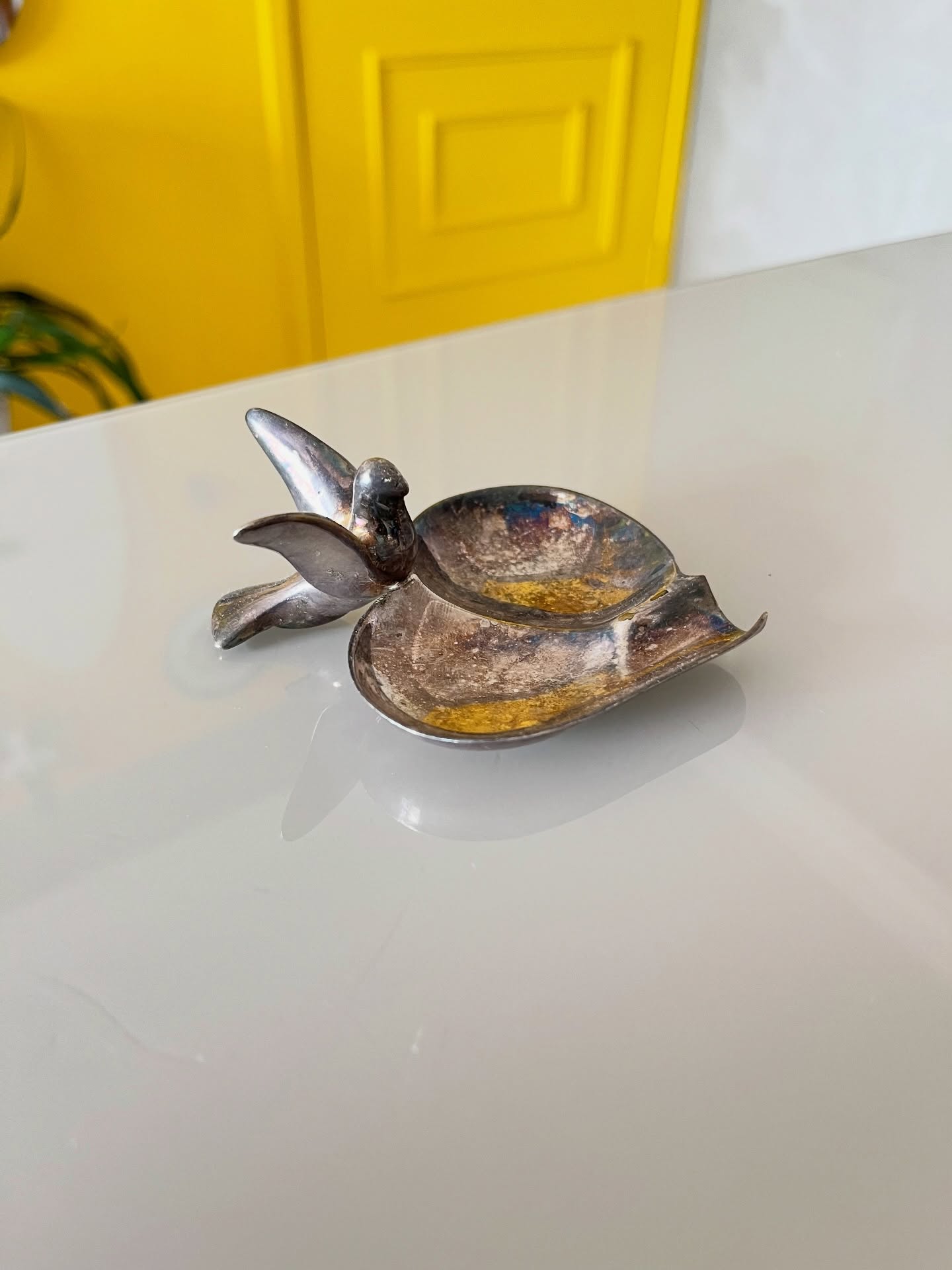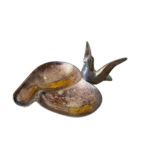 Cinzeiro em metal possivelmente banhado a prata. Apresenta oxidações no banho e leves marcas do tempo e uso como nas fotos.
