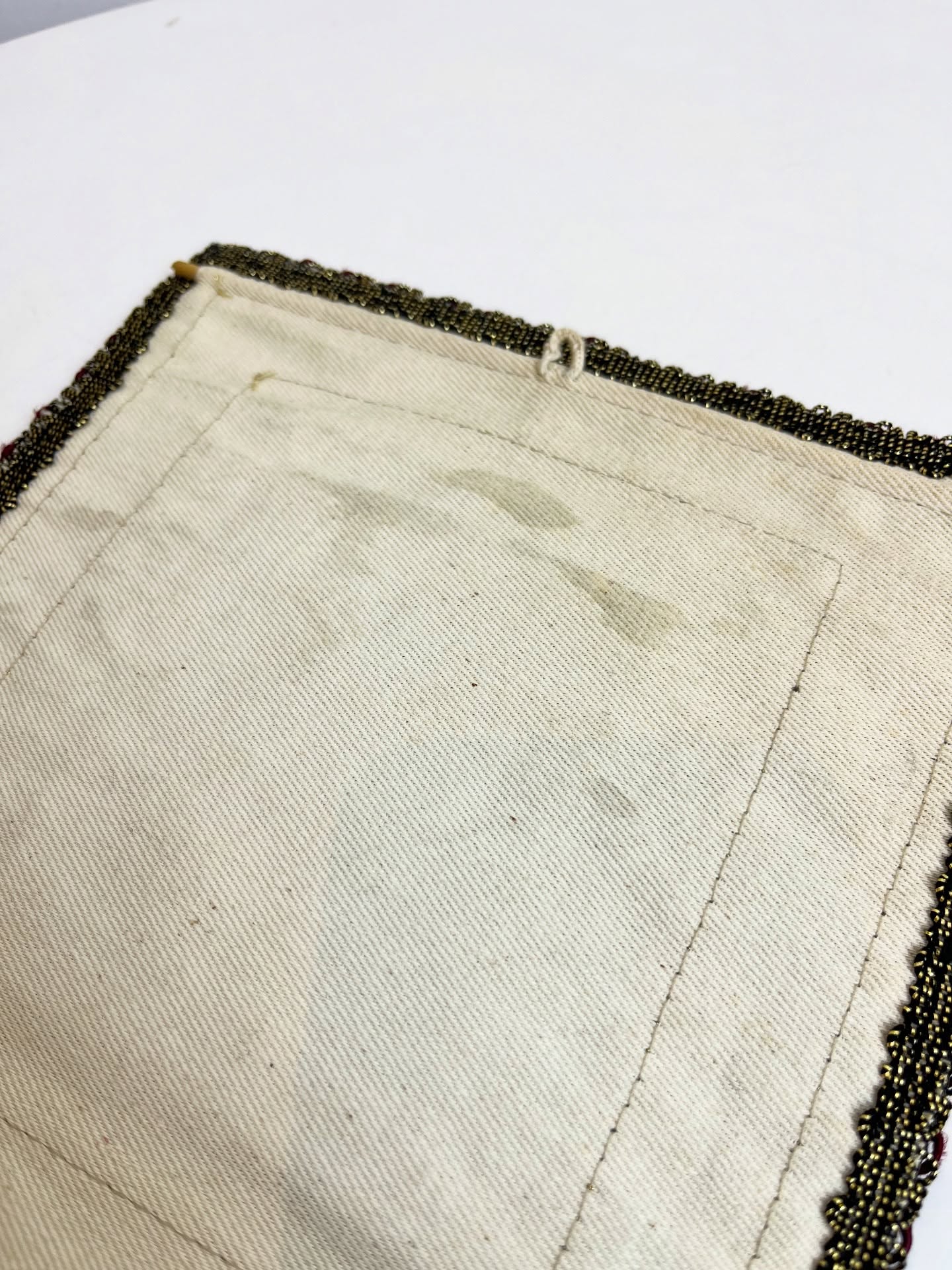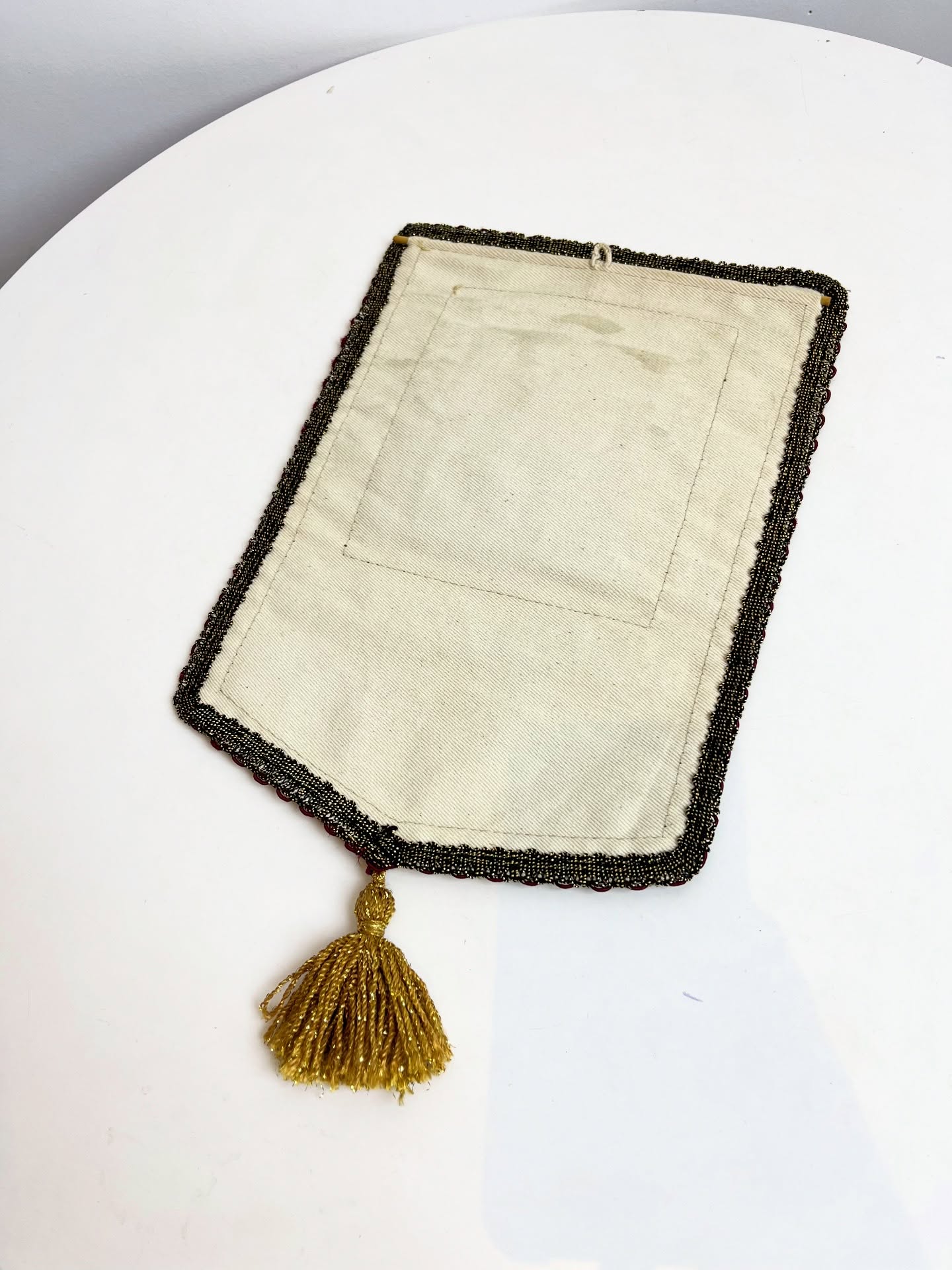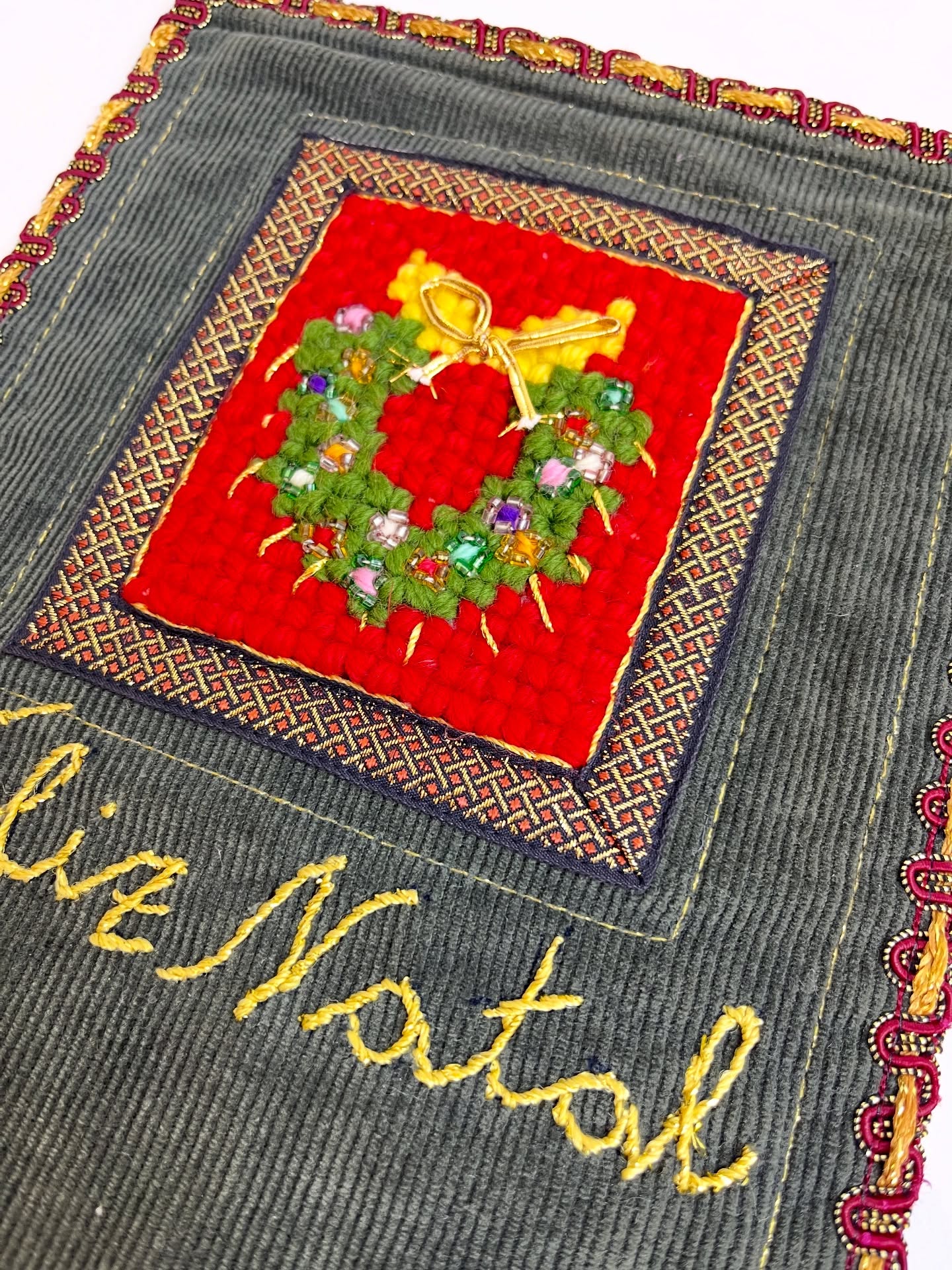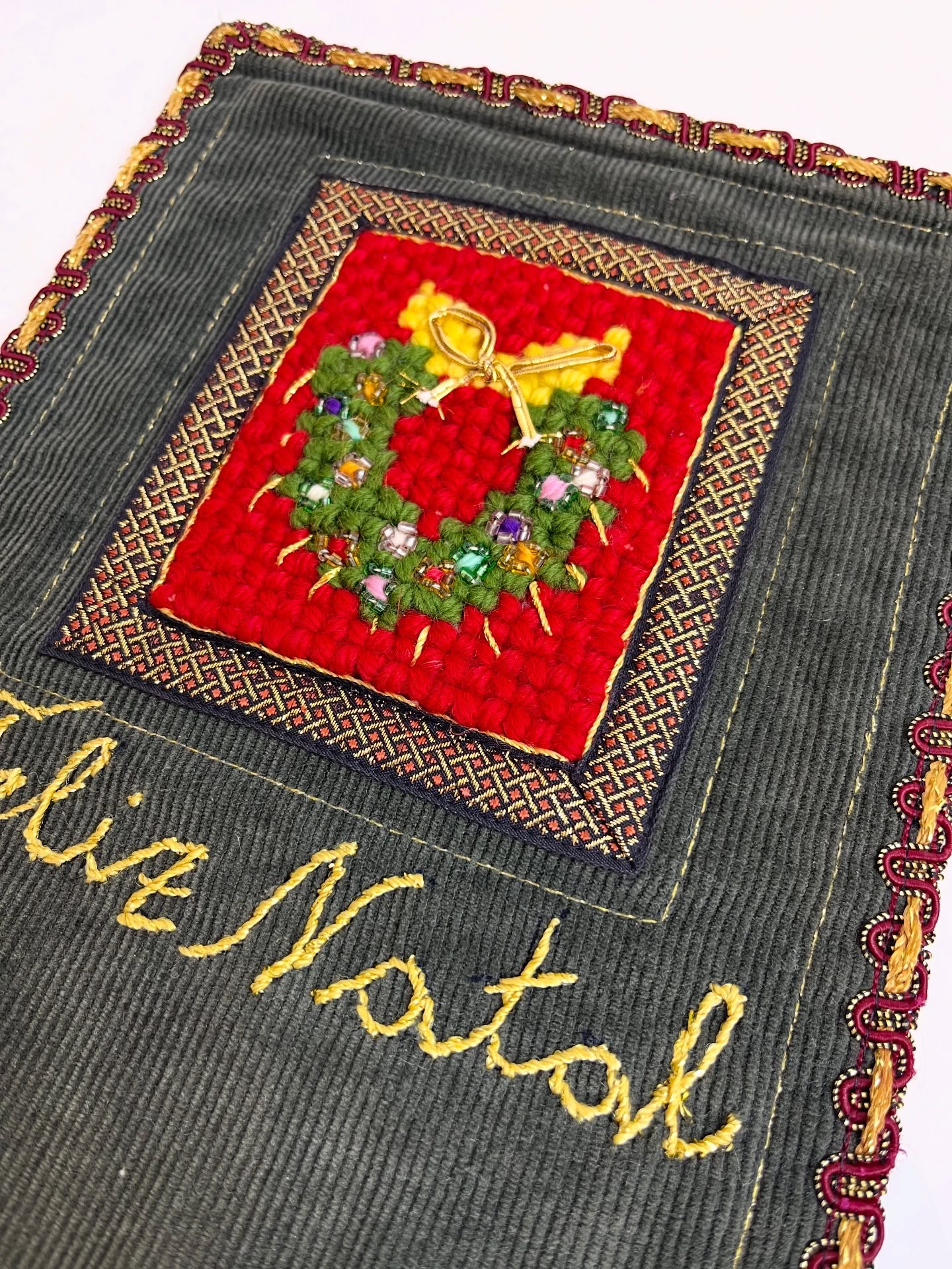 Bandeirinha de Natal em veludo e sarja, com detalhes bordados e em ponto cruz. Leves marcas do tempo e uso. Com suporte para pendurar.
