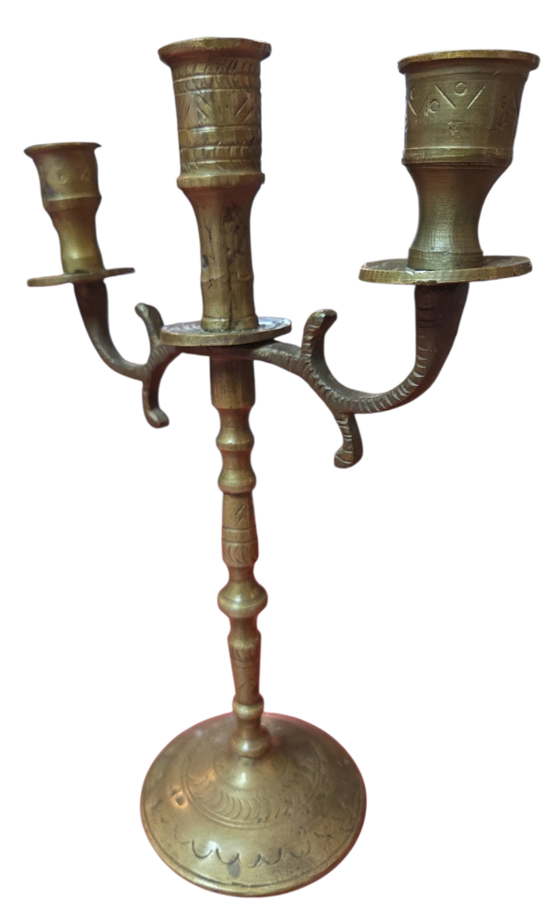 Candelabro vintage de 3 braços em bronze maciço, uma peça autêntica com a beleza da passagem do tempo visível na sua pátina natural. Perfeito para adicionar um toque de elegância rústica e história a qualquer ambiente. Ideal para decoração de mesas de jantar, aparadores ou como item de colecionador.