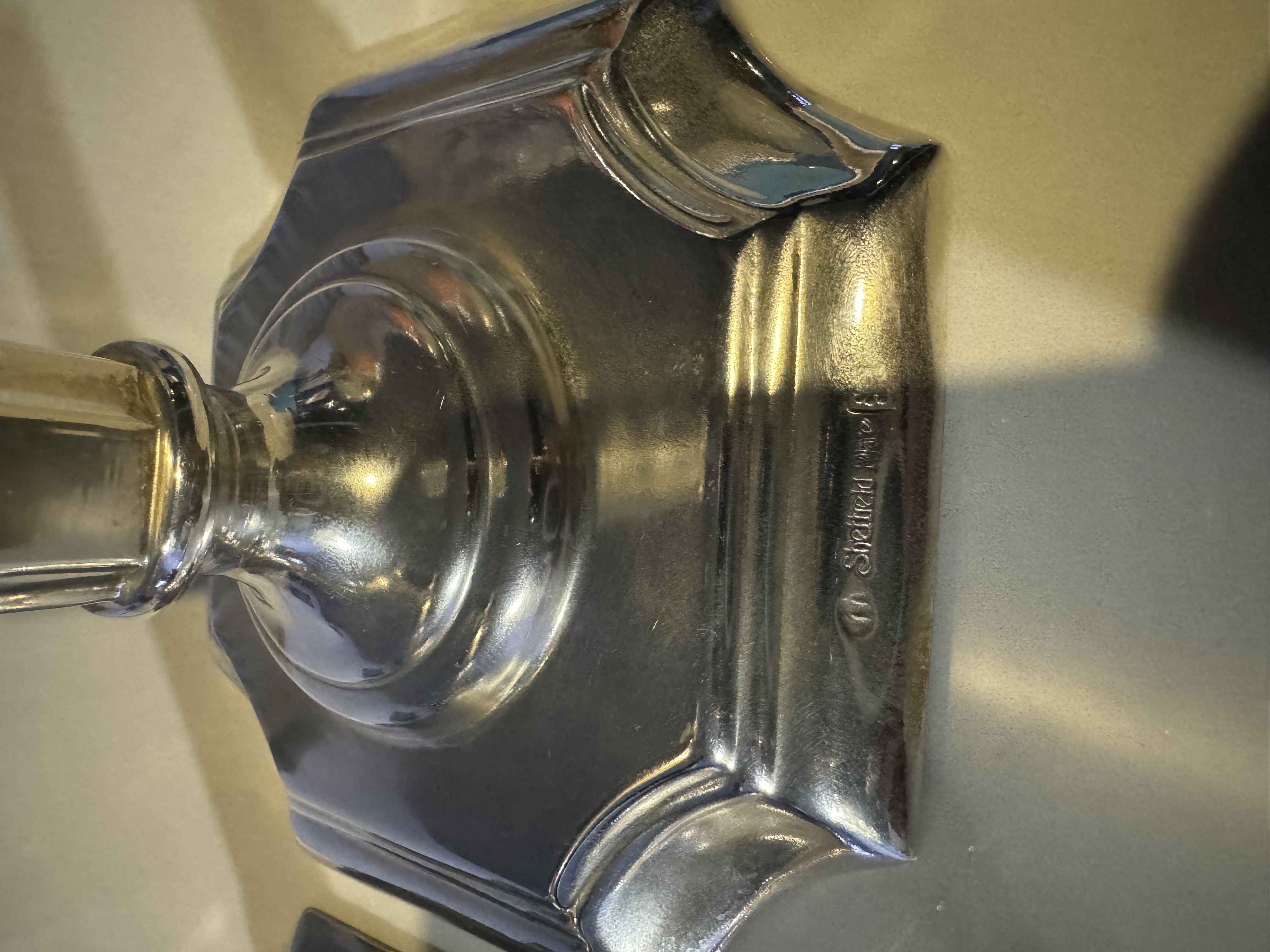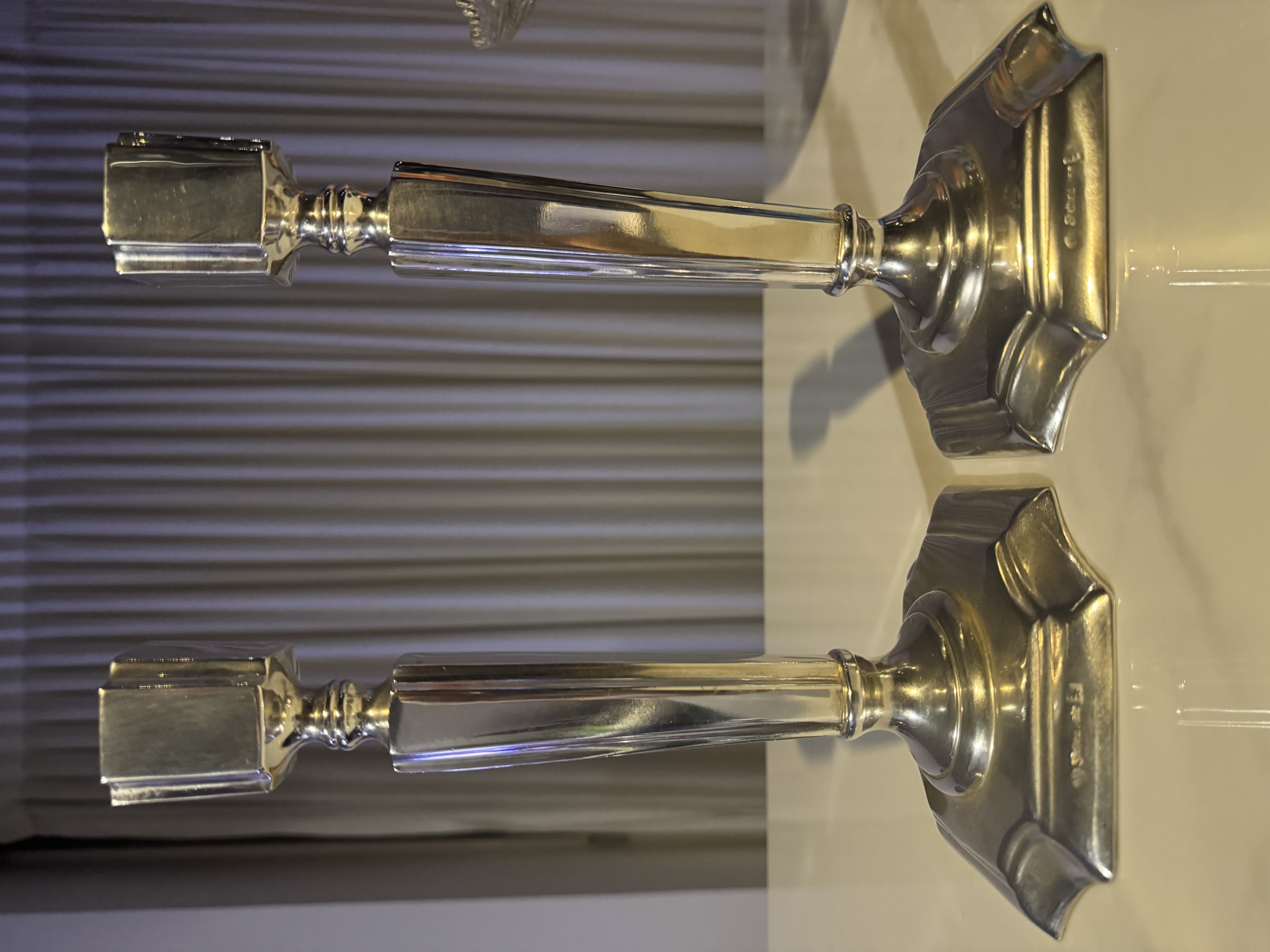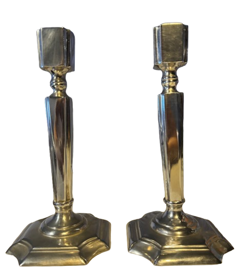 Par de castiçais em Sheffield Plate, (espessurado a prata) com haste facetada e base quadrada com recortes arredondados — desenho elegante, atemporal e equilibrado.