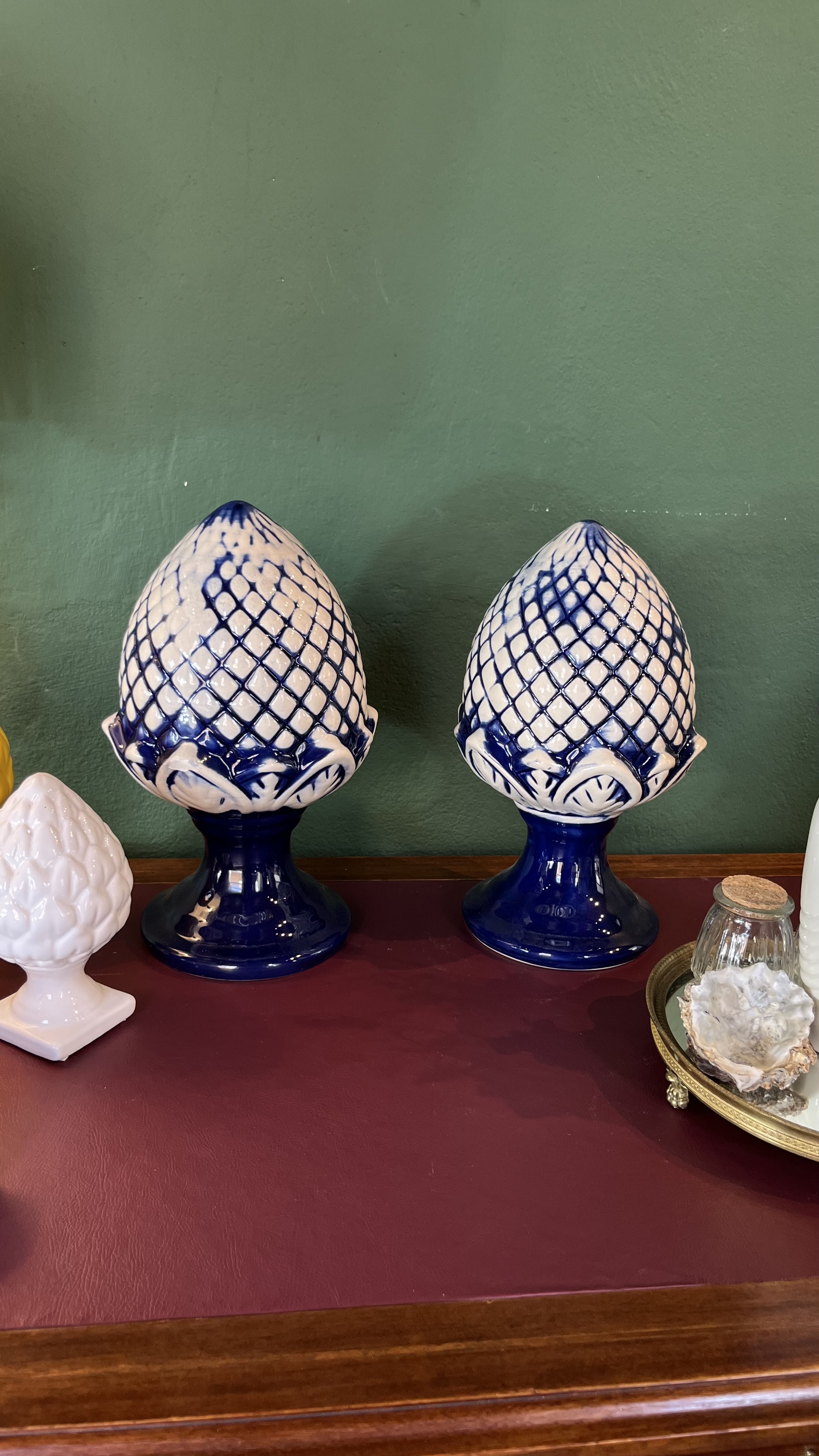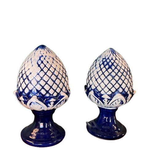 Par de pinhas em faiança nas cores branco e azul, em perfeito estado.