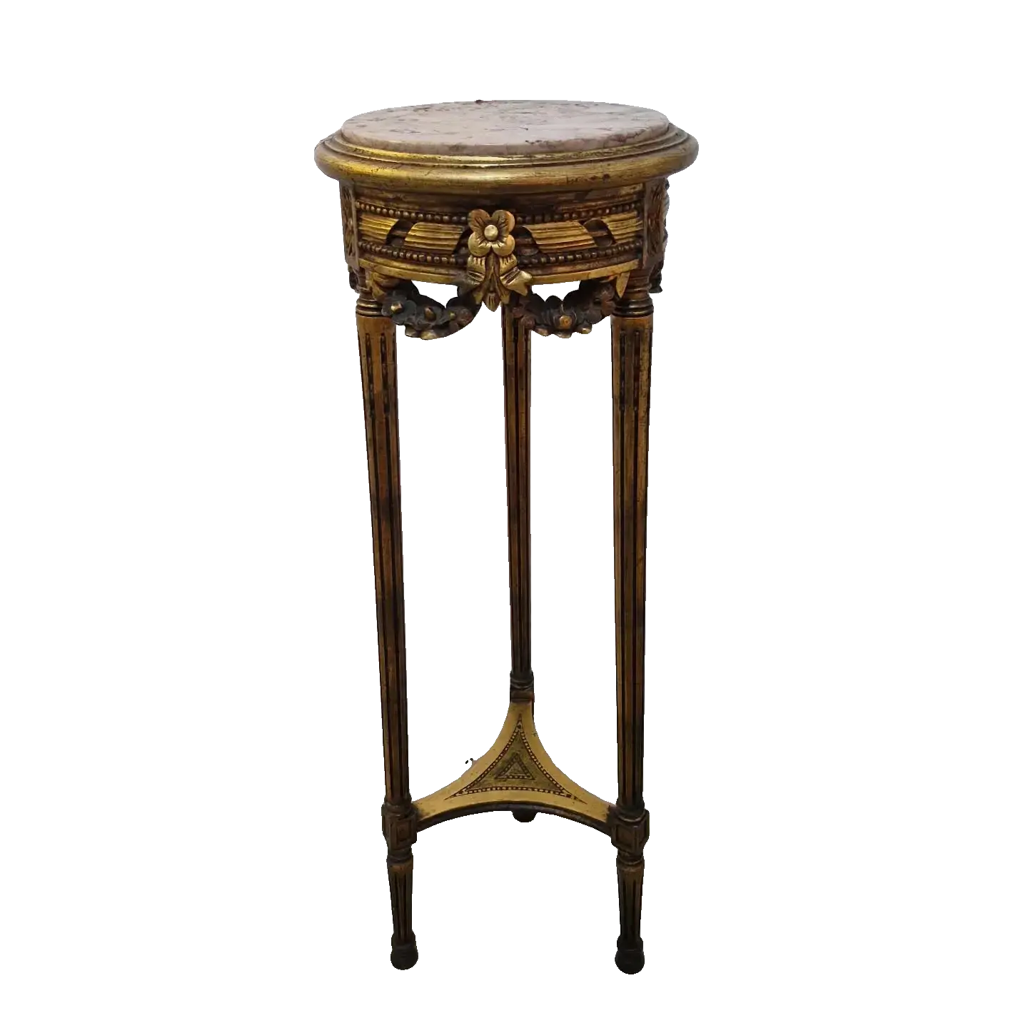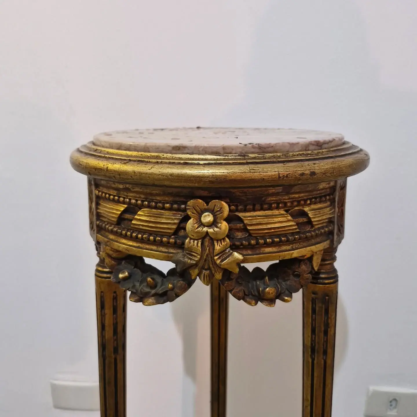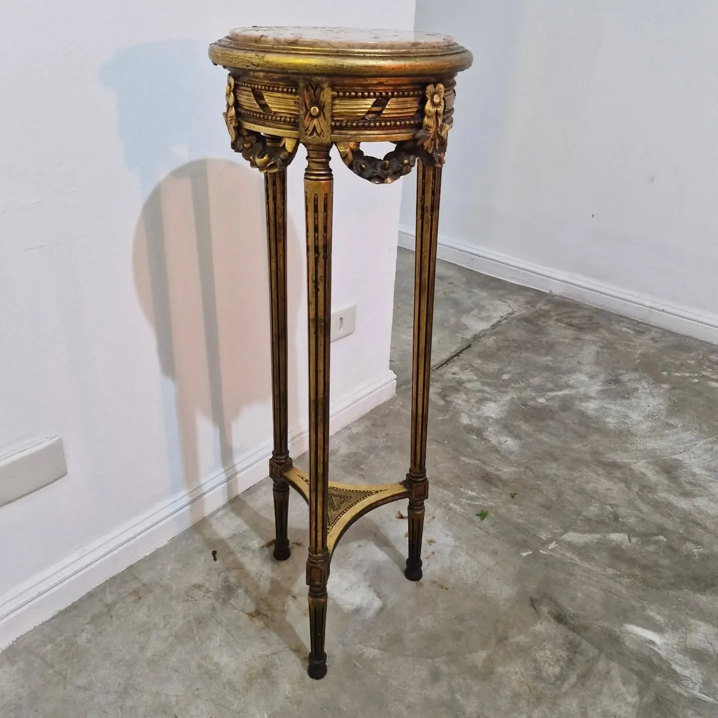 Bellissima coluna / cantoneira apoiada em 3 pés com entalhes florais , acabamento dourado com base de mármore rosa