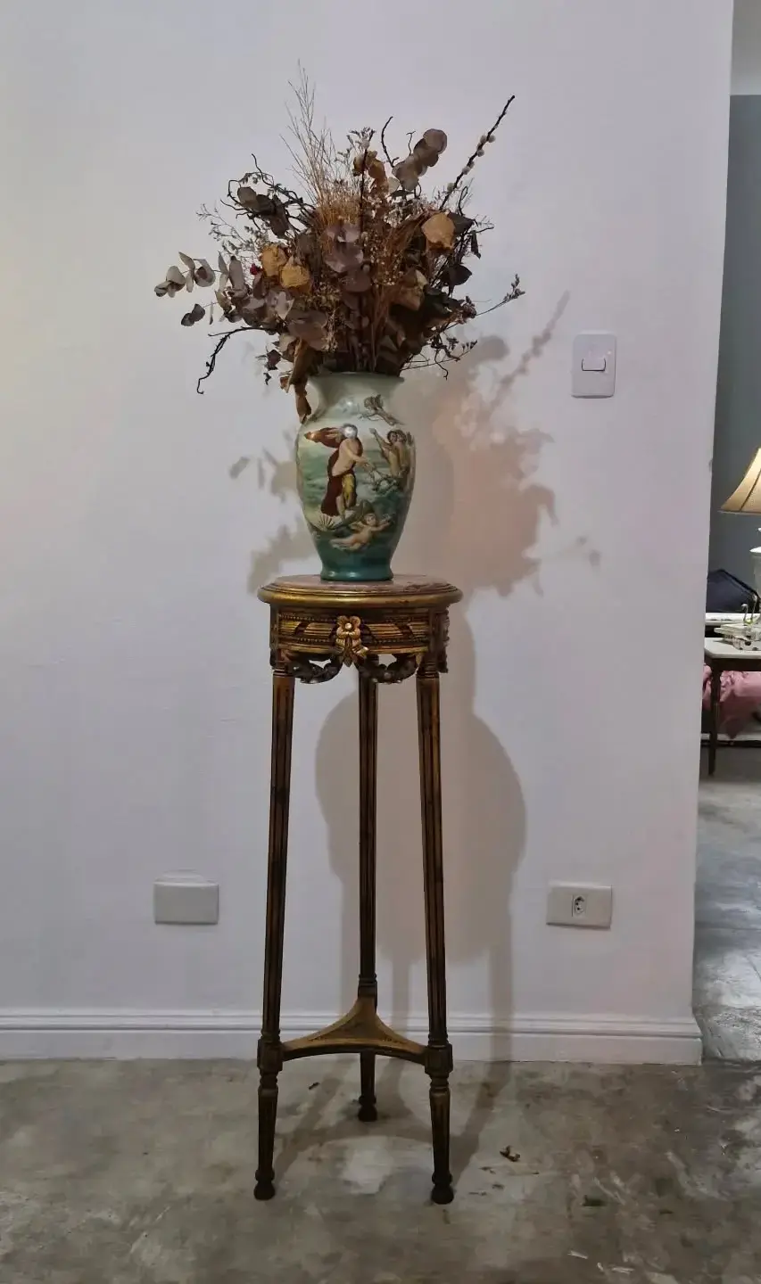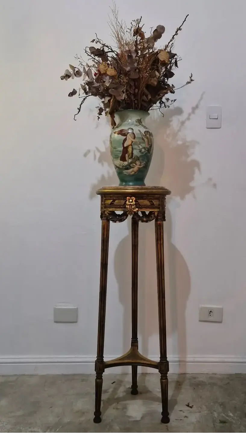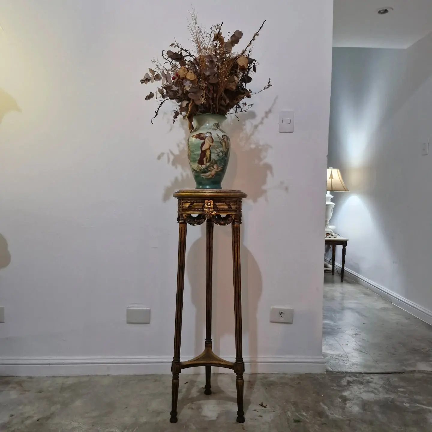 Bellissima coluna / cantoneira apoiada em 3 pés com entalhes florais , acabamento dourado com base de mármore rosa