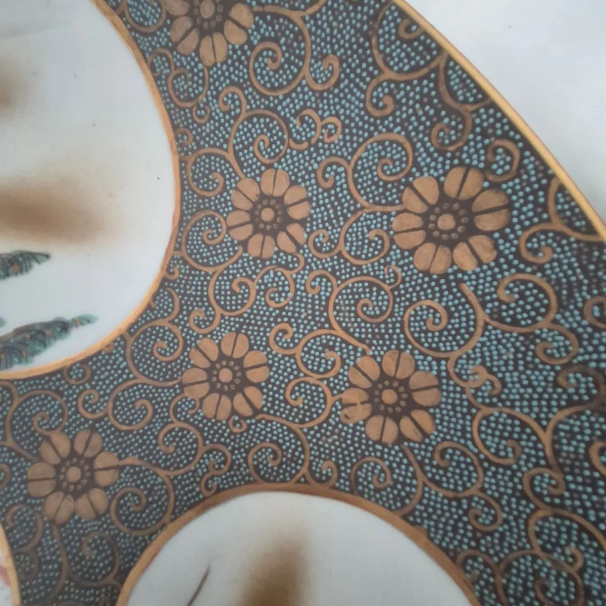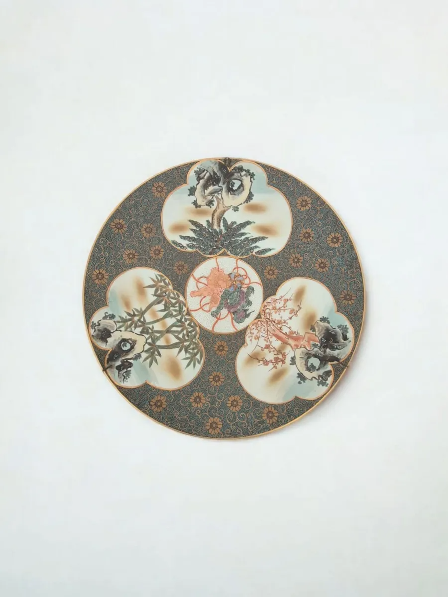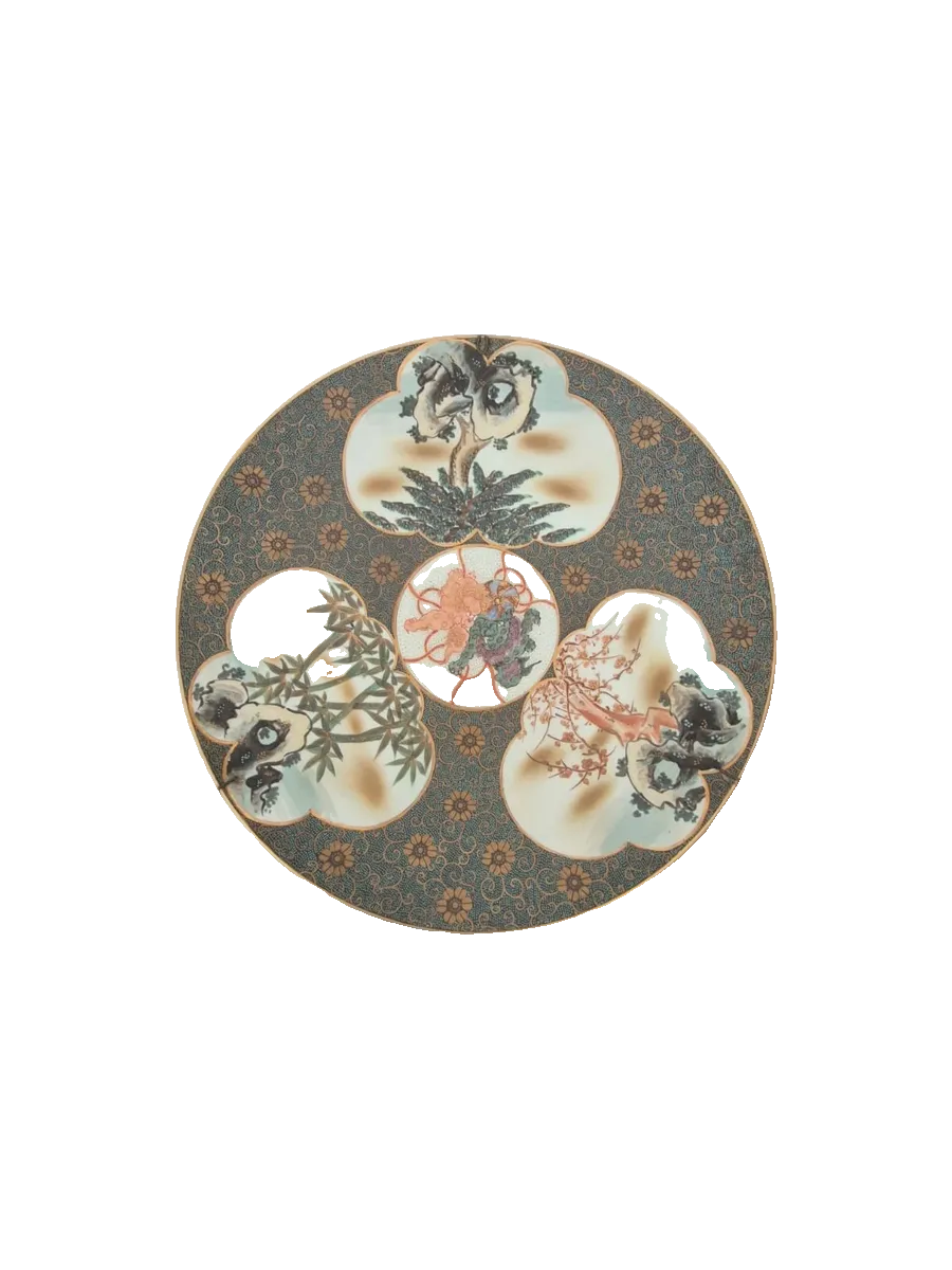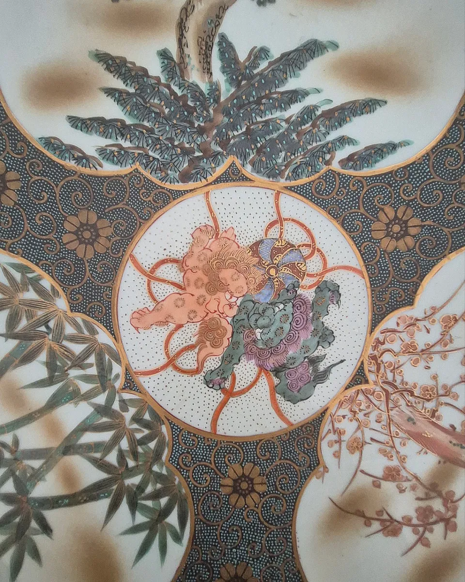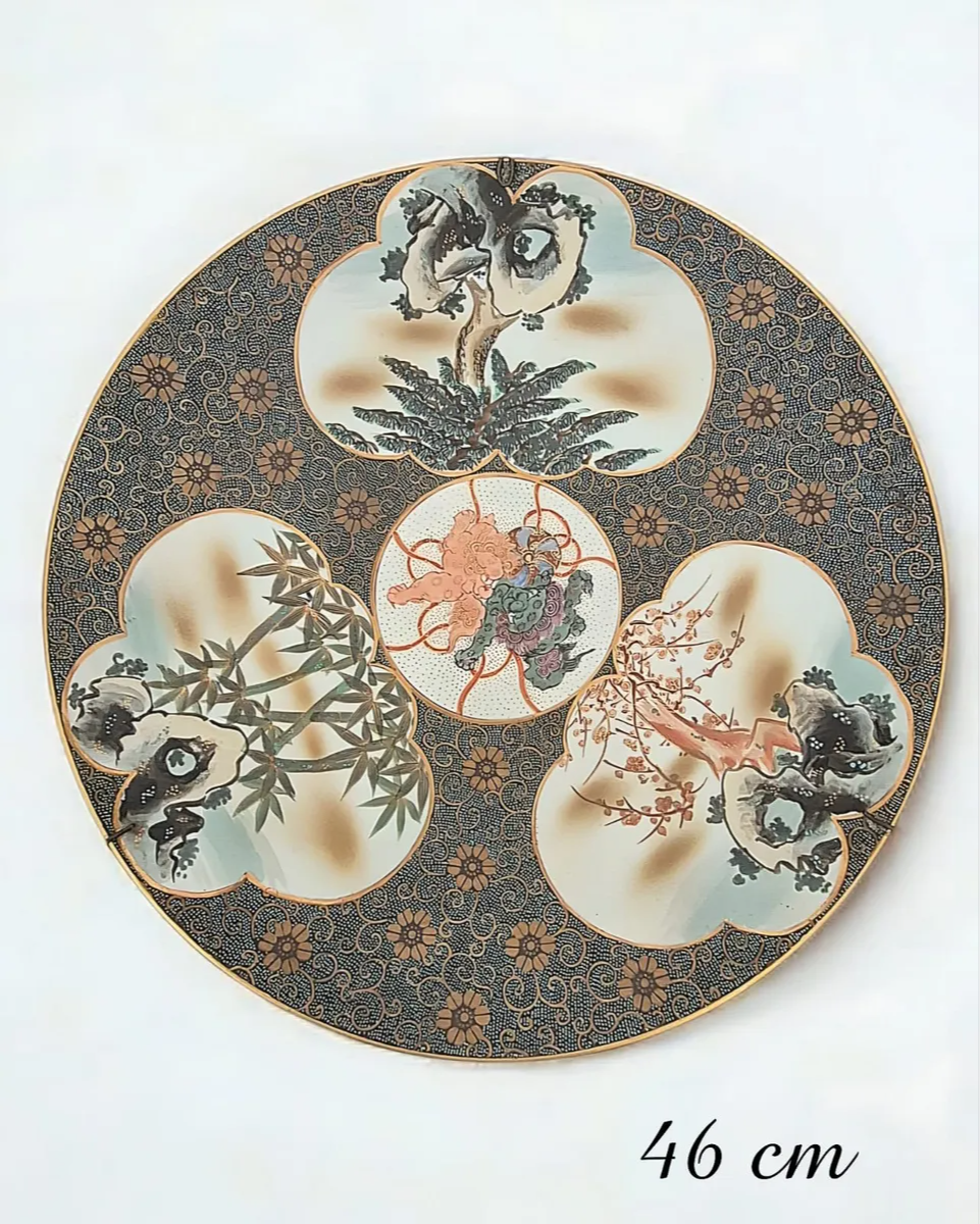Esse lindo e grande prato medalhão é um belo exemplo de porcelana japonesa do final do século XIX ou início do século XX (Era Meiji). É provável que tenha sido produzido em centros como Arita (Imari) ou possivelmente um tipo de Satsuma mais voltado para porcelana, destinado ao mercado de exportação devido ao seu design atraente e ornamental que combinava a tradição oriental com o gosto ocidental da época.Apostando mais na probabilidade de sua origem japonesa e datando-o da Era Meiji (final do século XIX ao início do século XX). Essa atribuição é significativamente reforçada pela presença de dois Komainu no medalhão central, figuras de leões-cães guardiões distintamente japonesas. A decoração é complementada por três painéis laterais que destacam árvores típicas, um motivo comum na arte naturalista japonesa. O estilo geral, com fundos densamente padronizados e a compartimentalização da decoração em painéis, sugere uma produção voltada para exportação (como a porcelana Imari/Arita ou influências Satsuma), que combinava a iconografia cultural japonesa com o gosto ocidental da época.