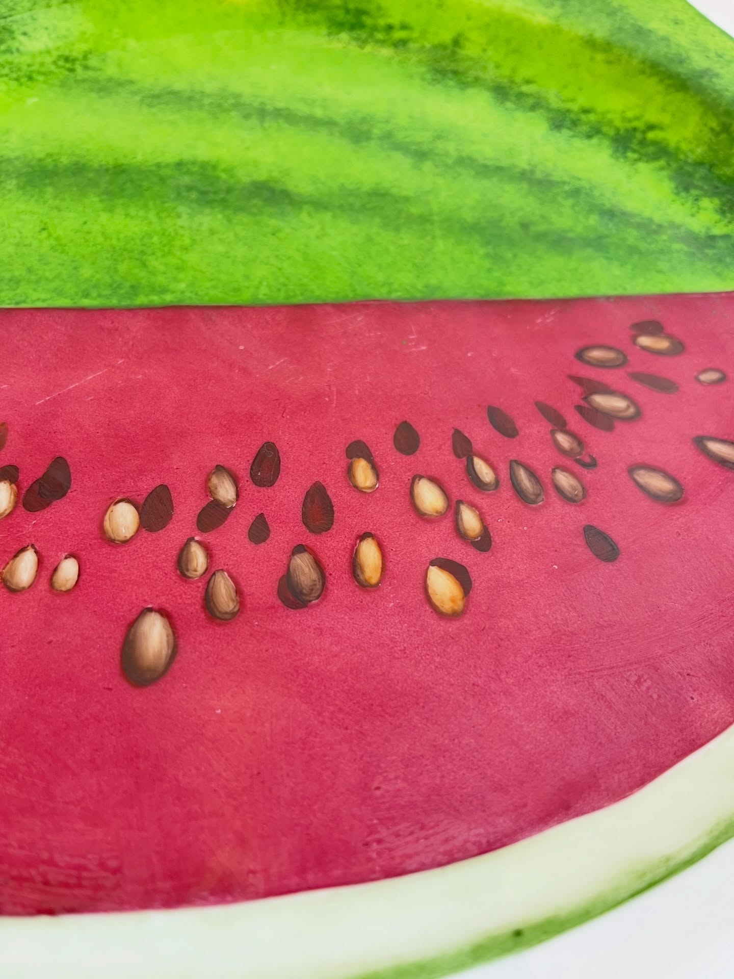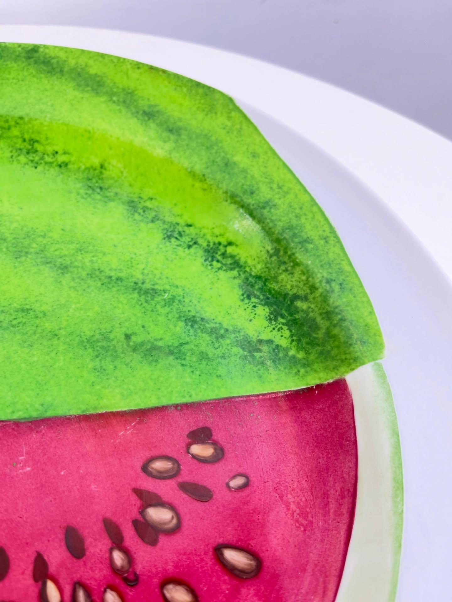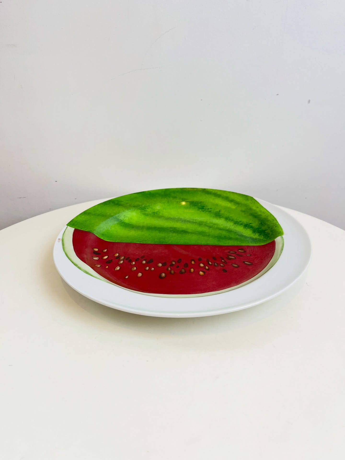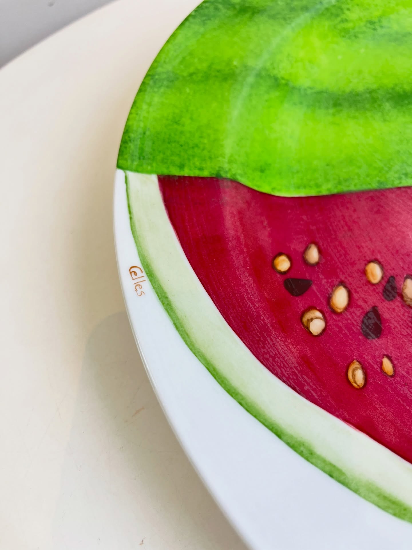 Grande prato em porcelana pintada a mão e assinado. Leves marcas do tempo e uso.