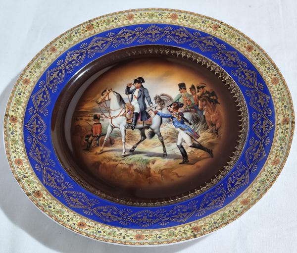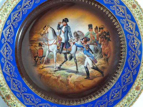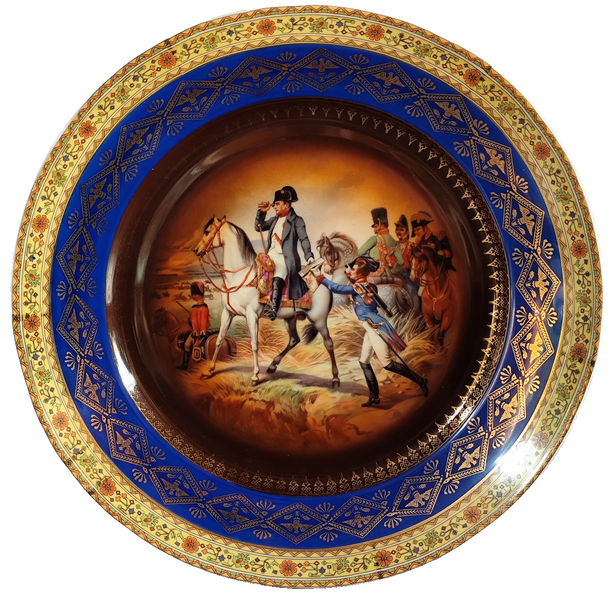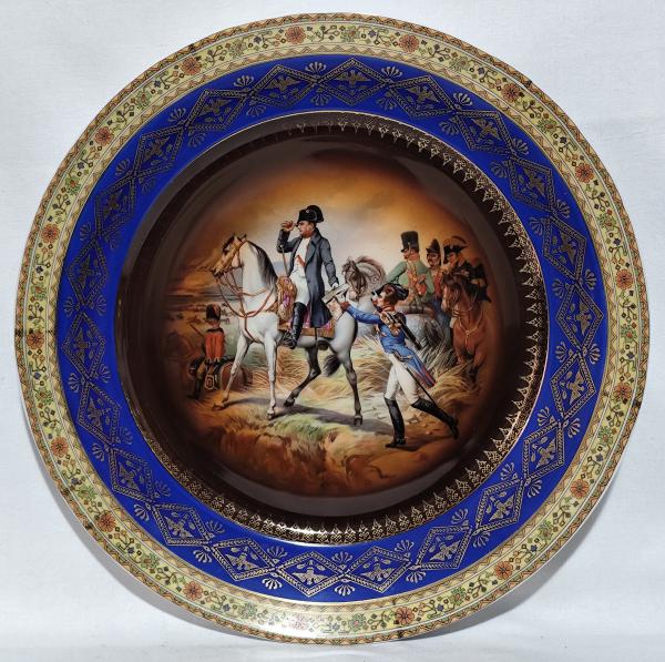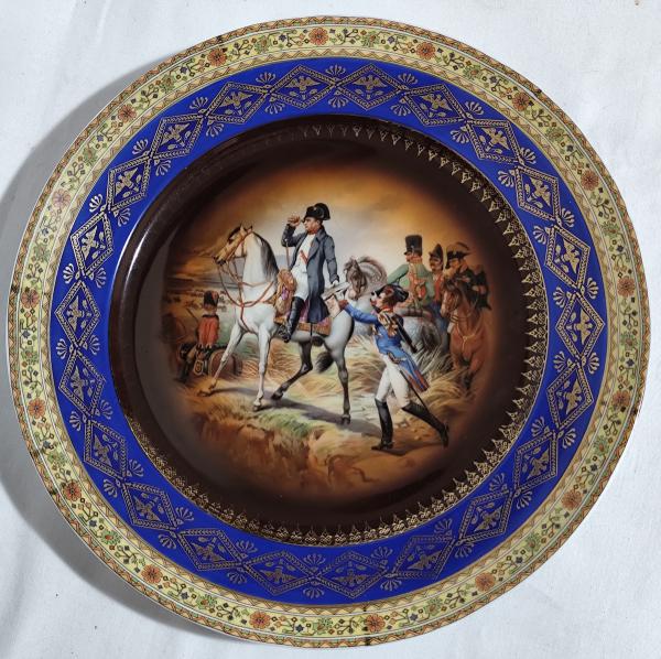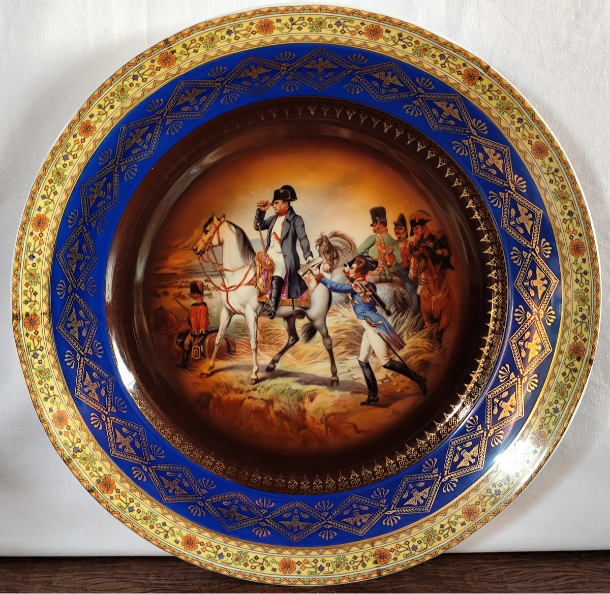Medalhão em porcelana tcheca, policromada e dourada, com aba decorada por vários frisos geométricos. Centro ornamentado por cena de batalha Napoleônica, observando com binóculos a movimentação das tropas e recebendo uma mensagem escrita. Sob a base marca da procedência Made in Czechoslovakia. Medidas 30 cm diâm.