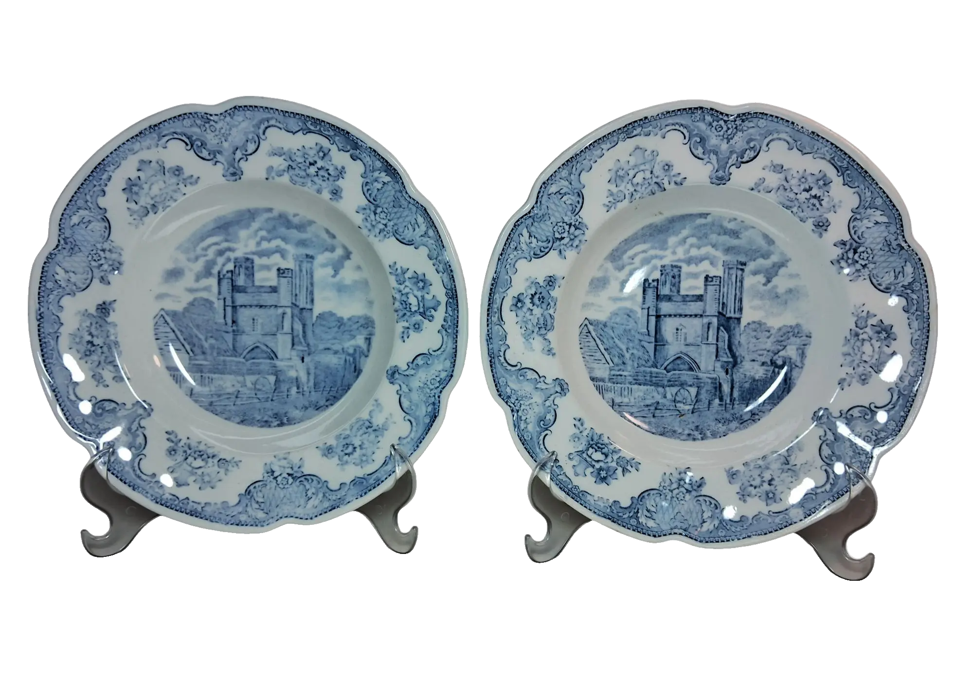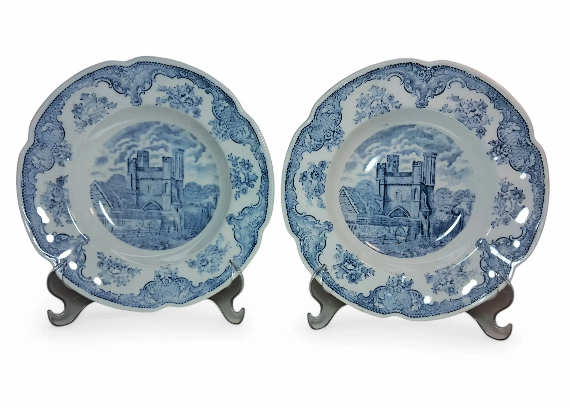 Par de pratos fundos da tradicional marca São Caetano, com cenas de castelos em azul no padrão inglês. Diâmetro 23 cm, altura 4.5 cm. Para uso tanto na decoração ou em serviço de mesa. Temos outro par disponível para venda.