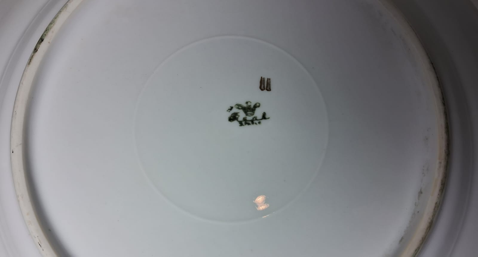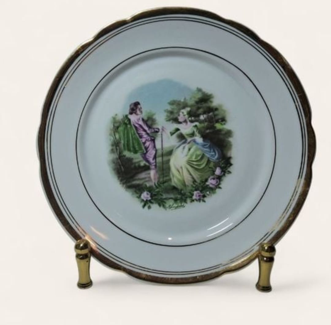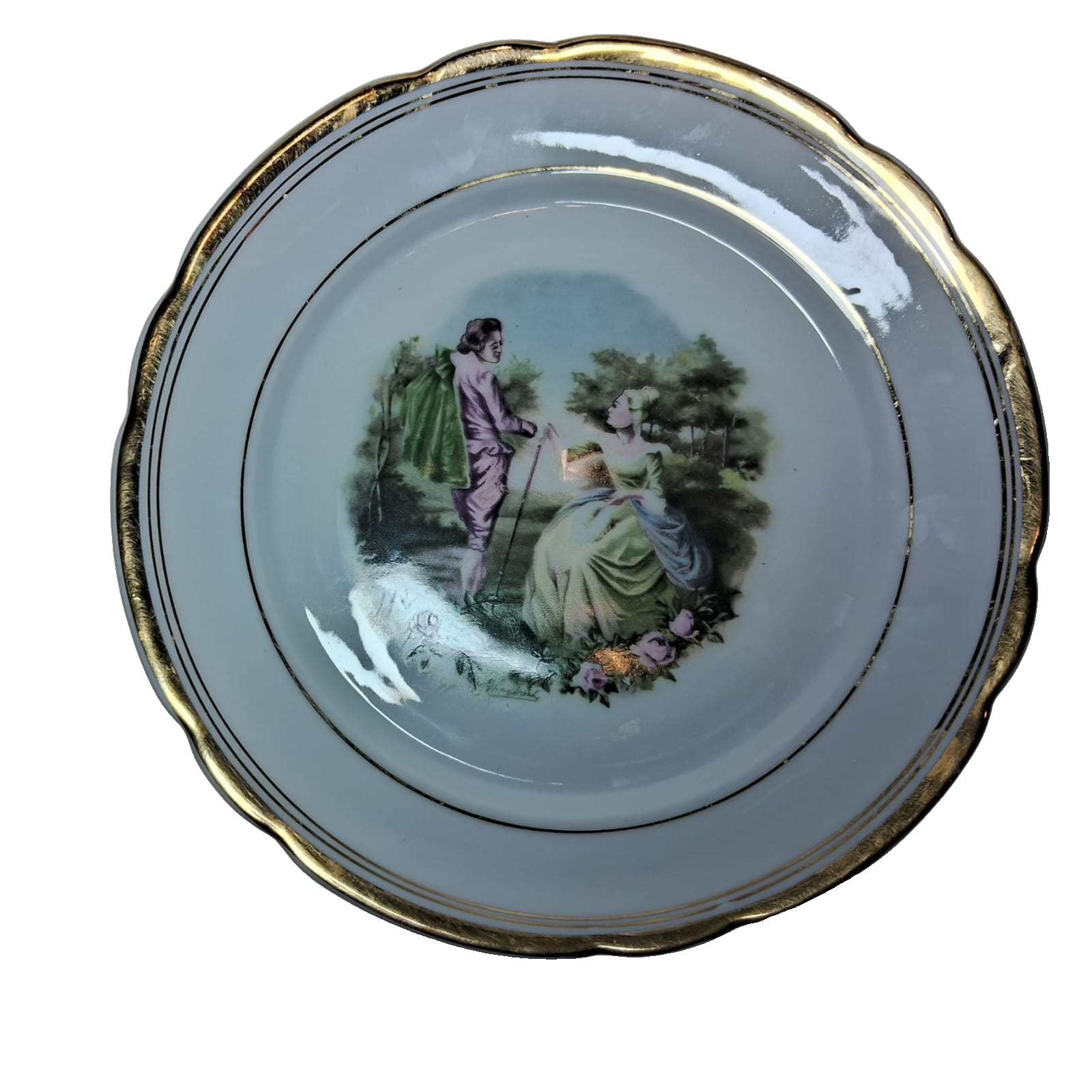 Prato com bordas douradas e centro com cena galante. Lindo e em ótimo estado.