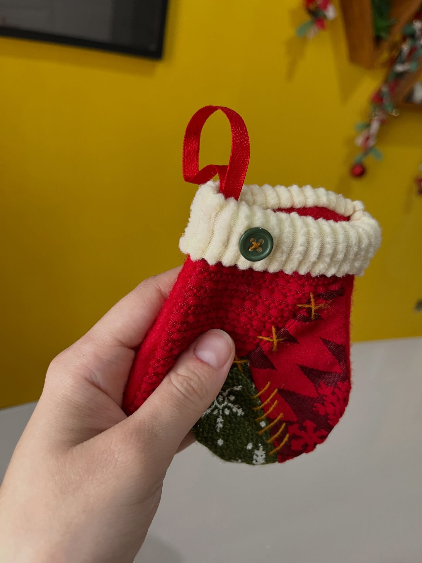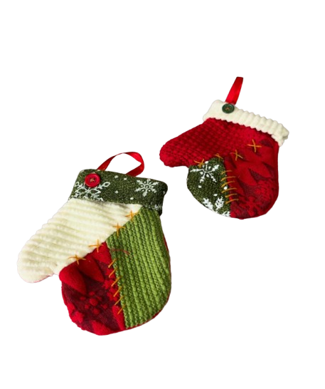 Dupla de enfeites em tecido. Bordado a mão. Leves marcas do tempo e uso.