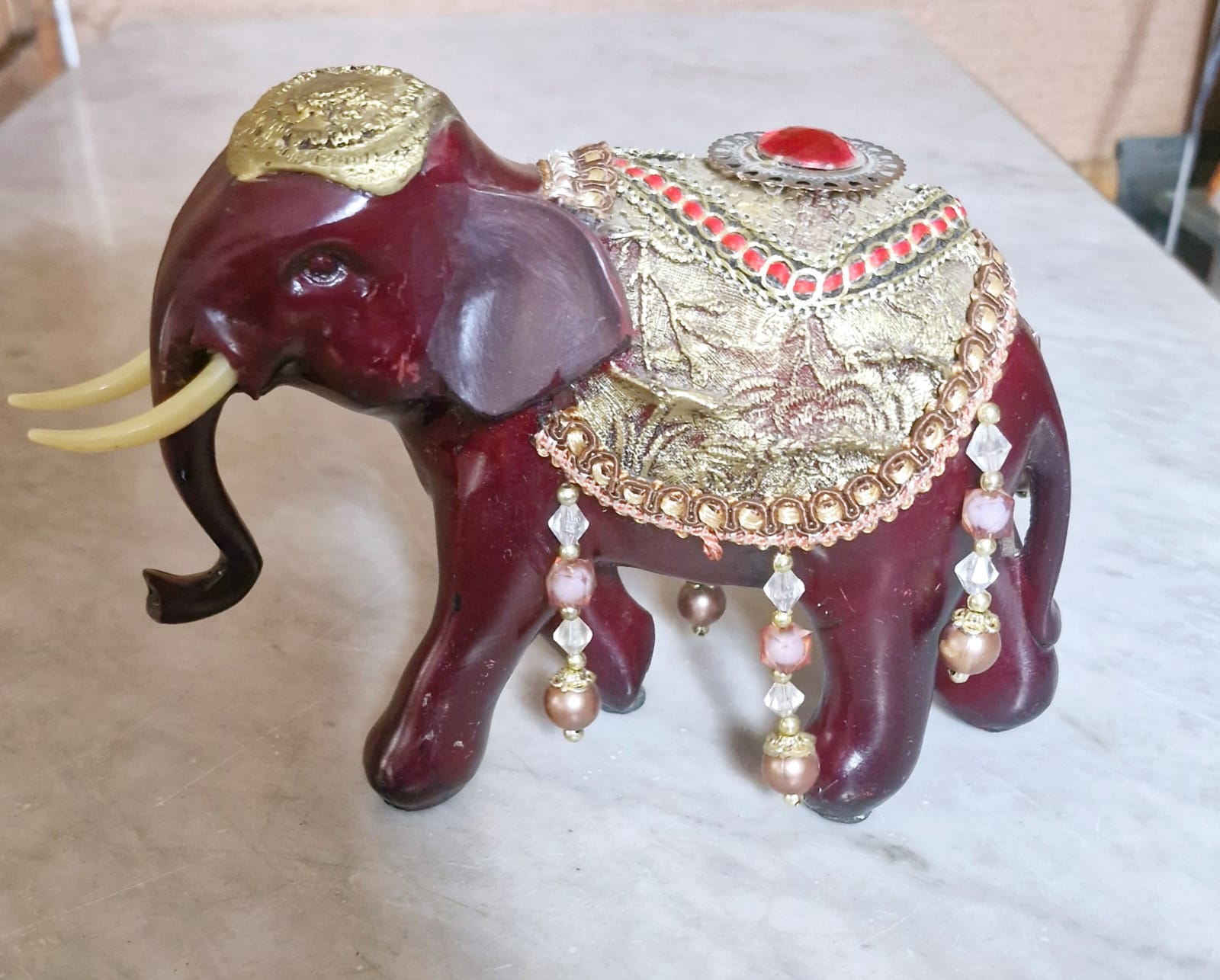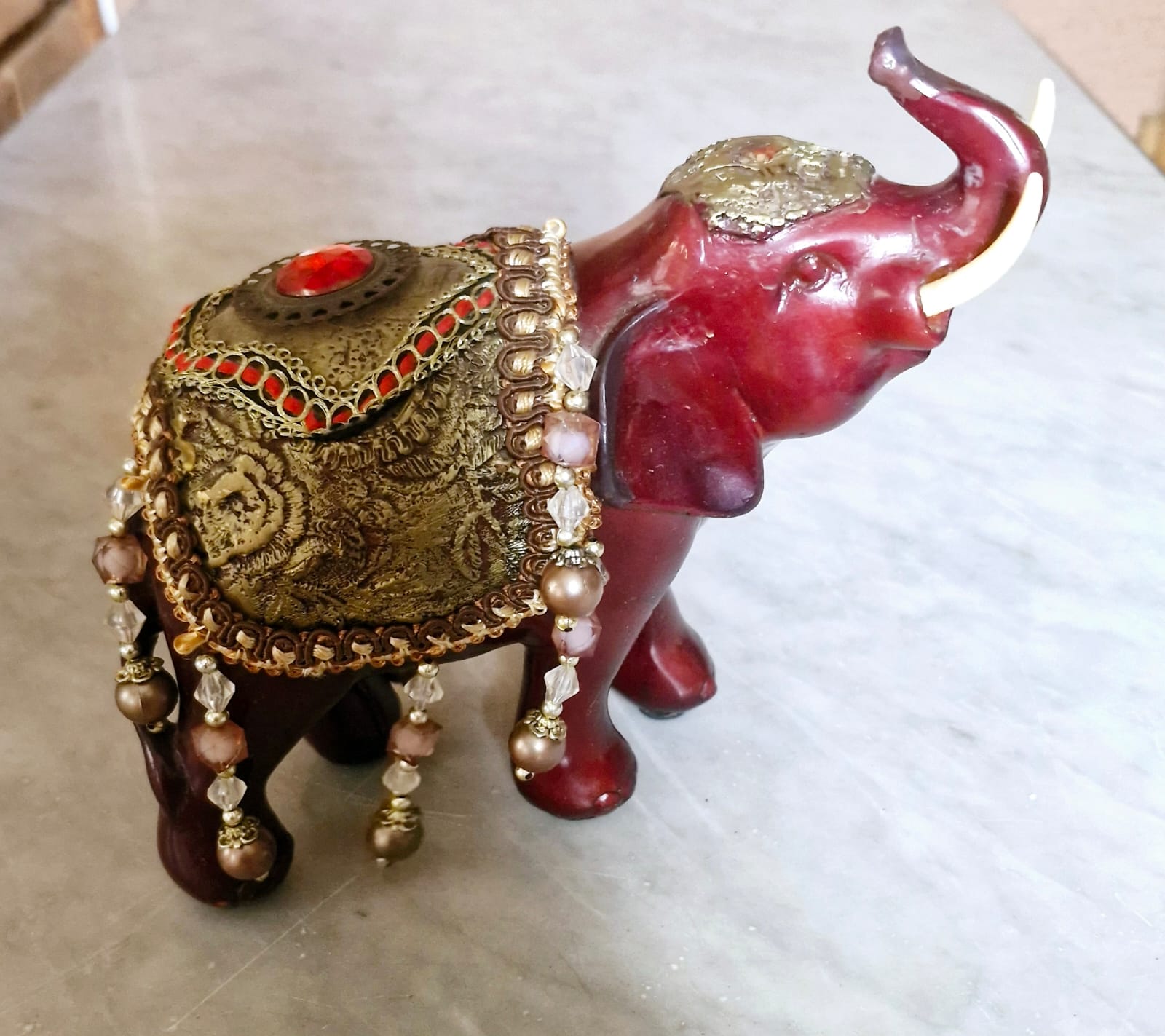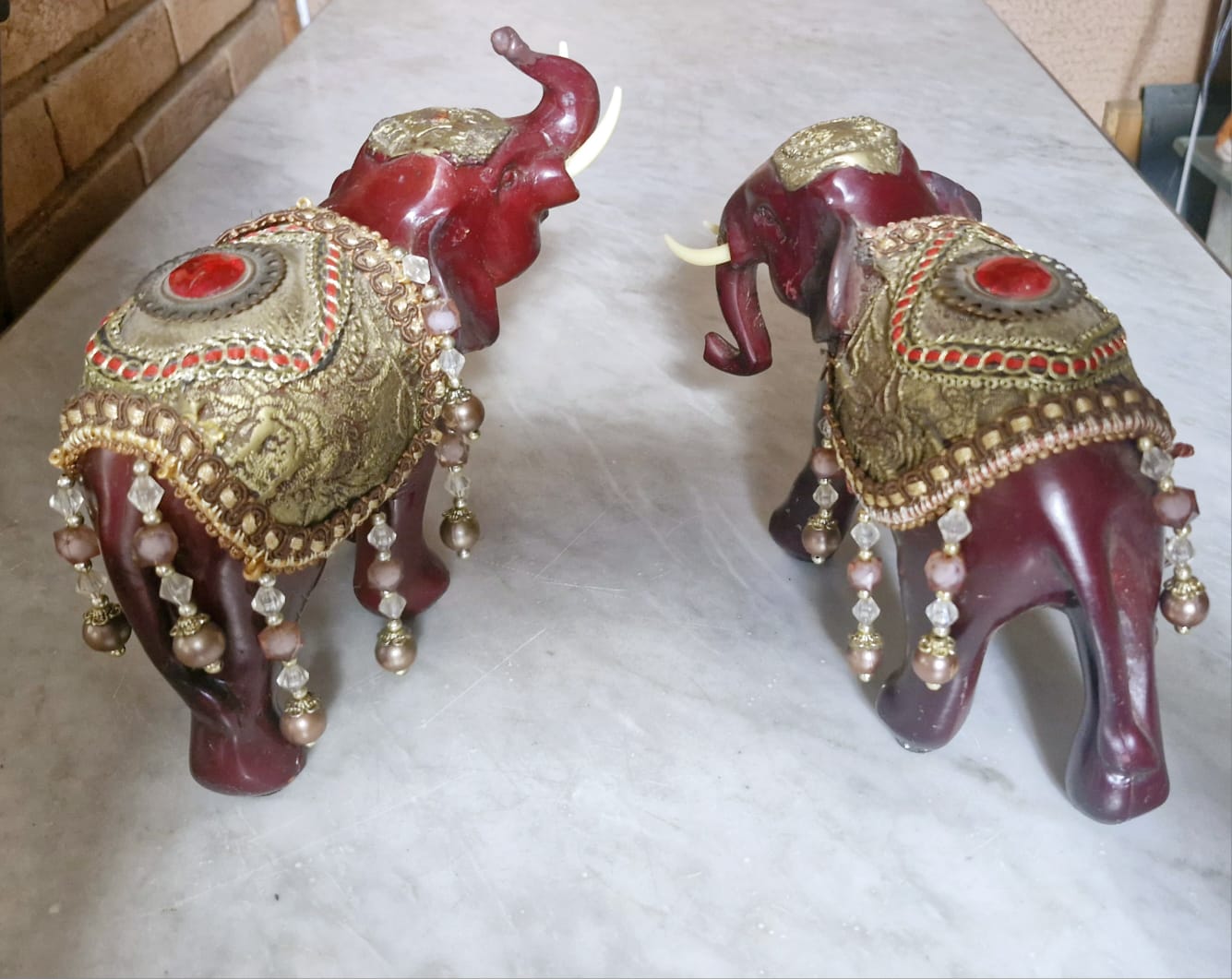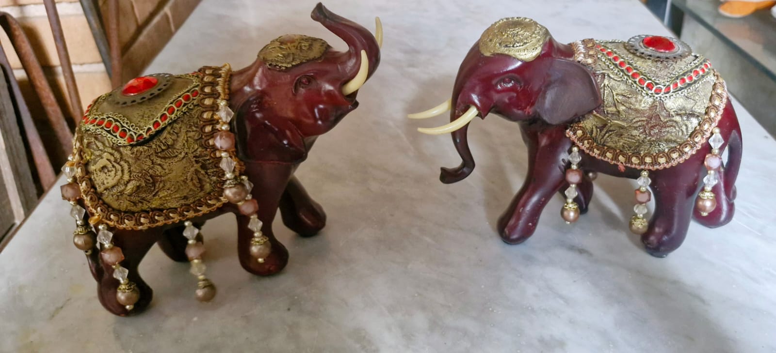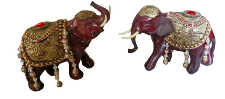 Par de elefantes em tom de vinho com mantos dourados e pedrarias, que representam a Realeza e a Abundância.