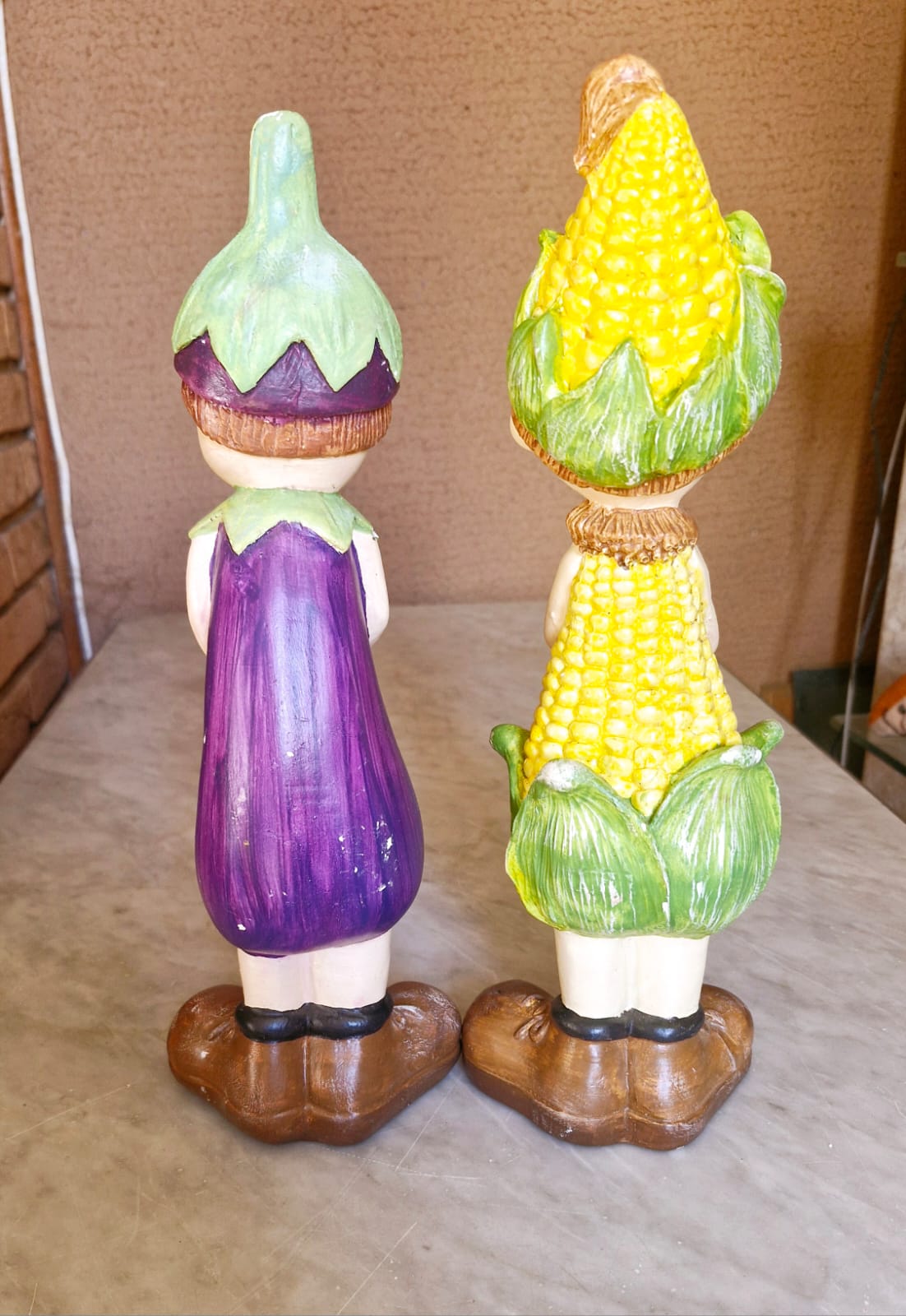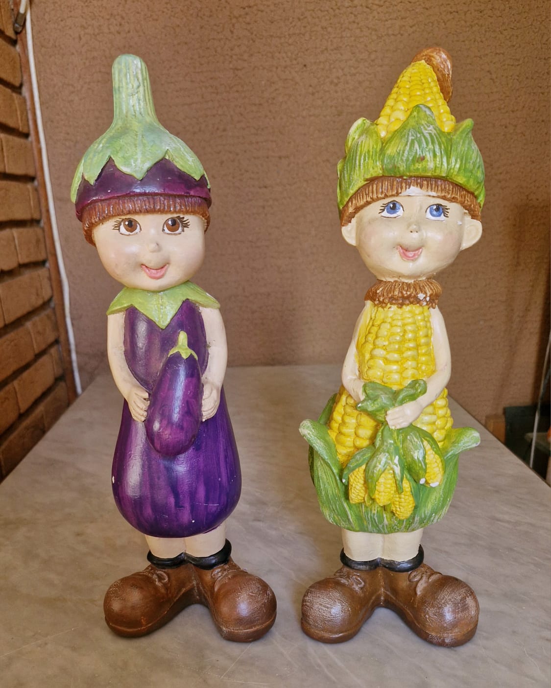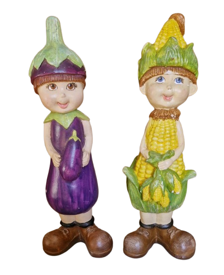 Lindo e raro conjunto de estatuetas decorativas antropomórficas pintadas à mão, representando dois personagens infantis (estilo gnomos ou crianças de jardim) inspirados em vegetais e legumes. É uma dupla lúdica, ideal para decoração de cozinhas, áreas de churrasco ou hortas.