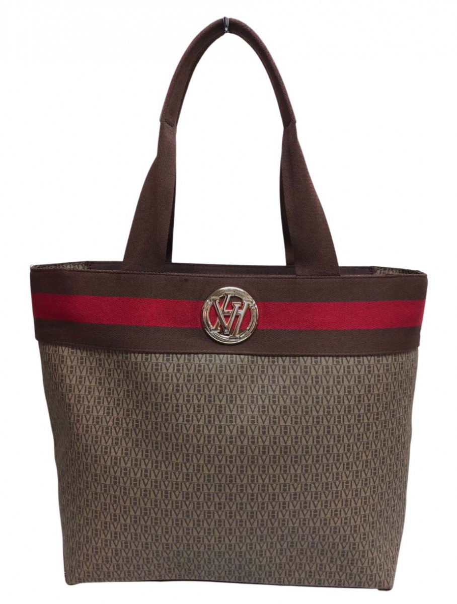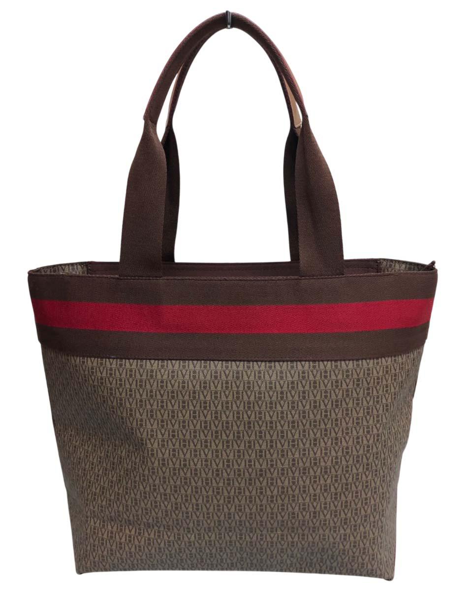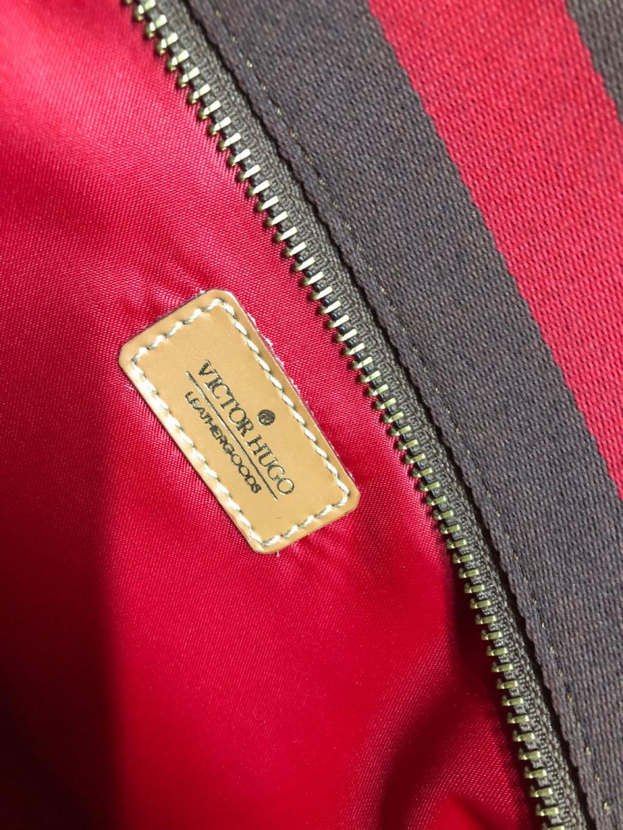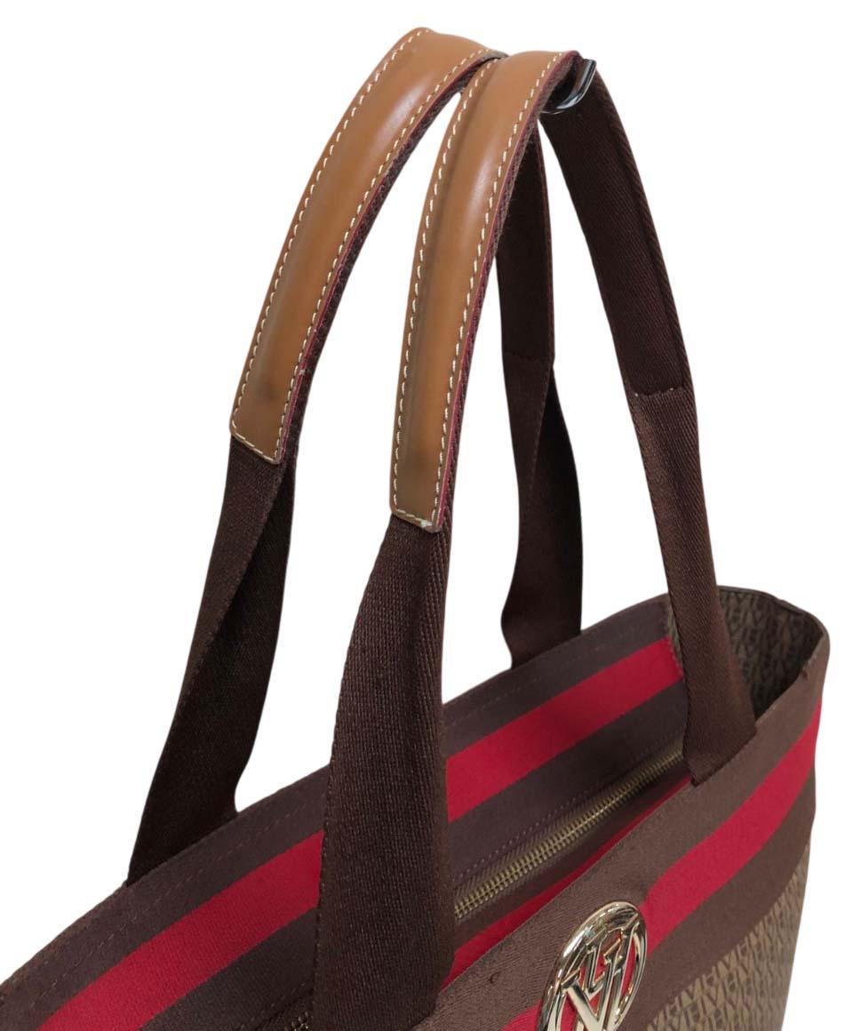 ACESSÓRIOS FEMININOS- Bolsa da renomada grife VICTOR HUGO, ORIGINAL ( B08K 07). Apresenta faixa em tecido na tonalidade marrom e vermelho e alças com acabamento em couro, parte interna em cetim vermelho.