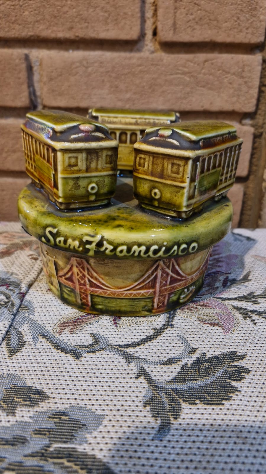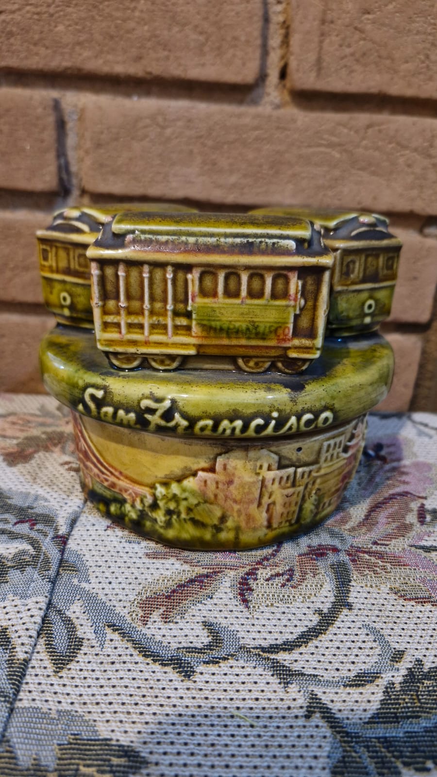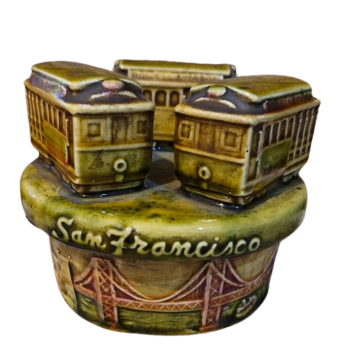 Linda e rara caixinha musical movida à corda, produzida em meados da década de 70, em cerâmica vitrificada, entalhada com 3 vagões de trem e paisagem de San Francisco, incluindo a famosa ponte. Funcionando