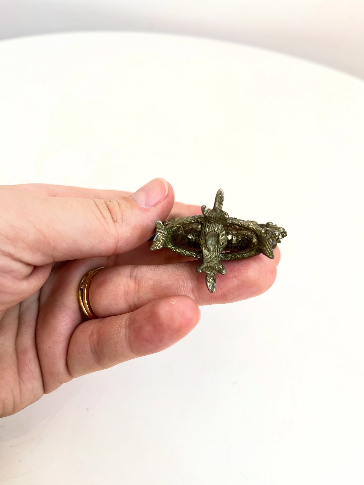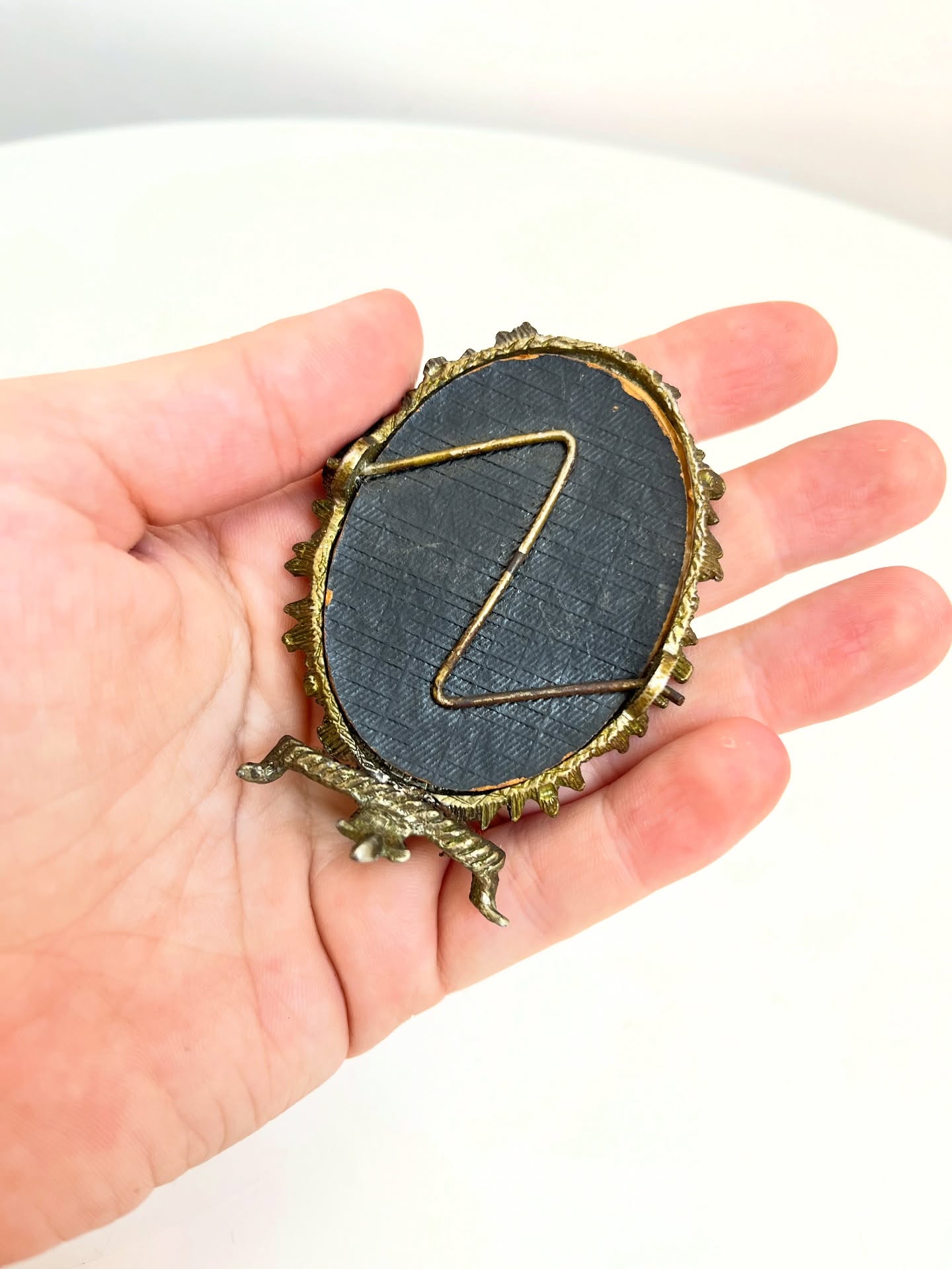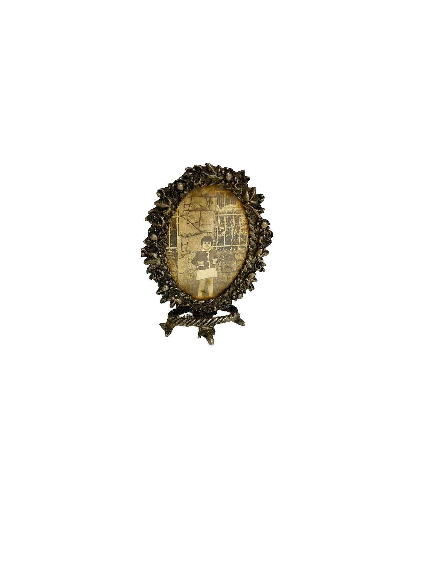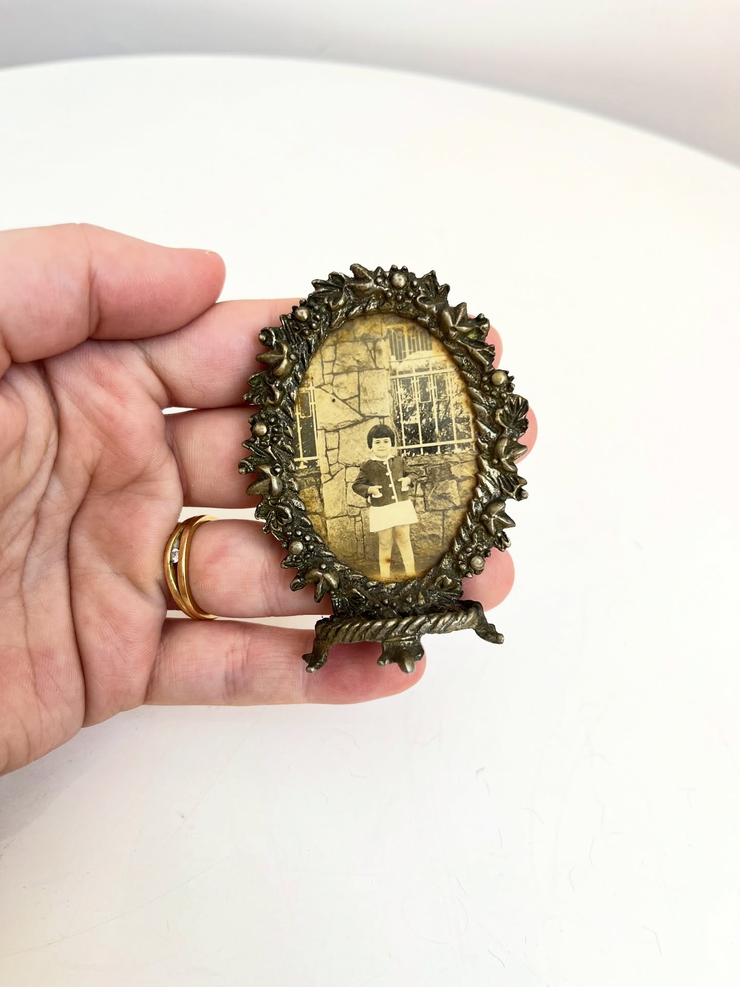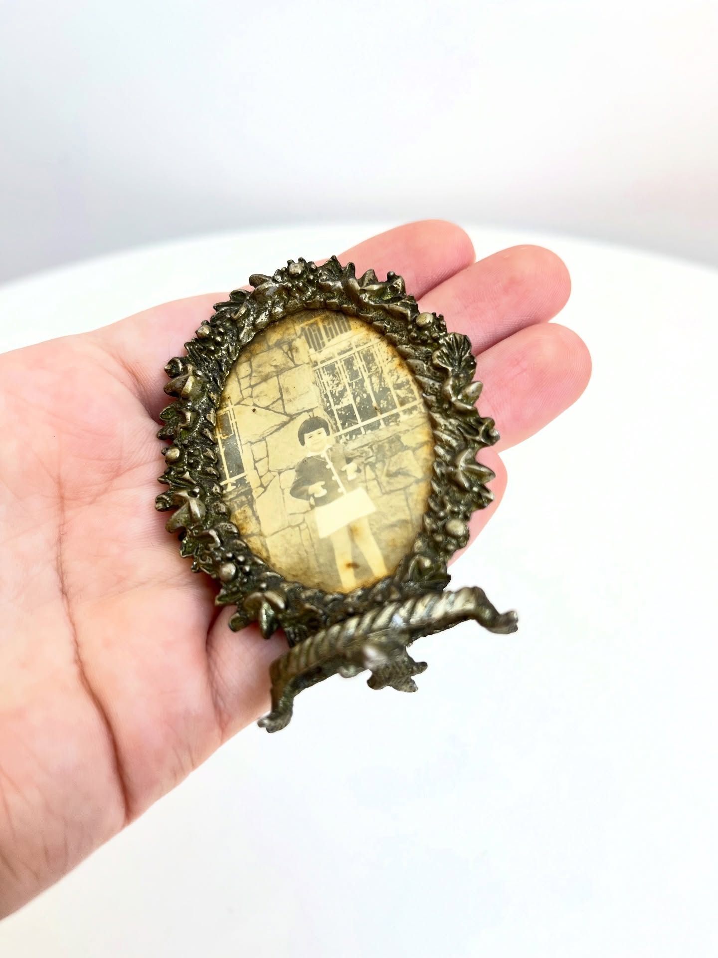 Pequeno porta retrato em metal. Marcas do tempo e uso como nas fotos.