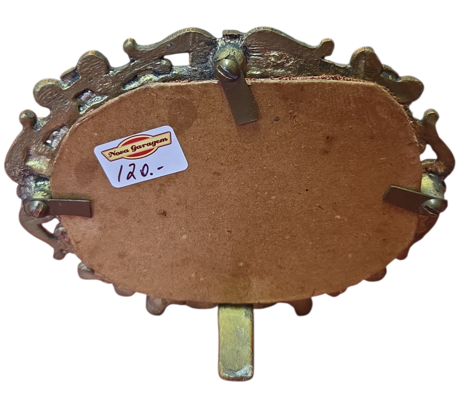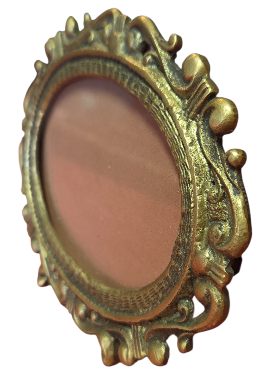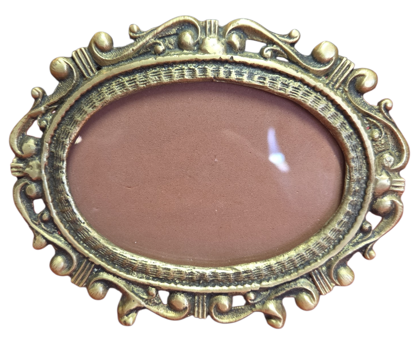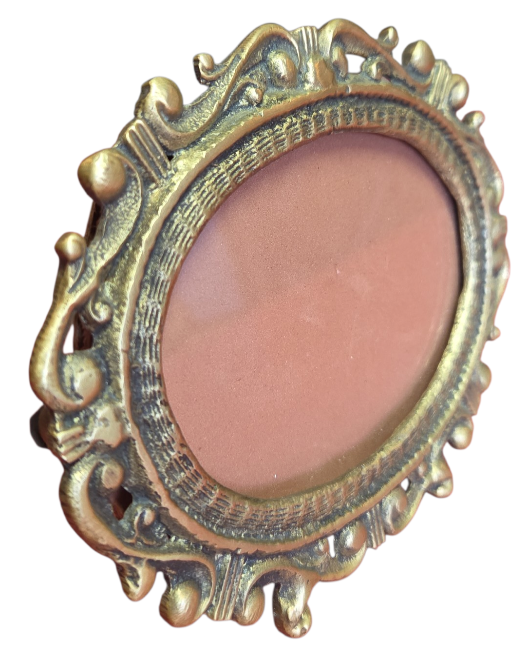 Belíssimo porta-retrato horizontal oval confeccionado em bronze de alta qualidade. Esta peça apresenta um trabalho de fundição detalhado com ornamentos clássicos, ideal para compor decorações sofisticadas ou ambientes que prezam pelo estilo vintage.