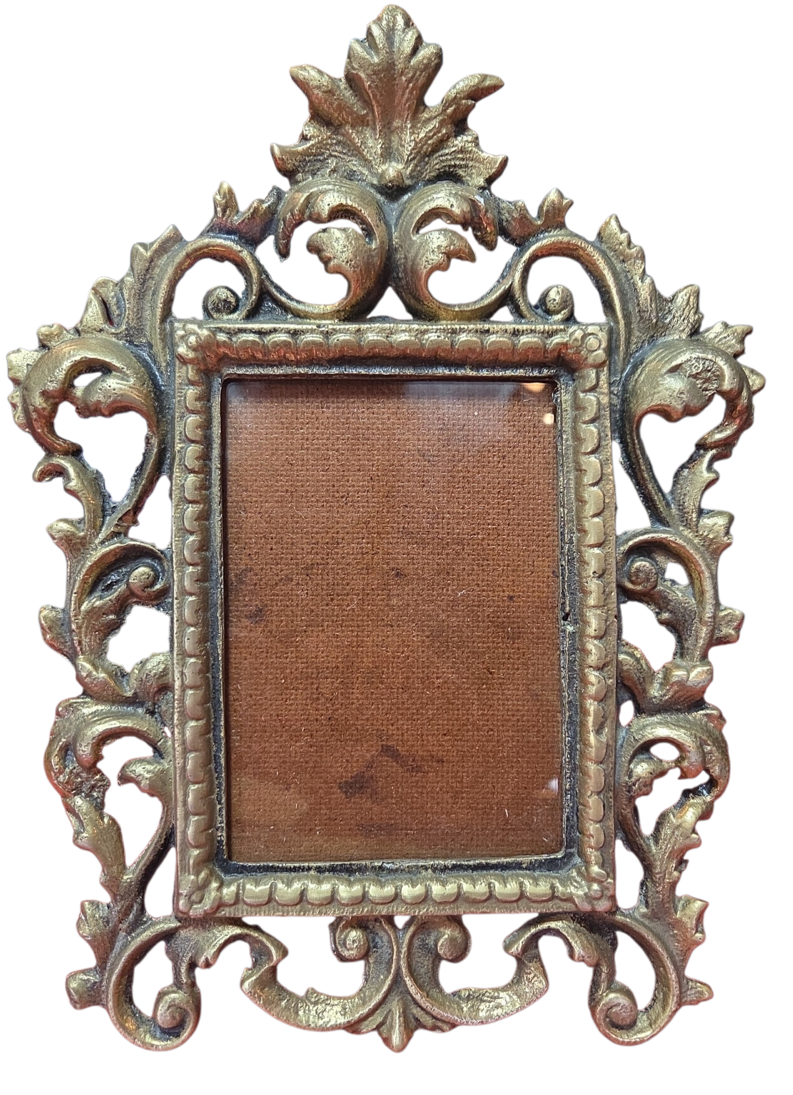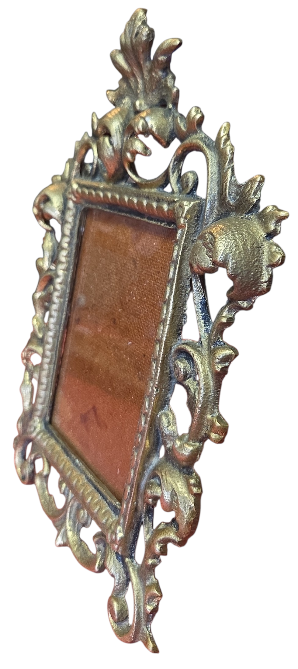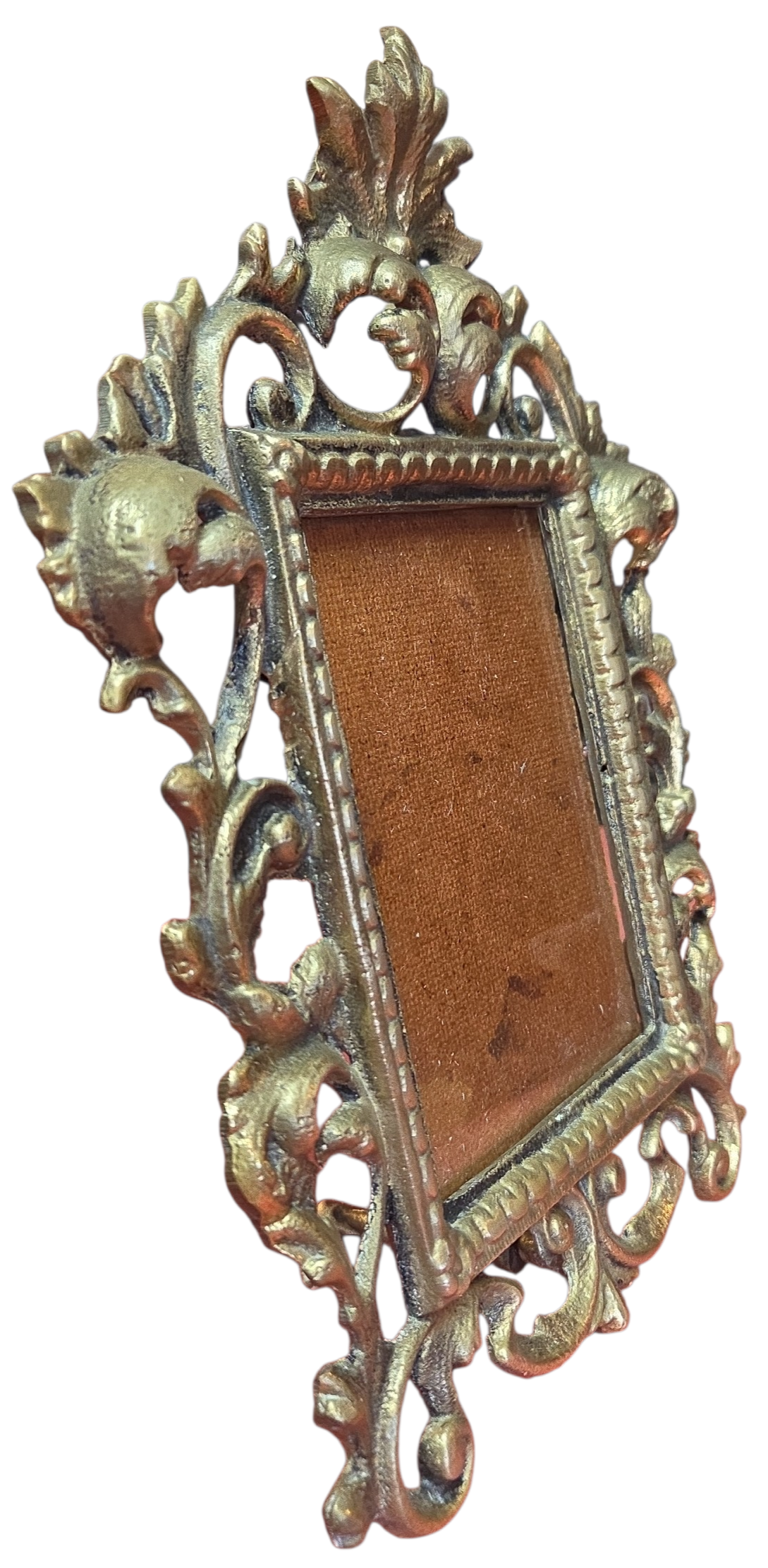 Belíssimo porta-retrato vertical confeccionado em bronze de alta qualidade. Esta peça apresenta um trabalho de fundição detalhado com ornamentos clássicos, ideal para compor decorações sofisticadas ou ambientes que prezam pelo estilo vintage.
