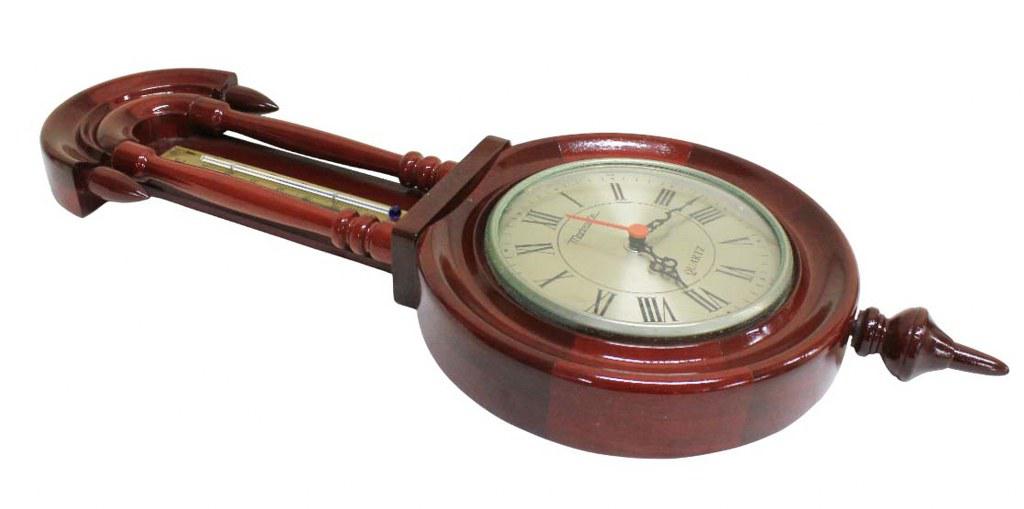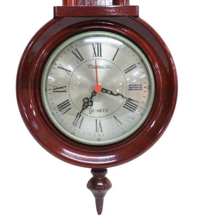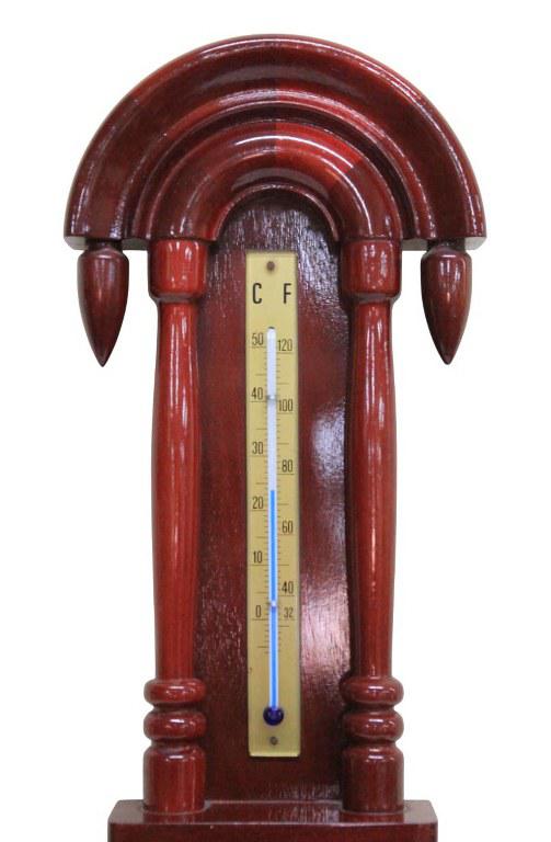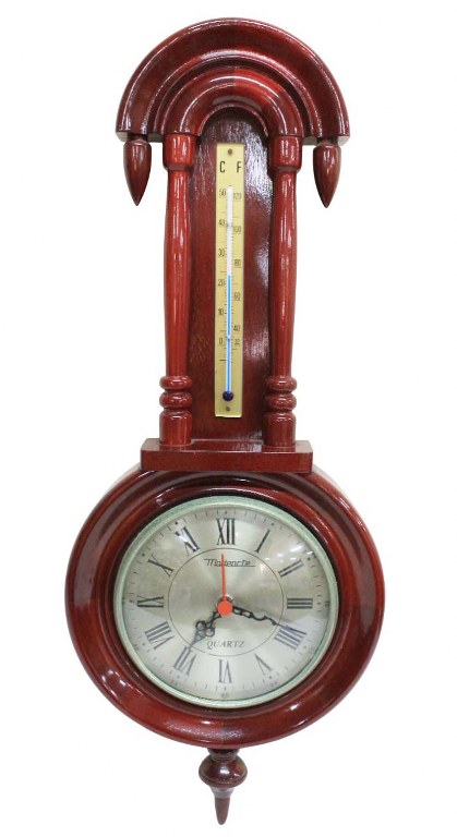Relógio de parede da manufatura MODEARTE movimentação a quartzo em caixa de madeira nobre com torneados e mostrador em metal com algarismos romanos. Apresenta termômetro na parte superior.