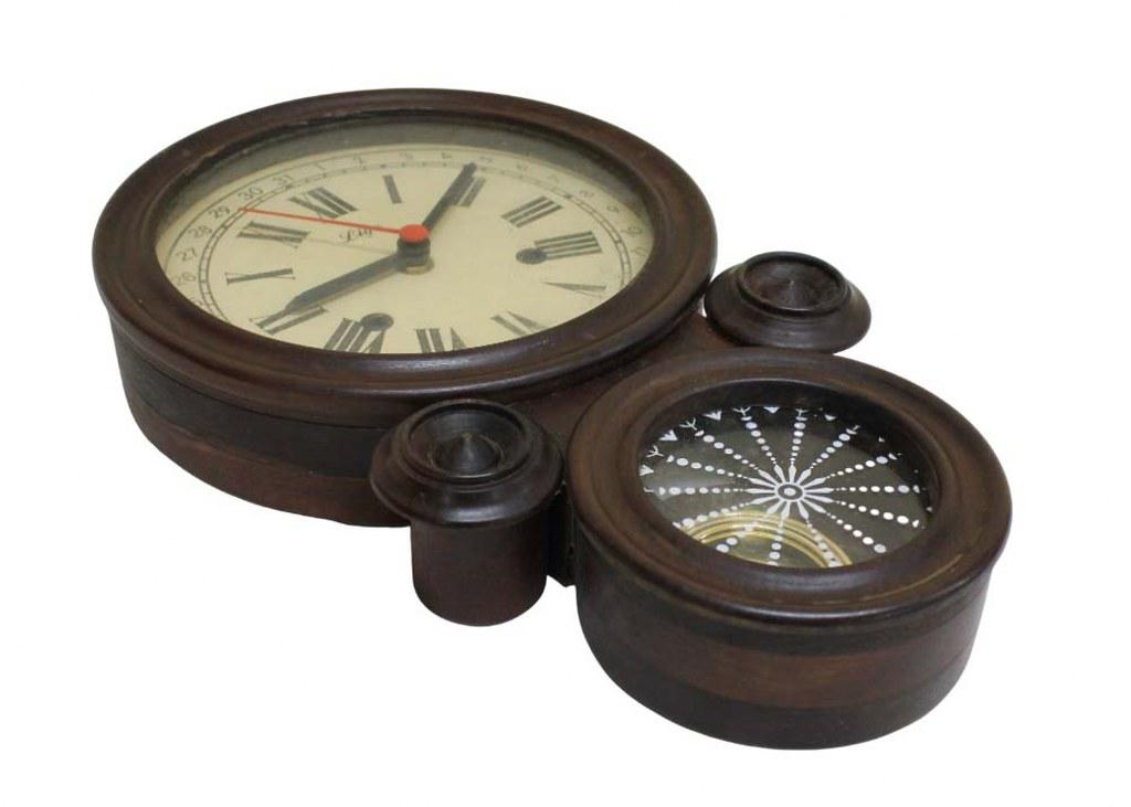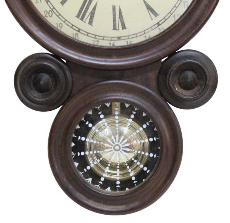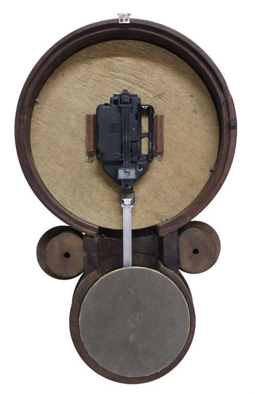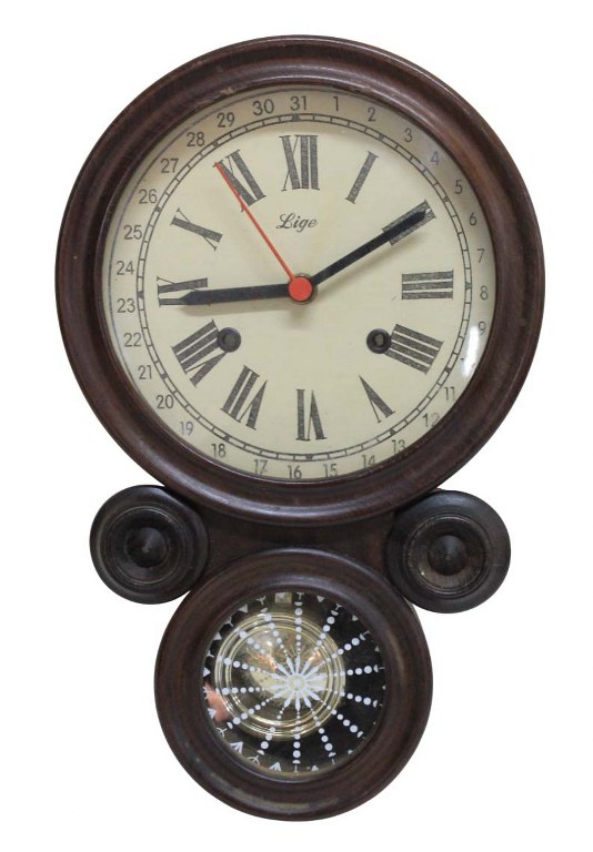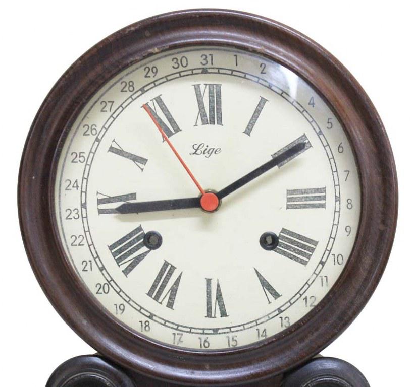 Clássico relógio oito da manufatura LIGE, em caixa de madeira nobre bem preservada, maquinário a pilha e mostrador em papel com números romanos.