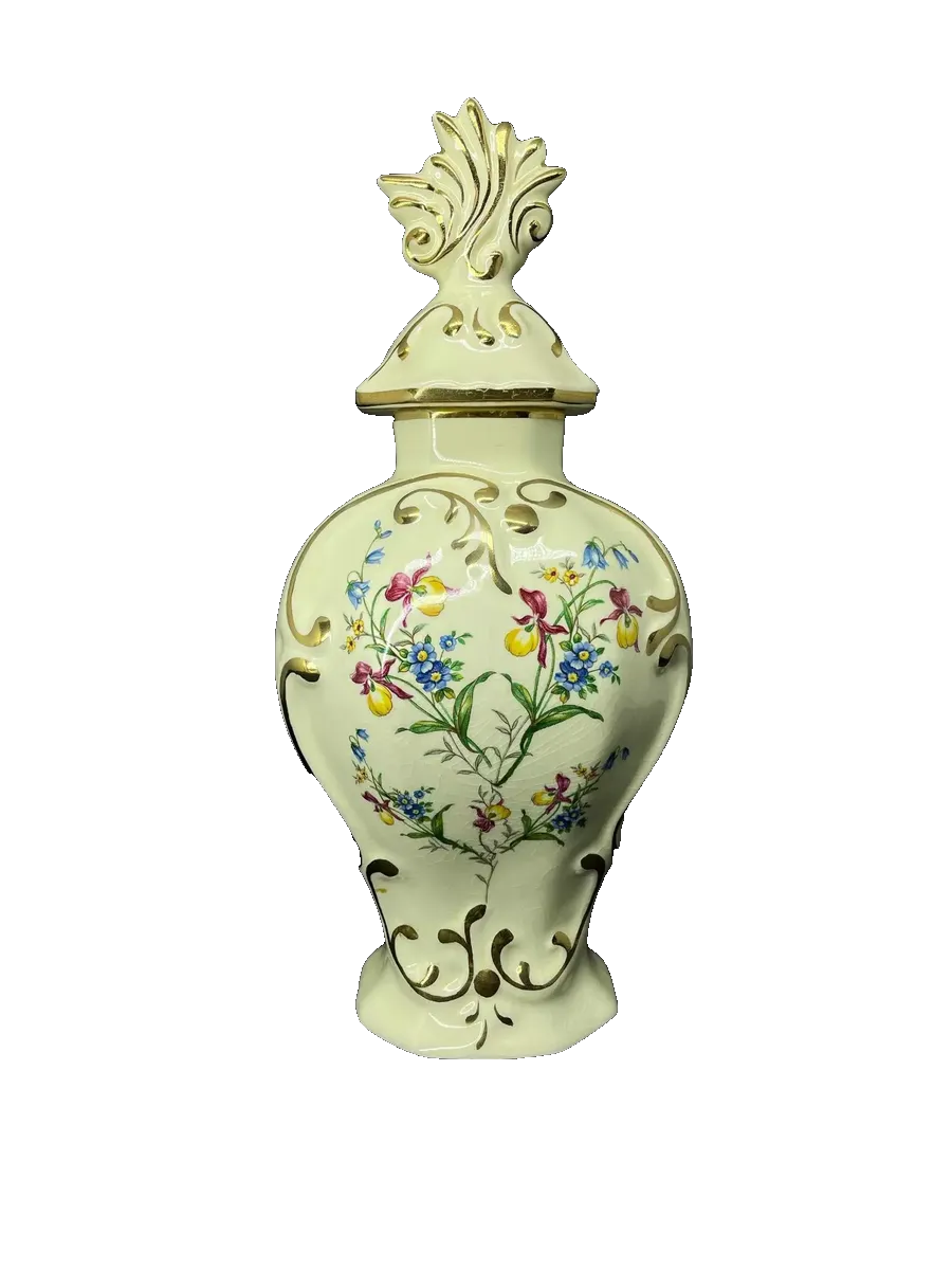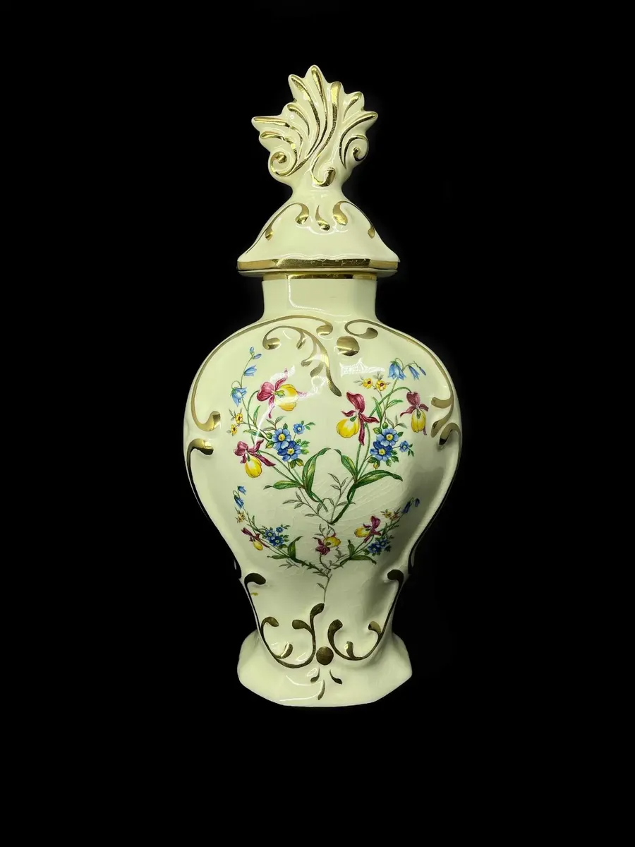 Gouda. Antigo e lindo potiche em porcelana artística holandesa. Pintada à mão, decoração floral com filetes em ouro. Meados do século XX.