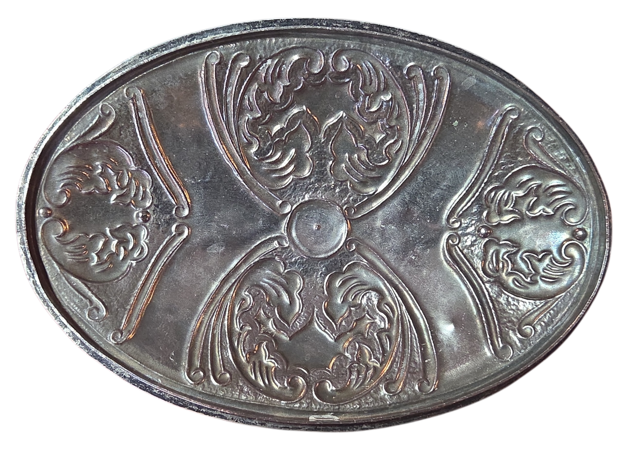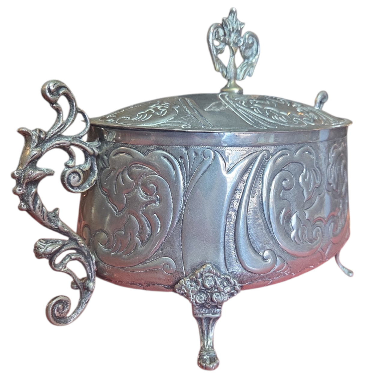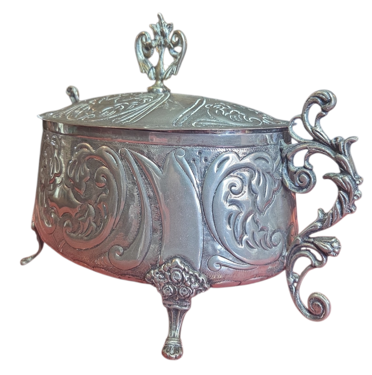 Elegante recipiente oval com tampa, ricamente adornado com motivos florais e volutas em relevo. Uma peça de destaque para colecionadores de antiguidades ou para compor uma mesa posta com sofisticação.