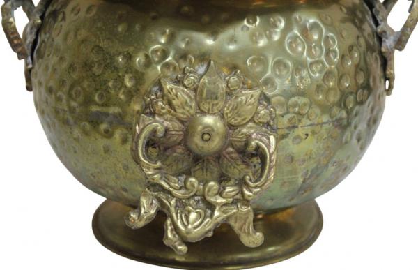 Antigo balde em metal dourado pontilhado com apliques em bronze maciço no formato de flores. Apresenta alça lisa articulada. Peça bem decorativa, pode ser usada com cachepô.