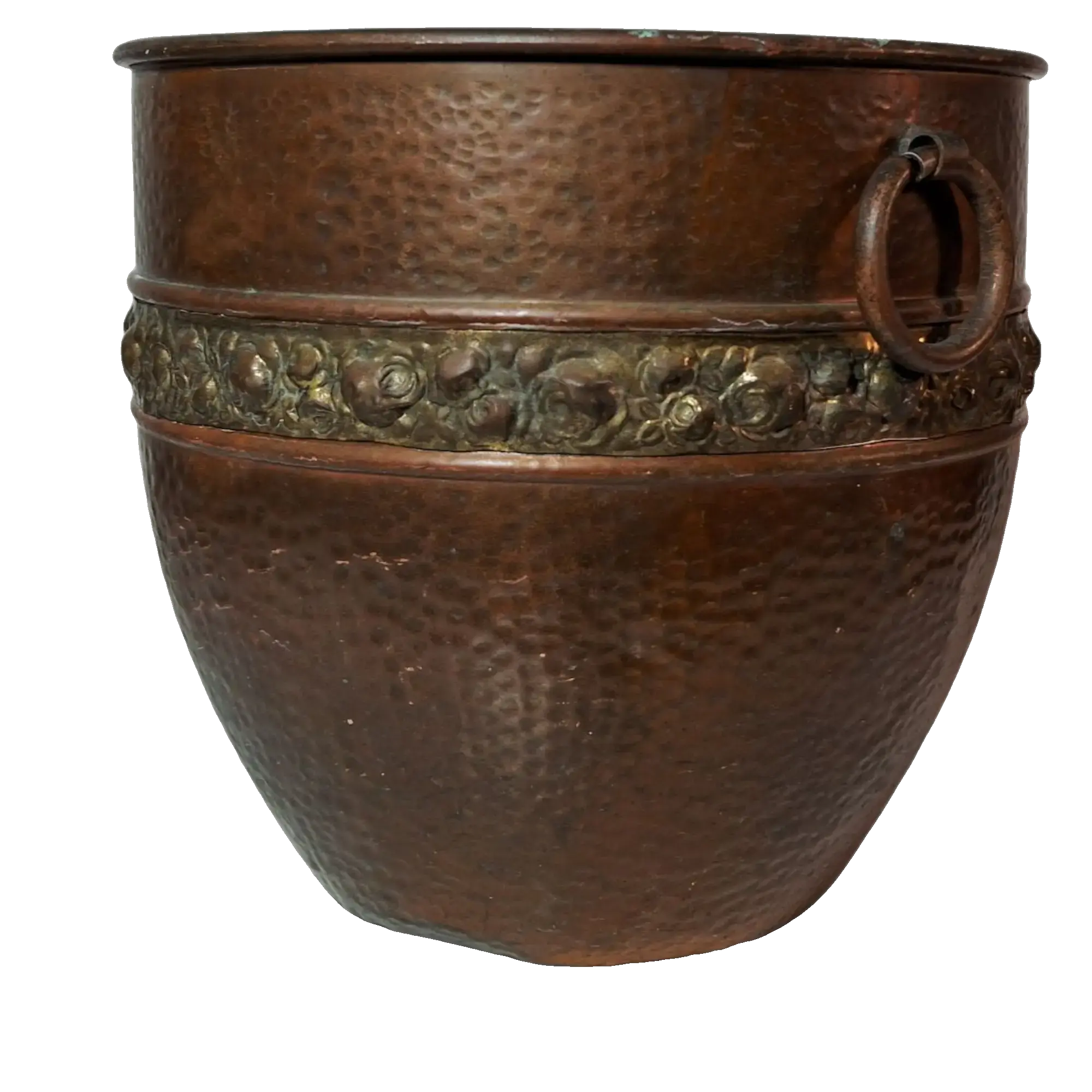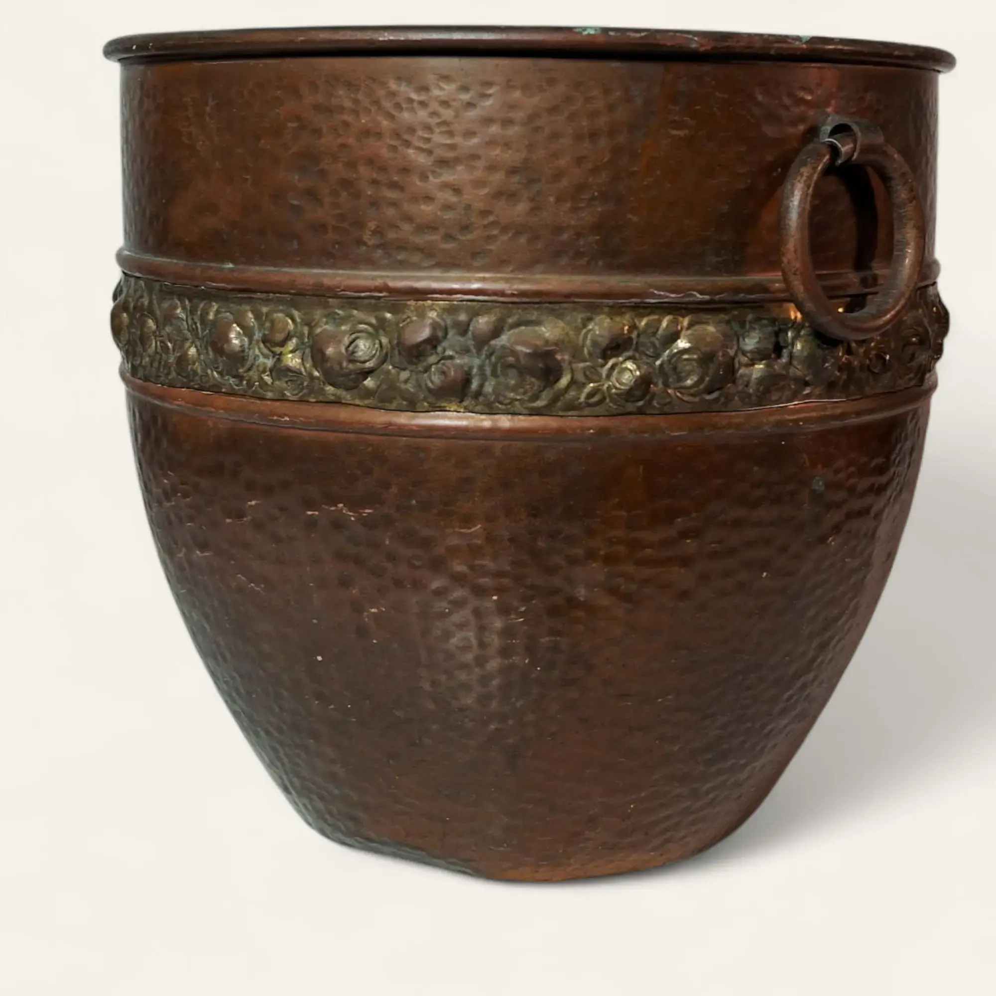 Cachepot em cobre com barra adornada com flores e argolas laterais para sustentação. Muito bem conservada. Início do séc. XX