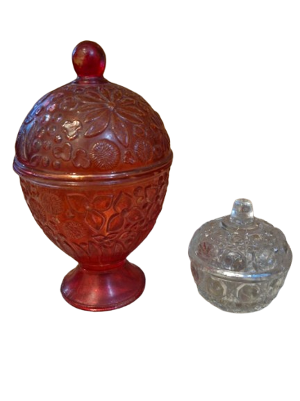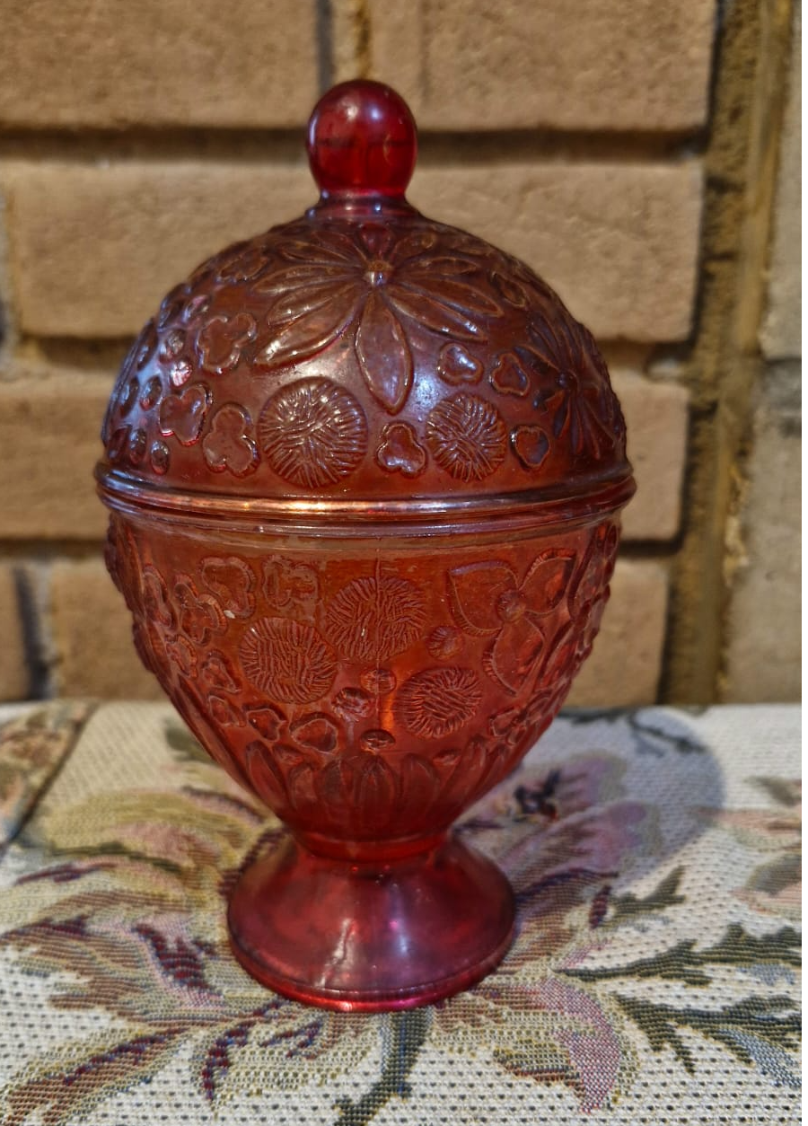 - Bombonière Avon: Feita de vidro na cor rubi com pintura e padrão em relevo, medindo aproximadamente 15 cm de altura com a tampa.
