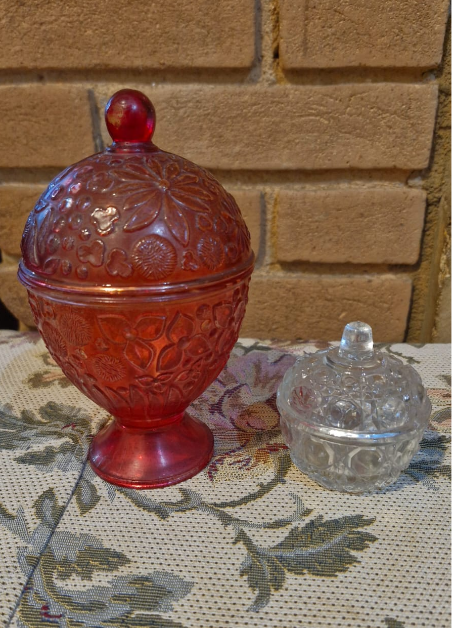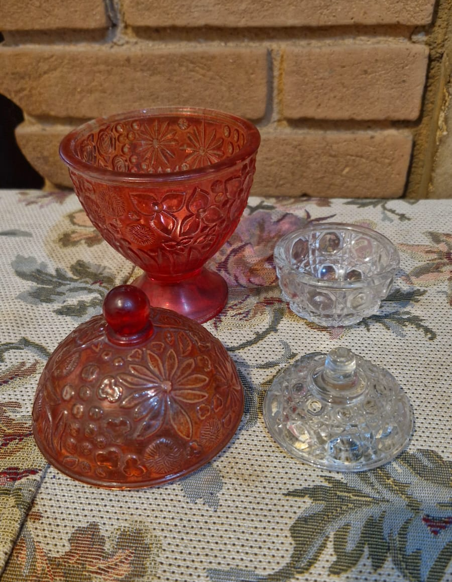 Duas belas bombonières de vidro decorativas (potes com tampa), sendo a vermelha um modelo clássico de colecionador da marca Avon.