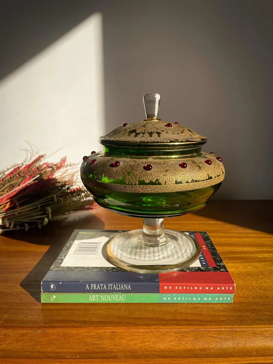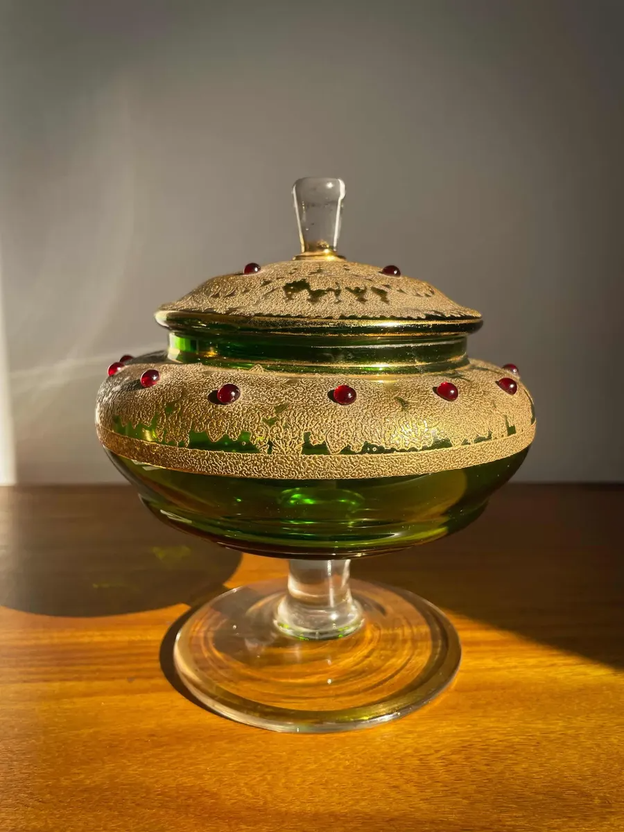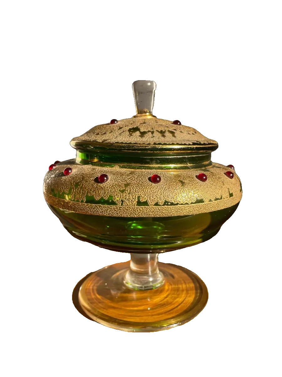 Murano Veneziano com ouro. Antiga bomboniere artística do período Vitoriano, início do século XX. Toda pintada à mão com ouro e aplicação de bolinhas de cristal vermelho rubi. Um luxo!