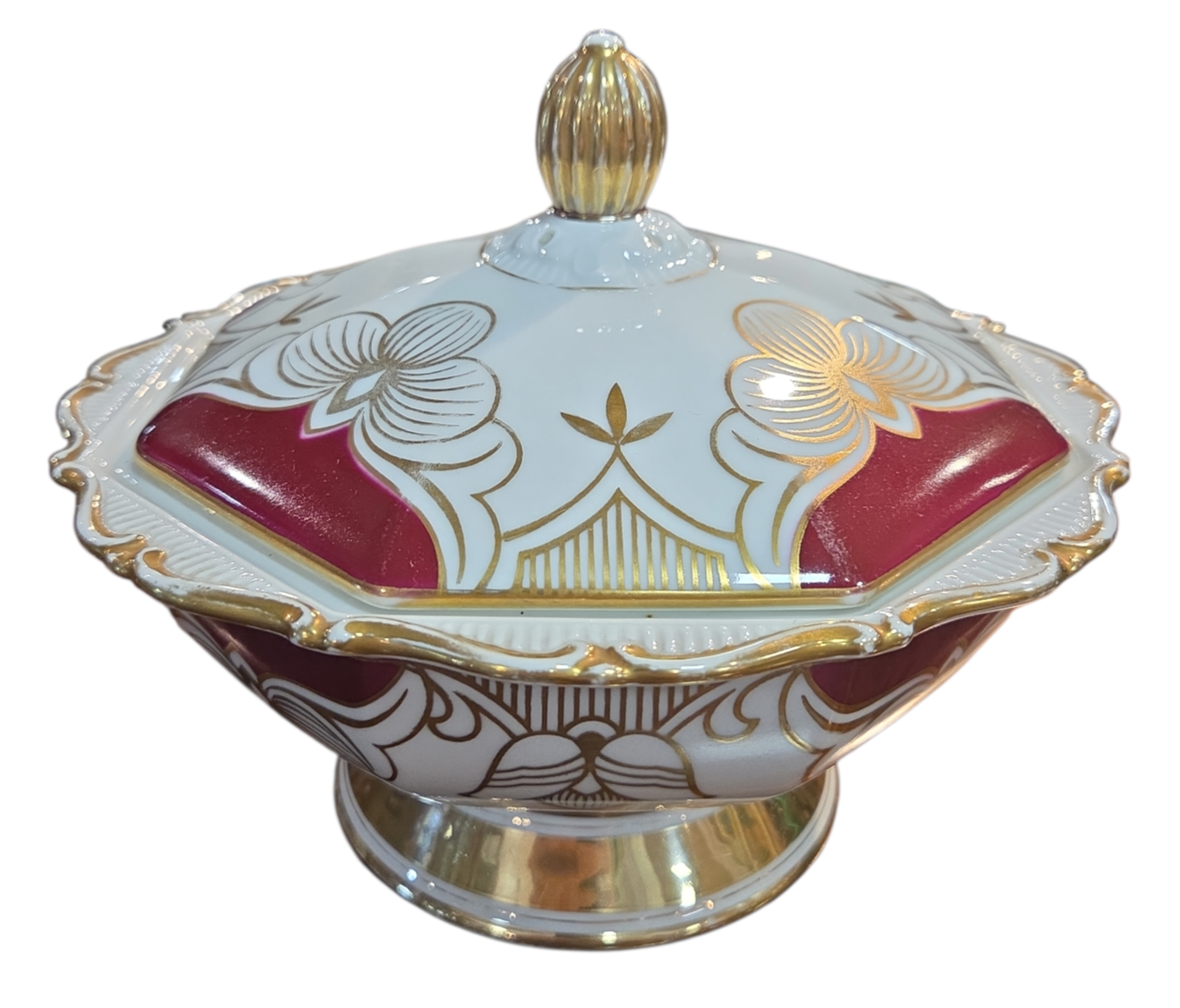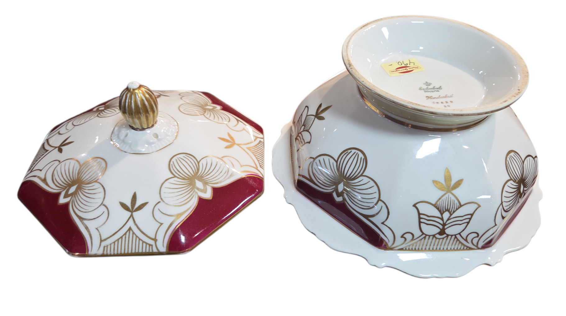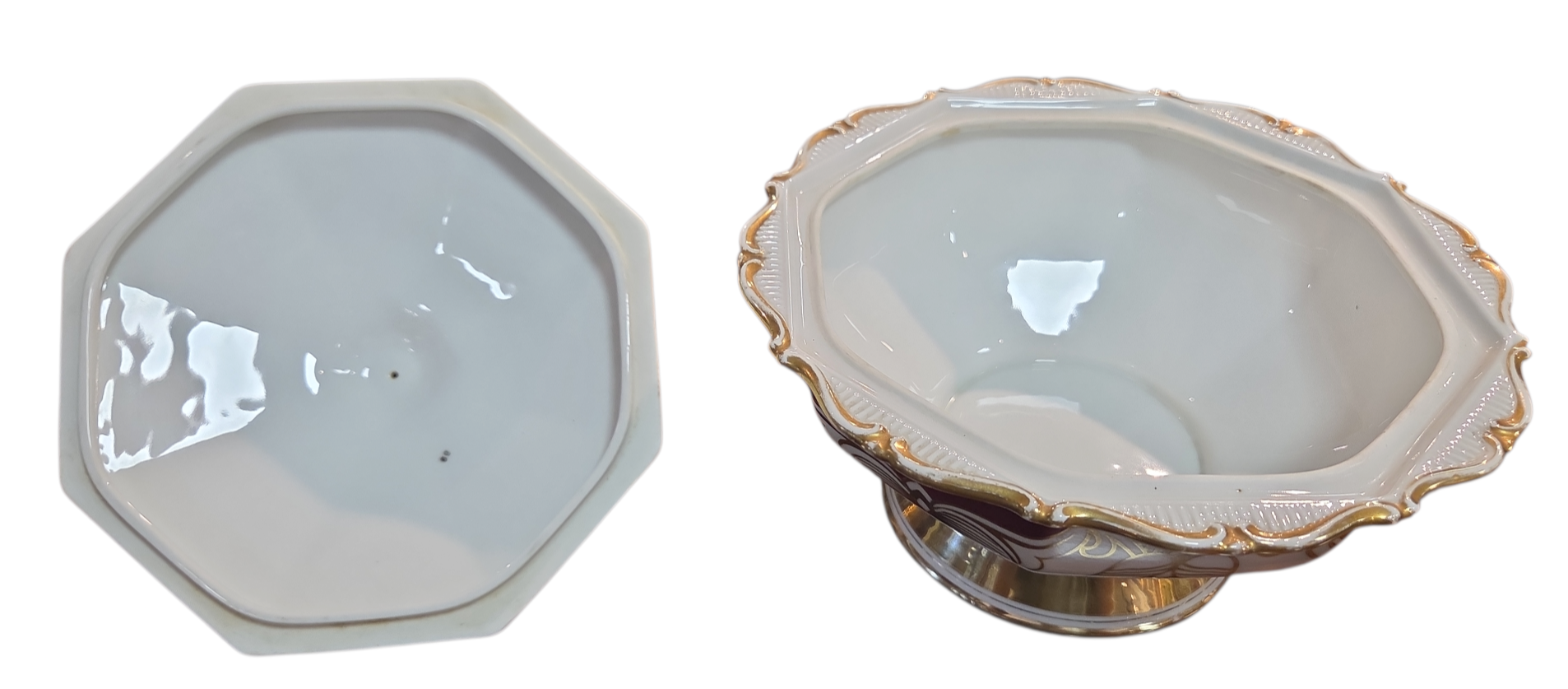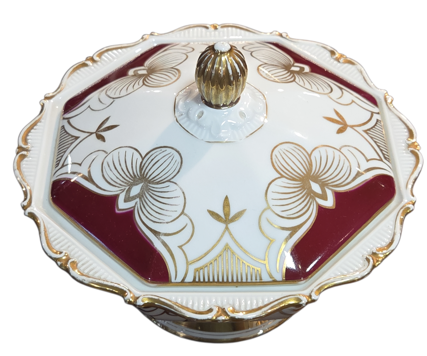 Exclusiva e sofisticada bomboniere (pote com tampa) em fina porcelana alemã Eschenbach, produzida na região da Baviera. Esta peça é um exemplar de luxo, destacando-se pelo acabamento artesanal e pelo design geométrico oitavado de rara beleza.