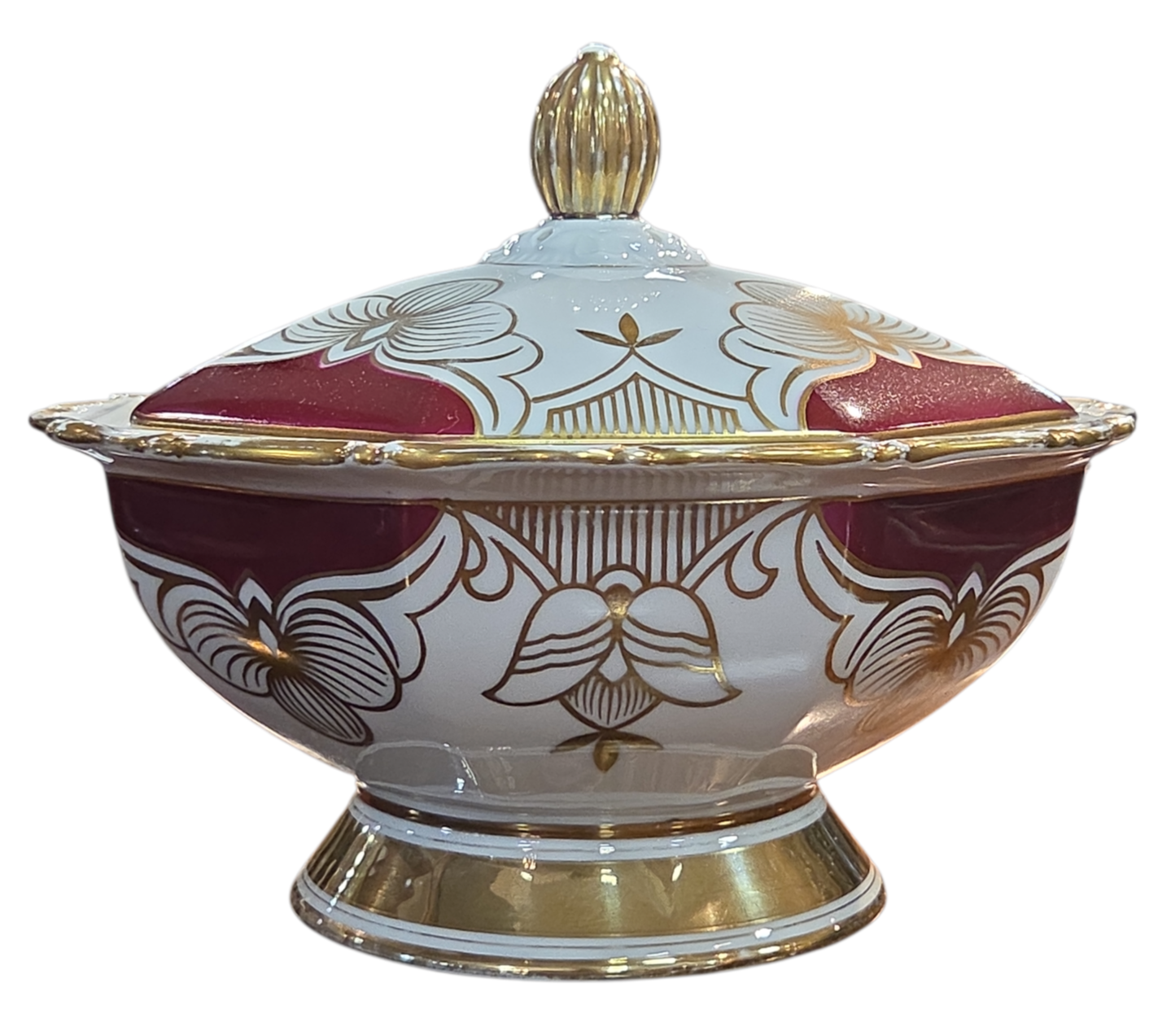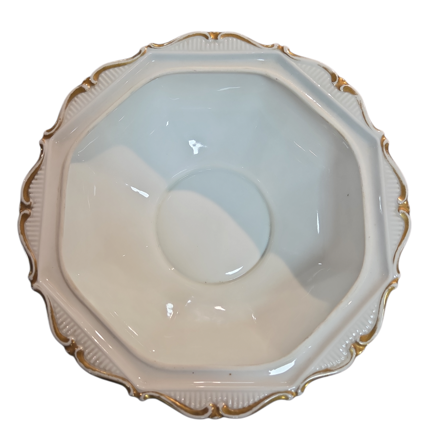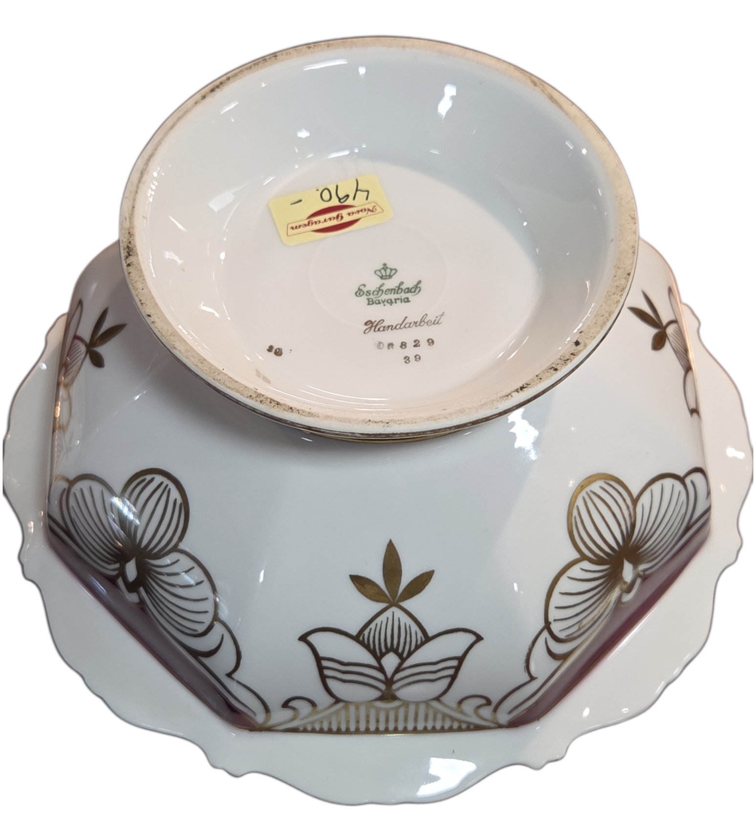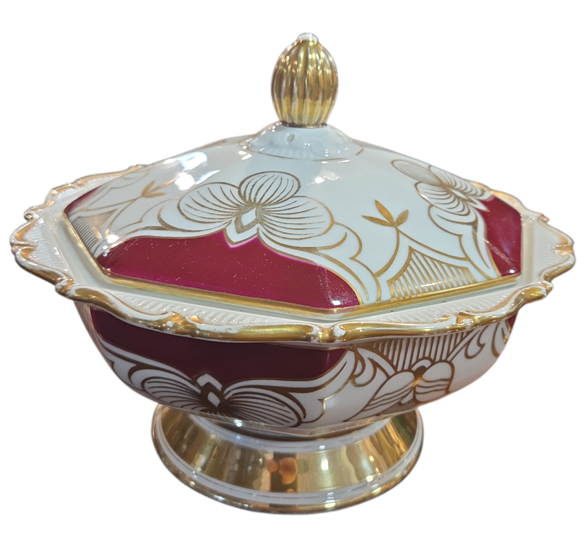 Exclusiva e sofisticada bomboniere (pote com tampa) em fina porcelana alemã Eschenbach, produzida na região da Baviera. Esta peça é um exemplar de luxo, destacando-se pelo acabamento artesanal e pelo design geométrico oitavado de rara beleza.