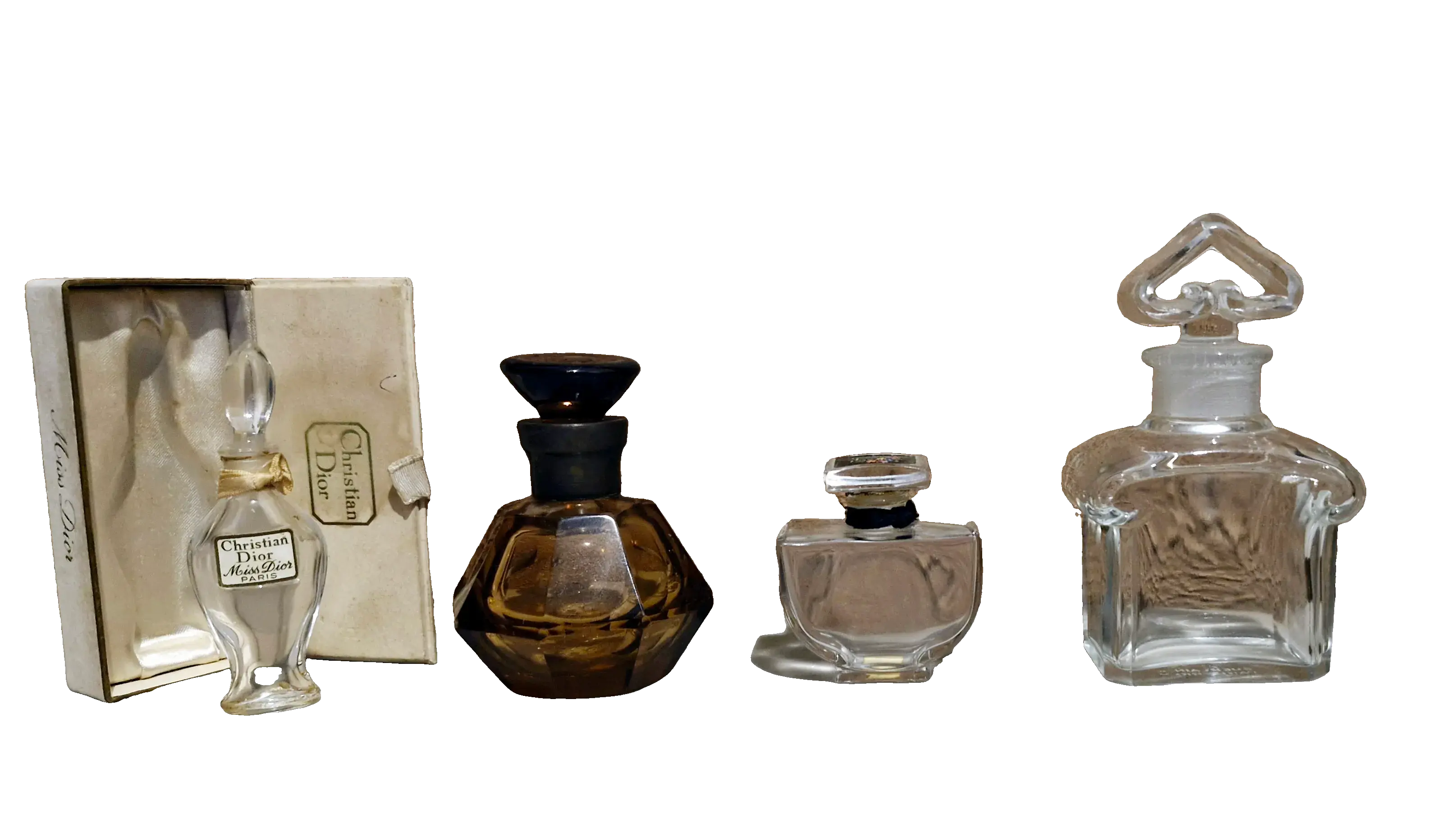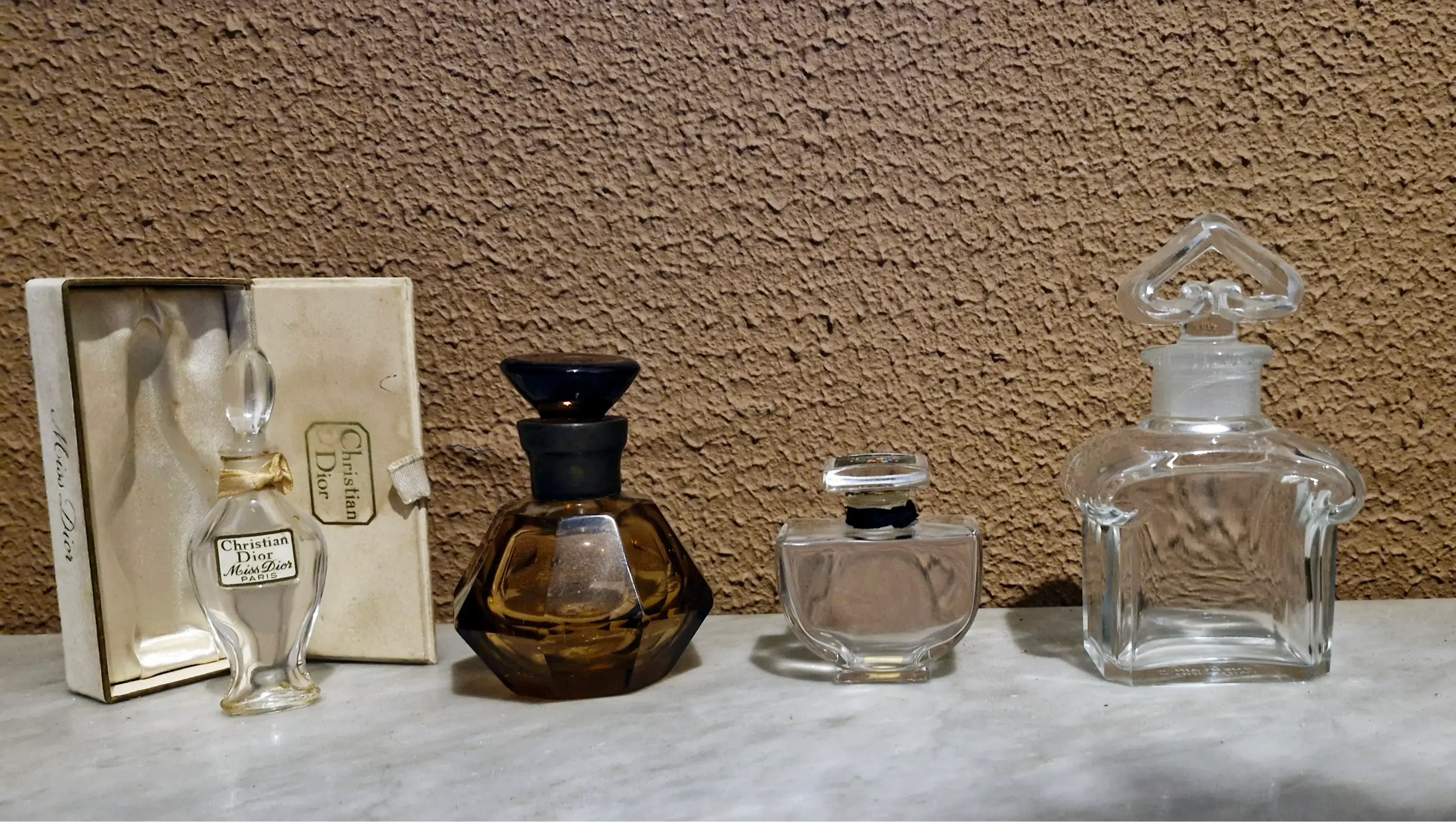 Belíssima coleção de frascos de perfumes franceses (vazios). Sendo 4 de vidro transparente e 1 de cristal âmbar. Marca CHRISTIAN DIOR, CARON PARIS, GUERLAND PARIS. Em média 12,5cm altura. Um deles acompanha caixa original (Christian Dior).