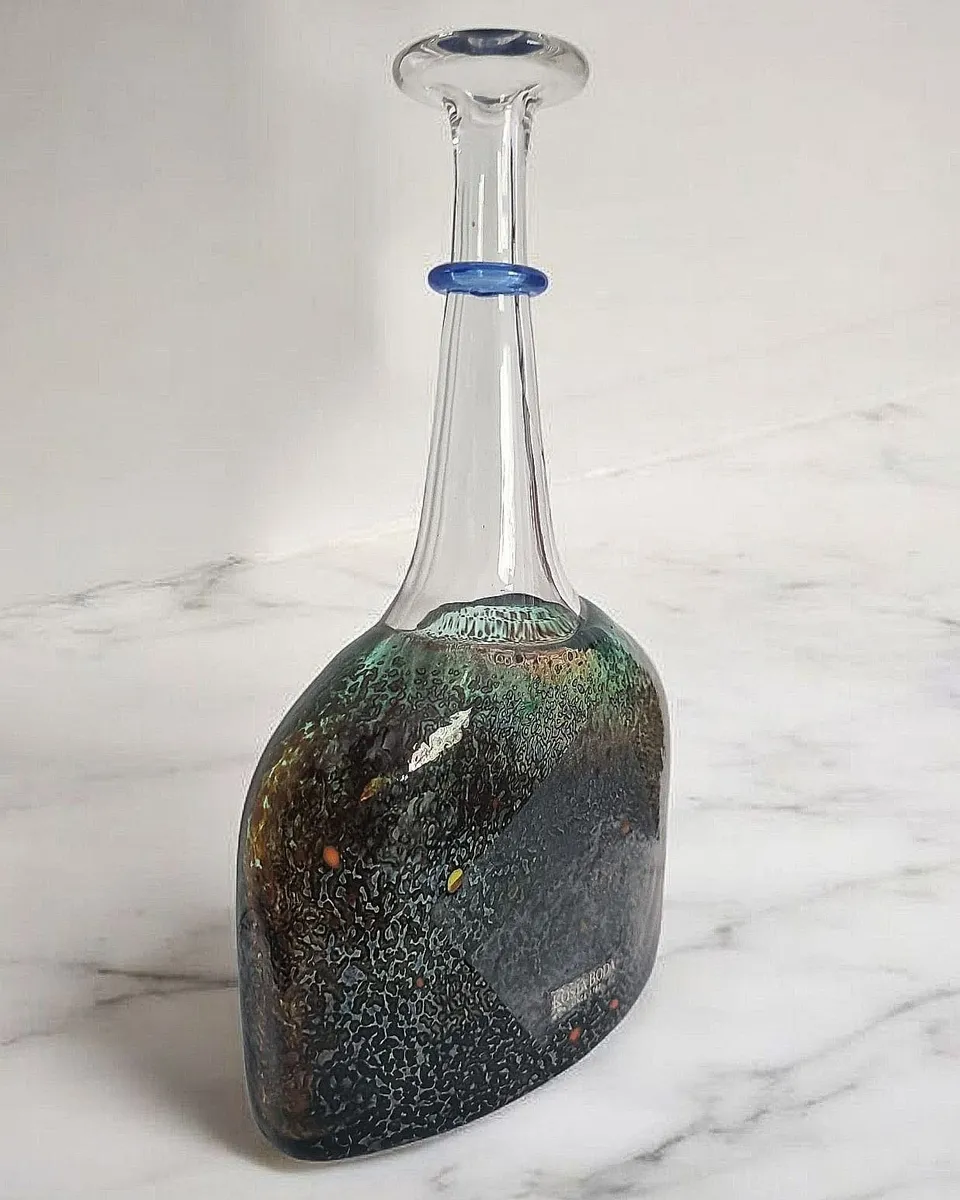 A garrafa "Satellite" de Bertil Vallien para a Kosta Boda é mais do que um simples objeto utilitário; é uma peça de arte em vidro, um testemunho da maestria de um dos maiores designers suecos e da tradição de excelência da Kosta Boda. Criada em 1992, a série "Satellite" destaca-se pelas cores vibrantes e padrões orgânicos, conferindo a cada garrafa uma identidade única e expressiva.