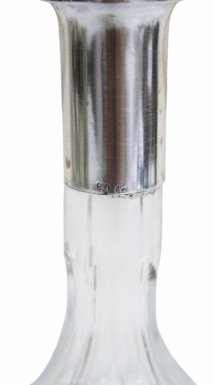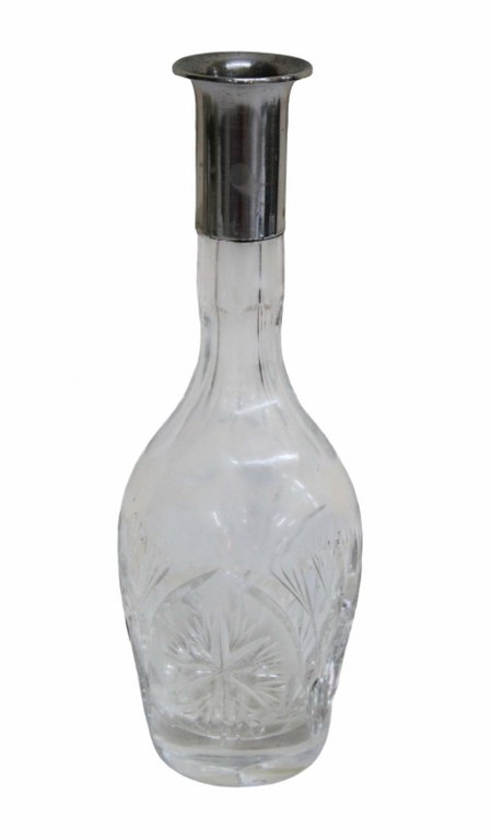Delicada licoreira de cristal translúcido, ricamente lapidado. Gargalo em prata de lei contrastado 800. Perdeu-se a tampa, infelizmente.