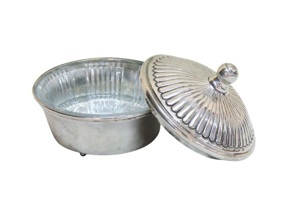 Delicada manteigueira redonda em metal espessurado a prata, apresenta assente em tripé e tampa filetada em alto relevo com pega em formato de bola, parte interna com suporte em vidro.