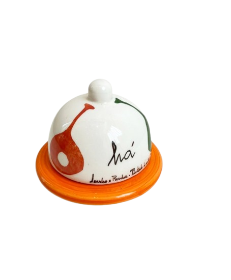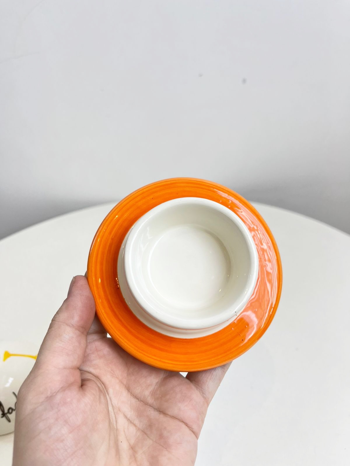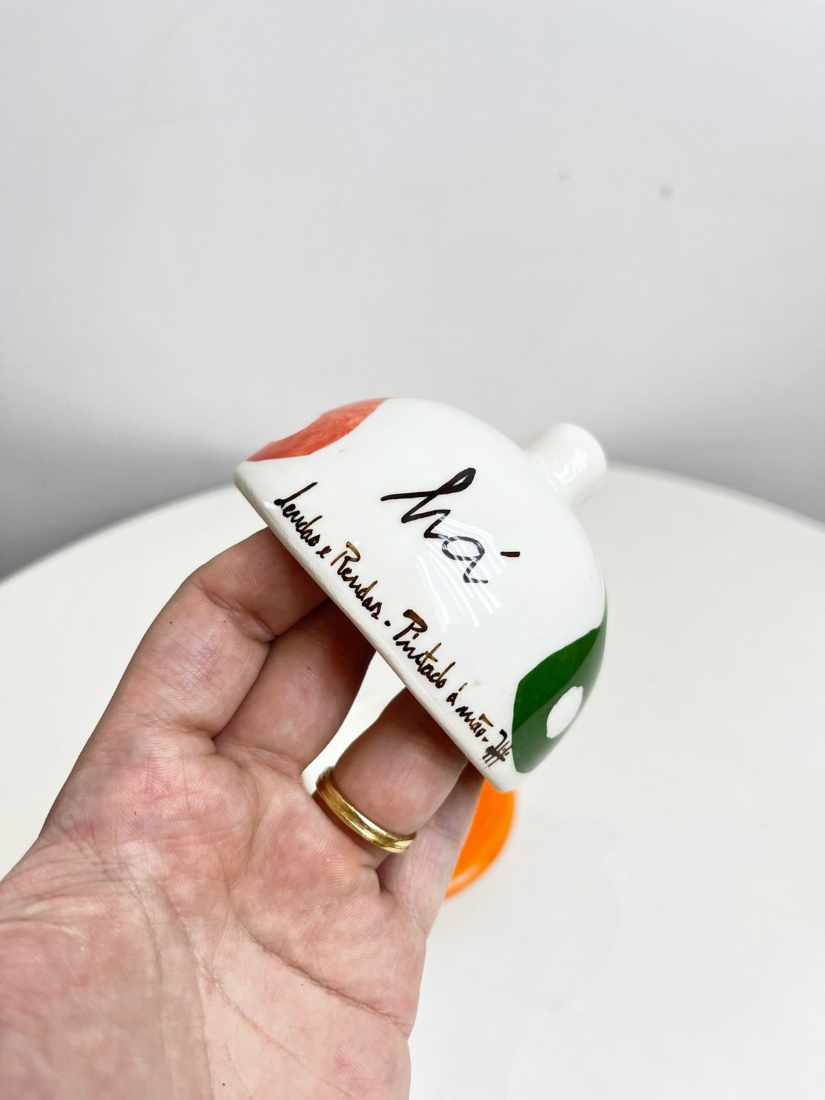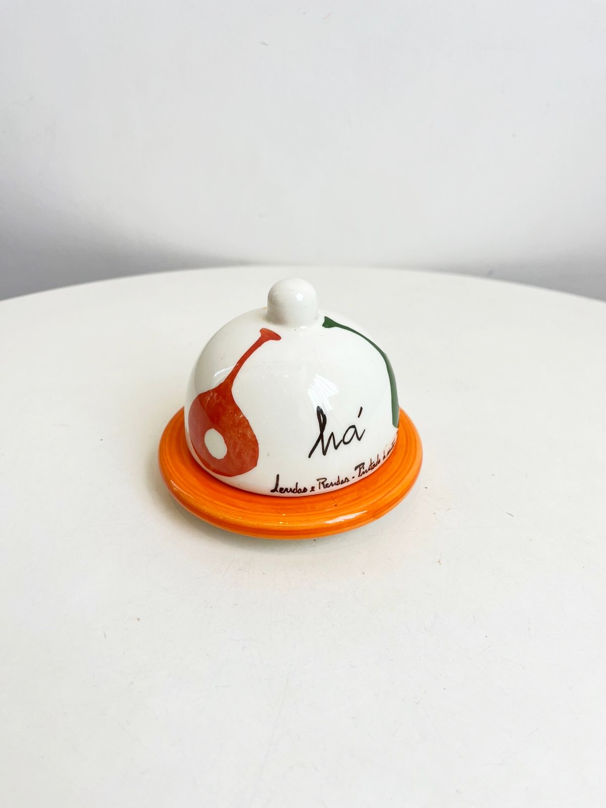 Pequena manteigueira ou porta geleia em porcelana pintada a mão. Assinada. Leves marcas do tempo e uso.