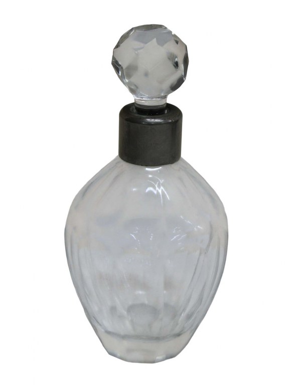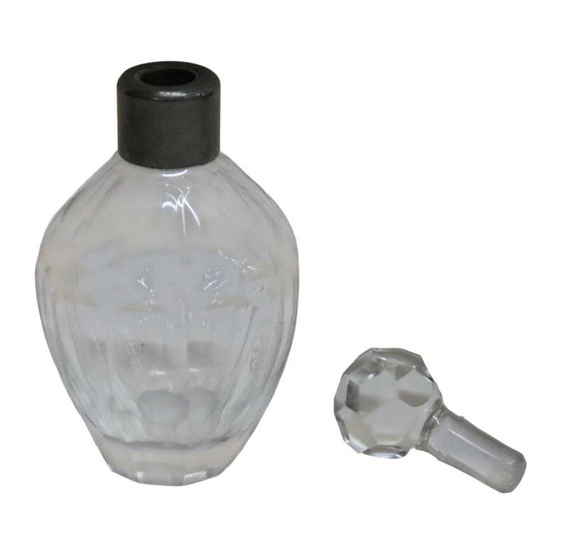 Delicado perfumeiro antigo, em cristal translúcido com lapidações facetadas e gargalo em metal prateado. Tampa também com lapidação facetada em forma de bola e mínimo bicado interno.