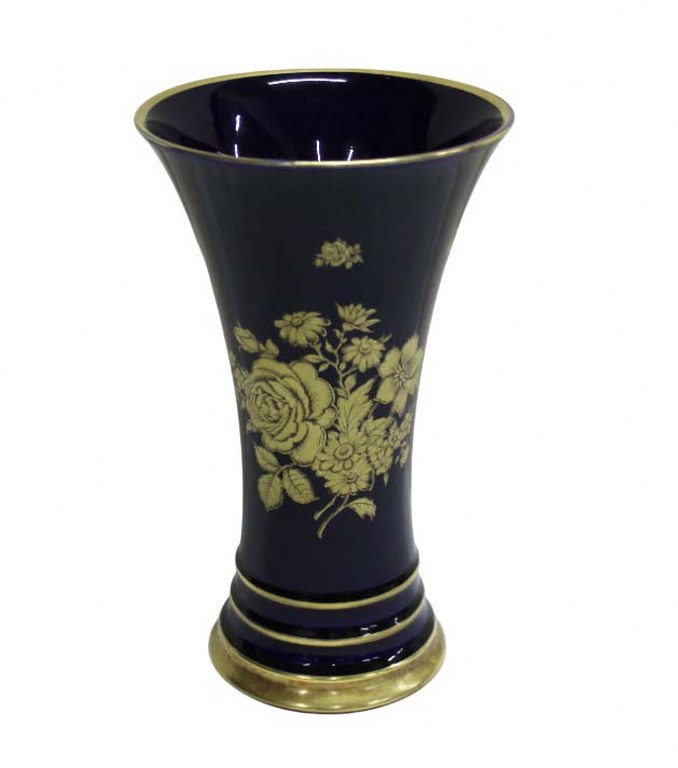 Antigo vaso cônico em azul cobalto, com decoração de flores e farta douração. Base com frisos dourados . Da manufatura BAVARIA - ECHT KOBALT conforme descrição na base. Medidas 24A X 15D da boca. Em bom estado.